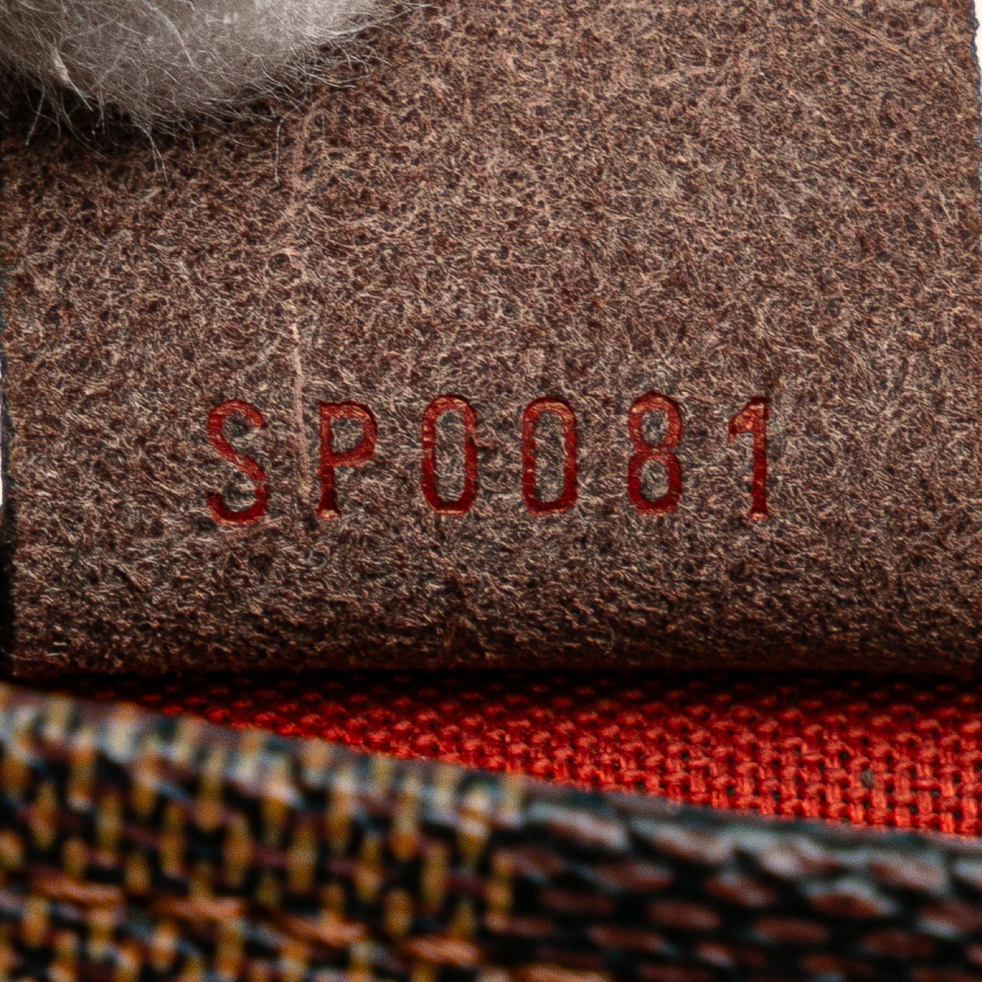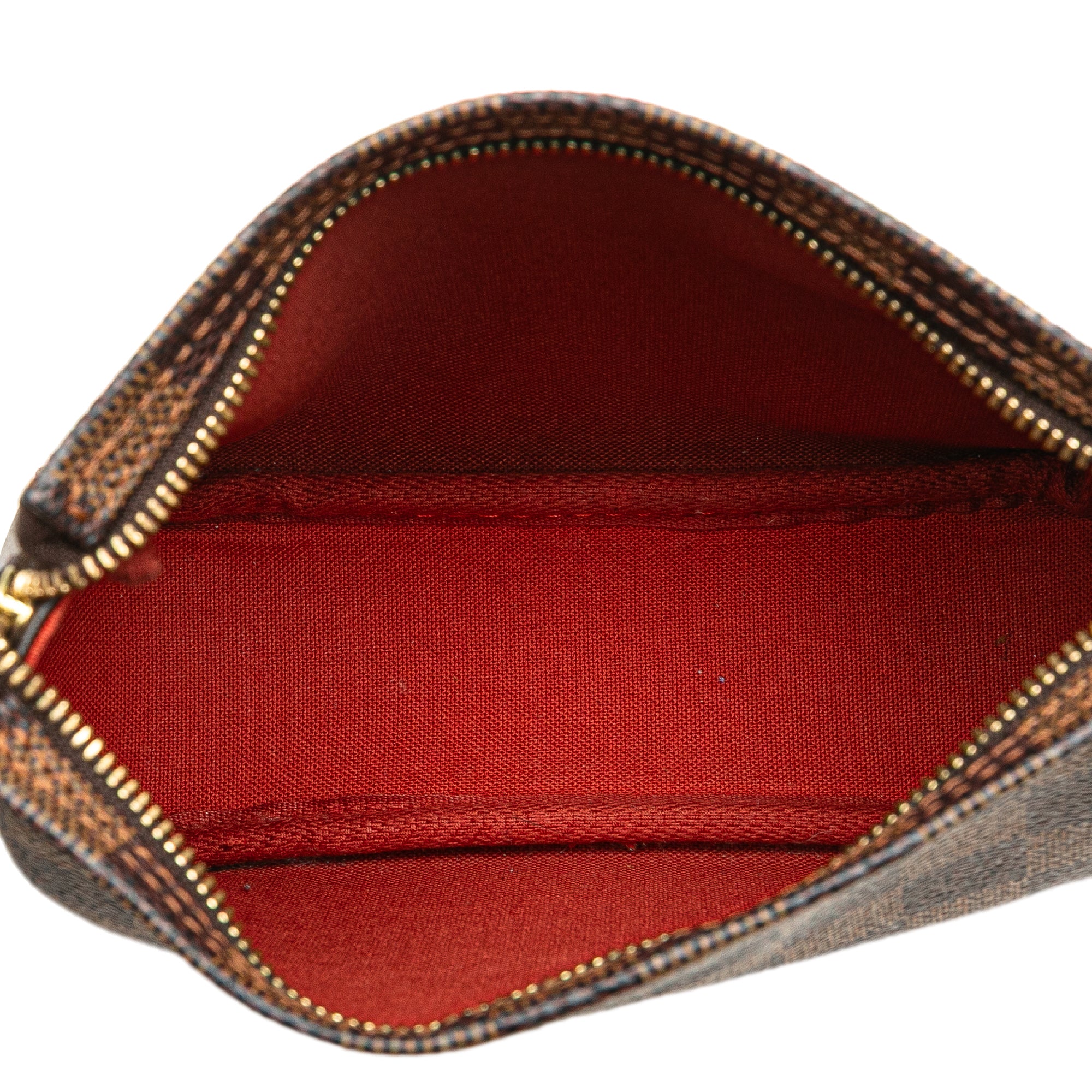 The Trousse Pochette features a damier canvas body, a flat leather strap, and a top zip closure. Retail Price: 900.00
