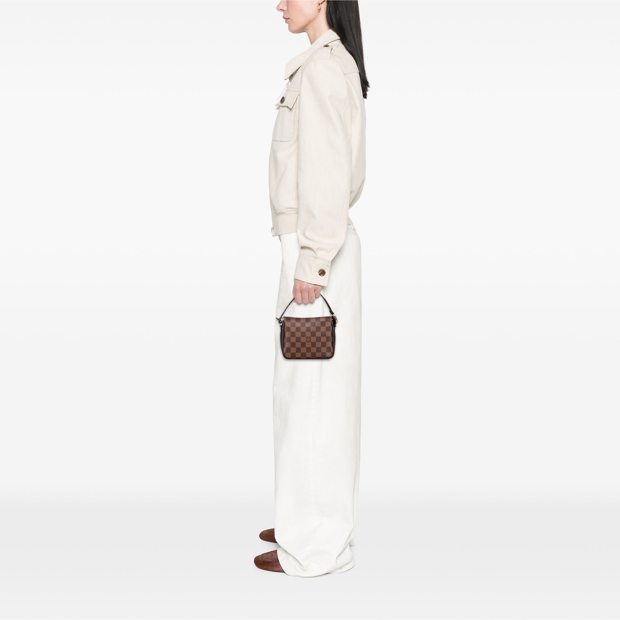 The Trousse Pochette features a damier canvas body, a flat leather strap, and a top zip closure. Retail Price: 900.00