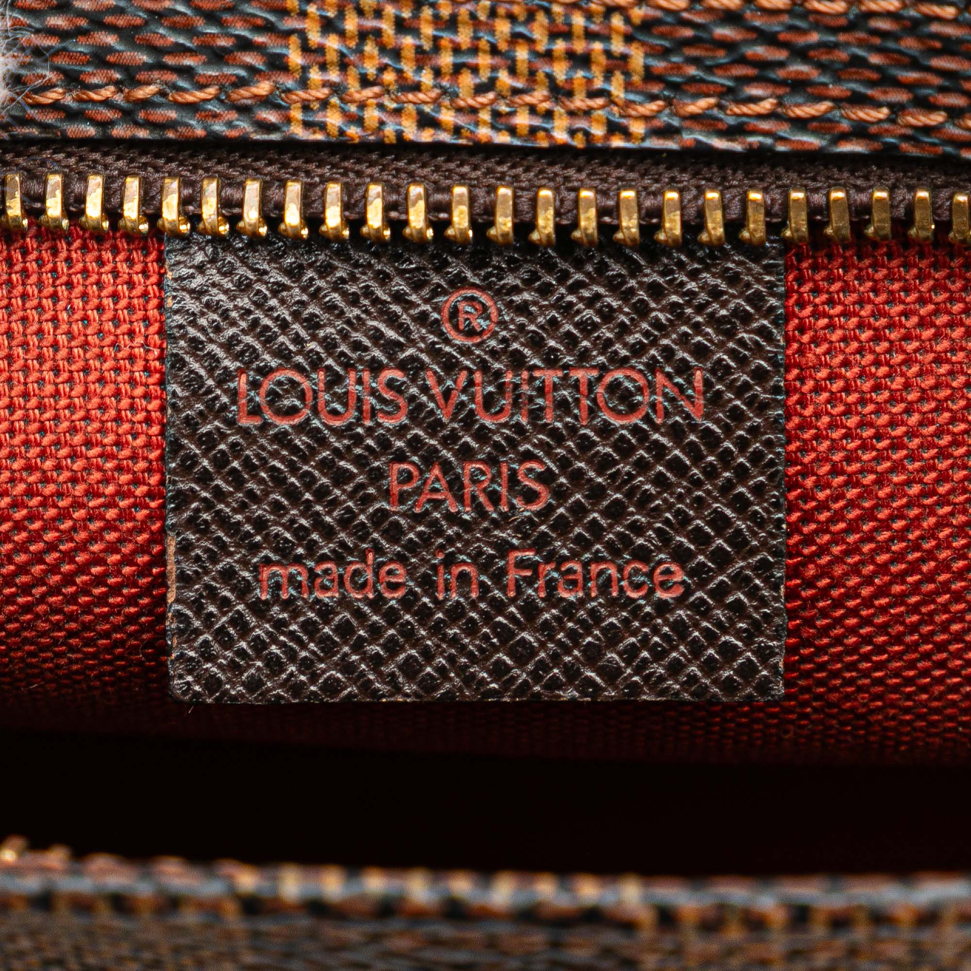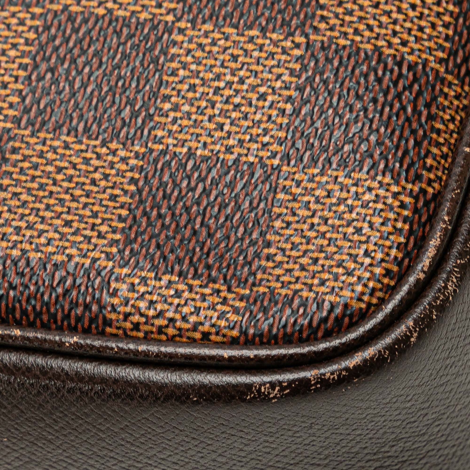 The Trousse Pochette features a damier ebene canvas body with leather trim, a flat leather strap, and a top zip closure. Retail Price: 900.00