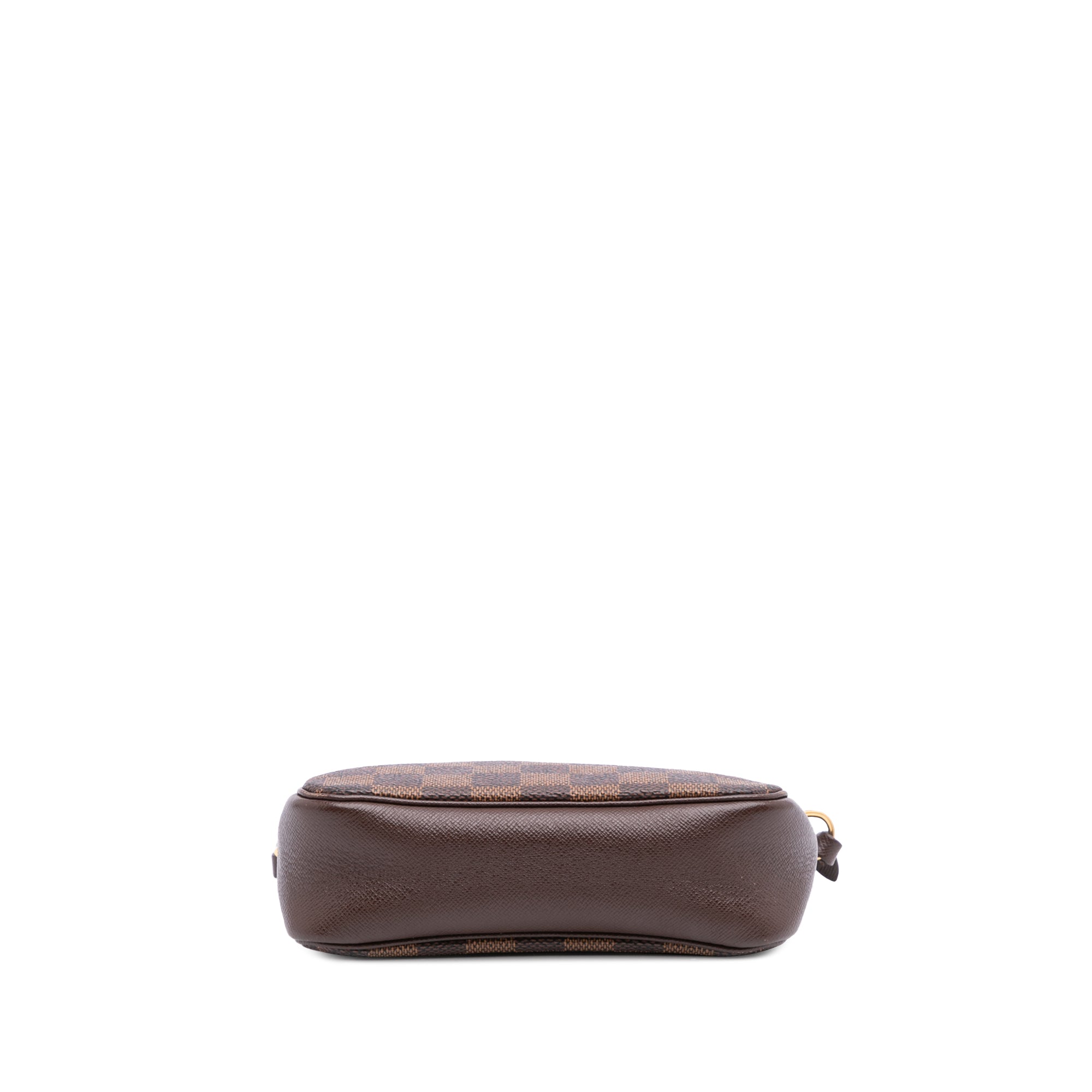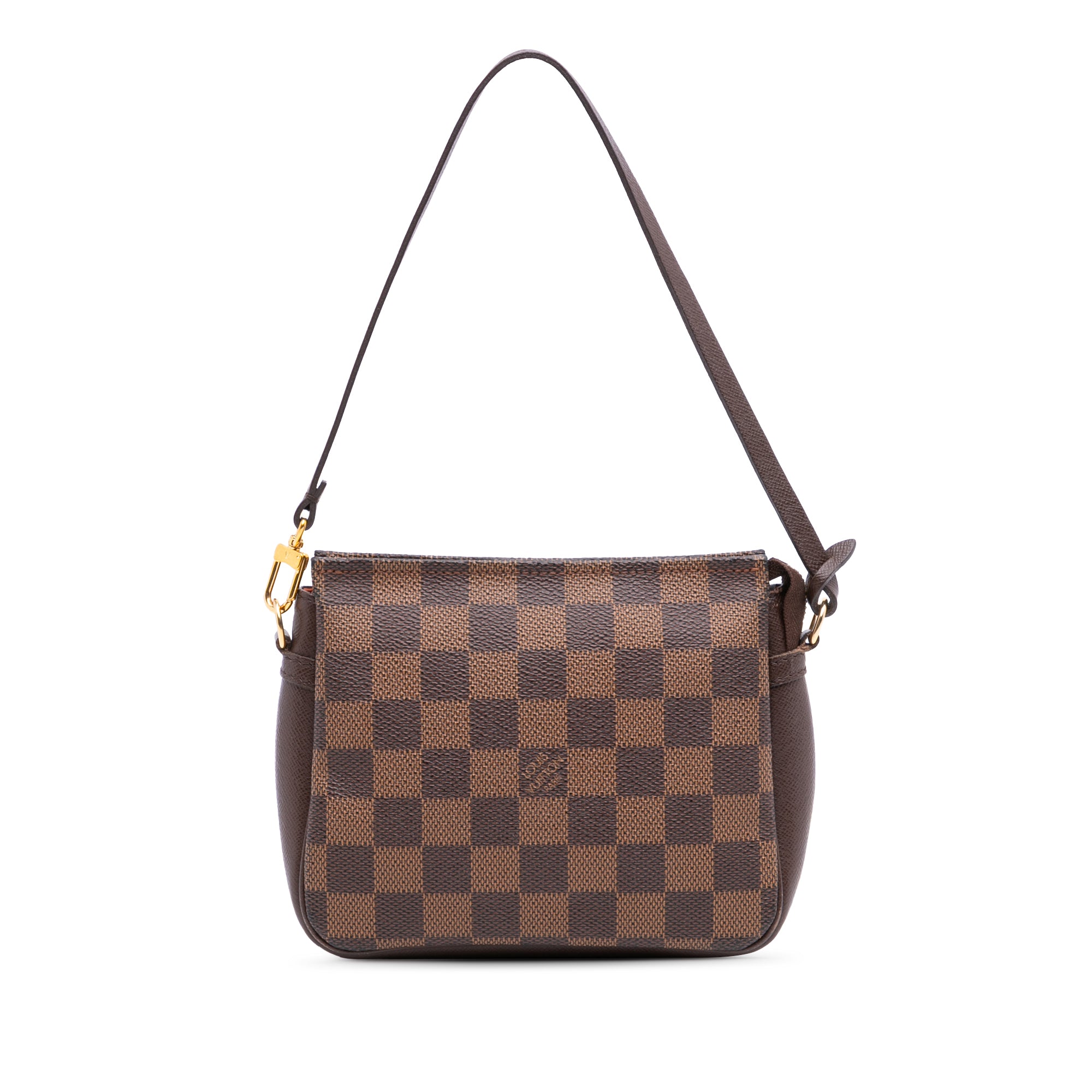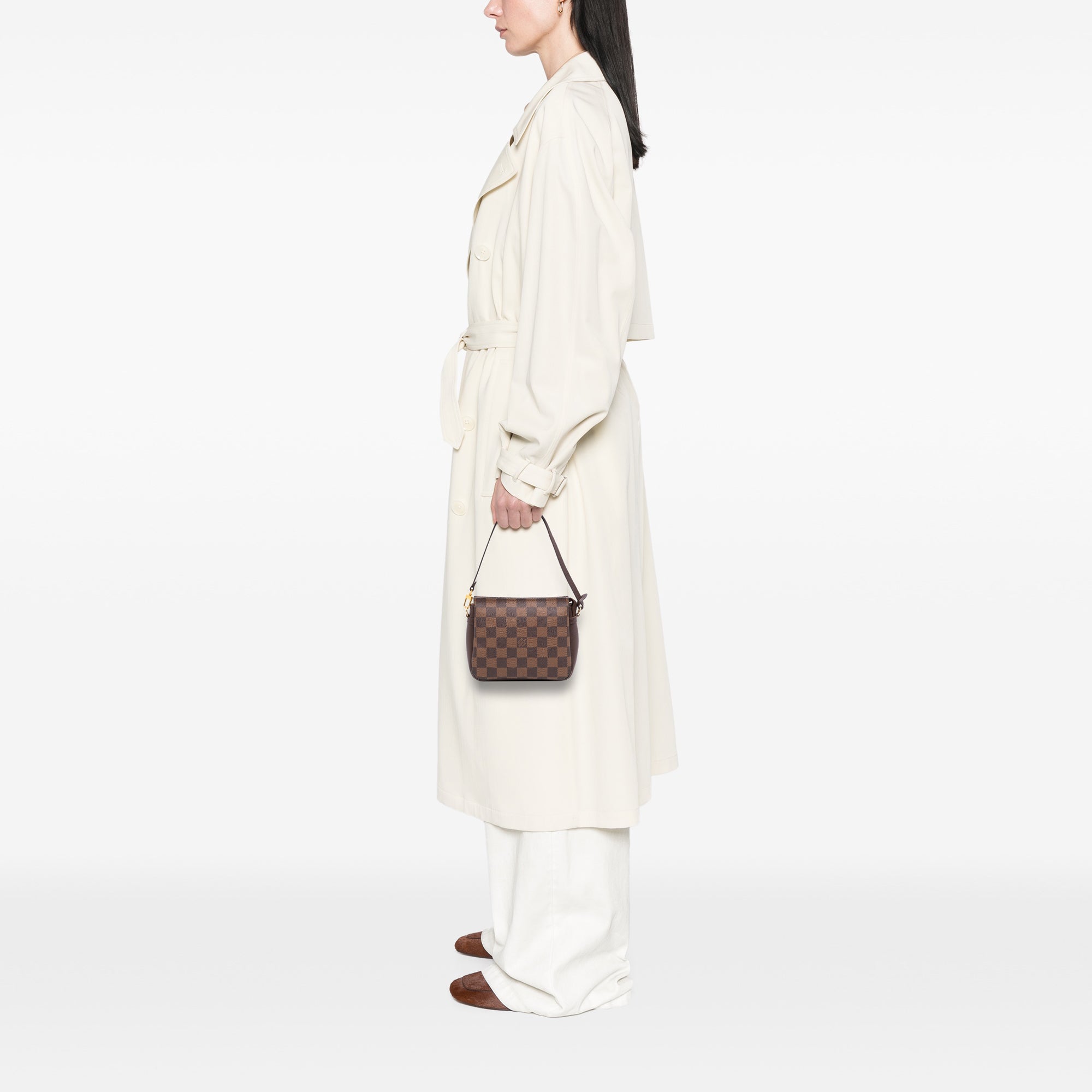 The Trousse Pochette features a damier canvas body with leather trim, a detachable flat leather strap, and a top zip closure. Retail Price: 900.00