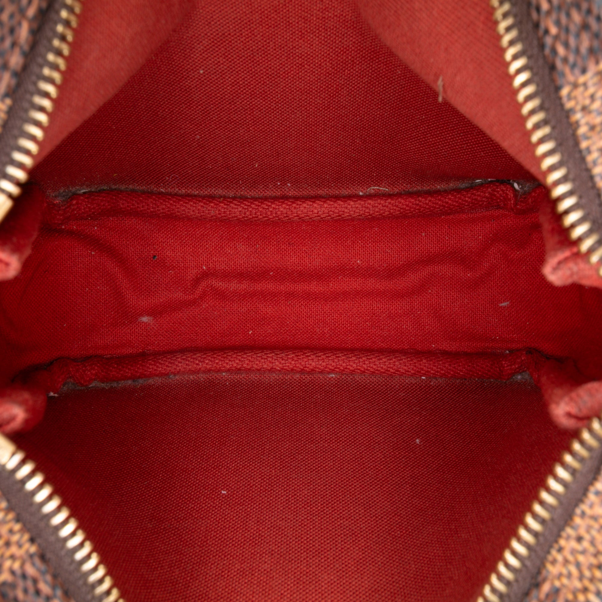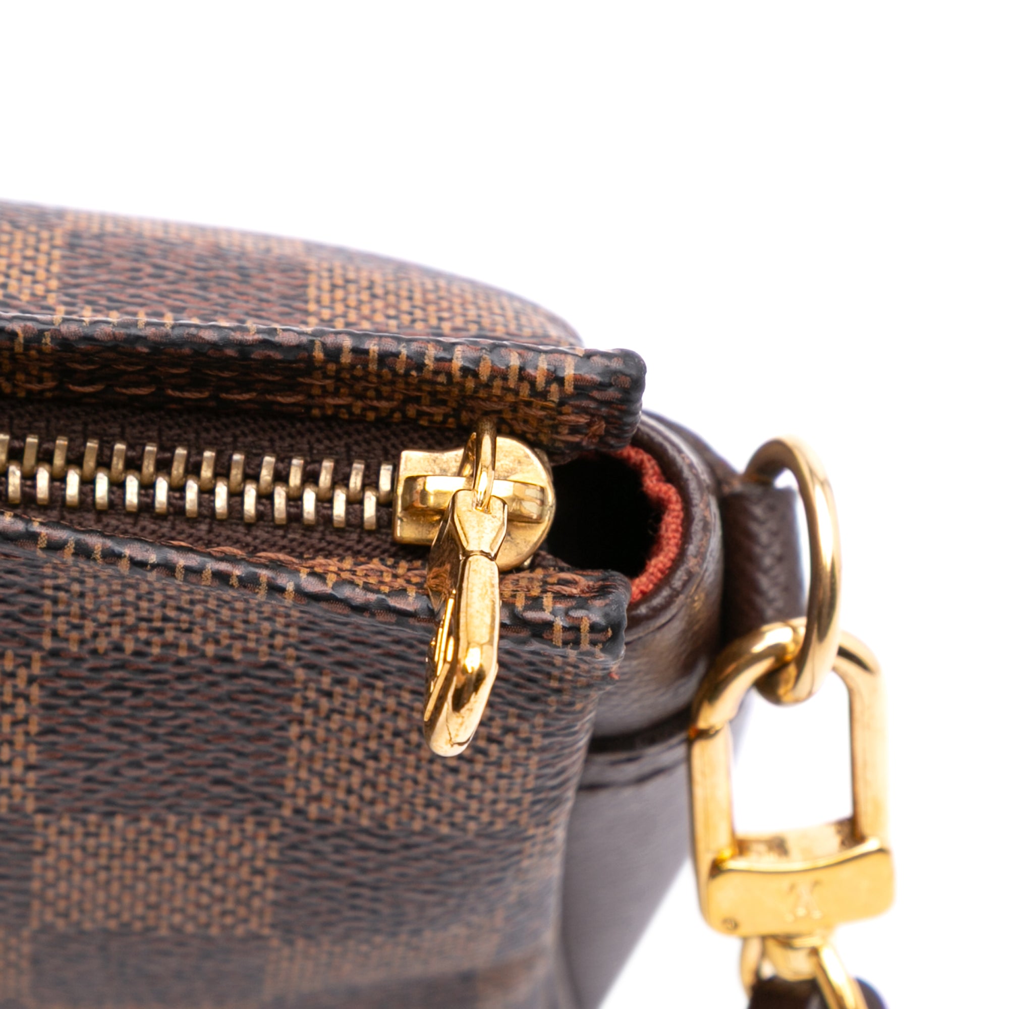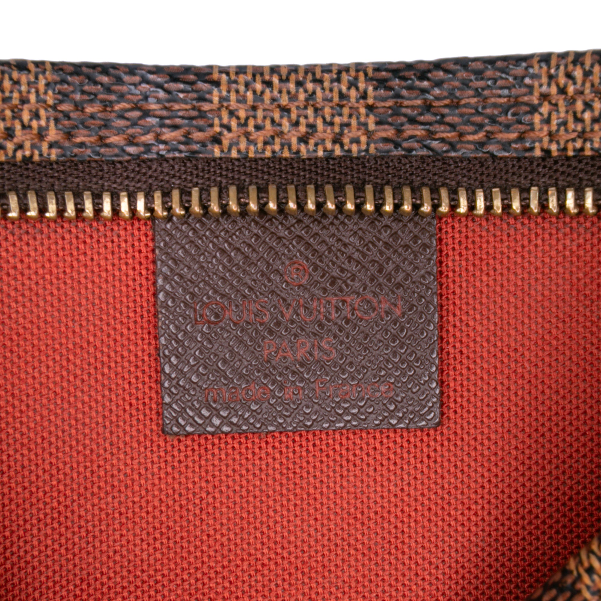 The Trousse Pochette features a damier canvas body with leather trim, a detachable flat leather strap, and a top zip closure. Retail Price: 900.00