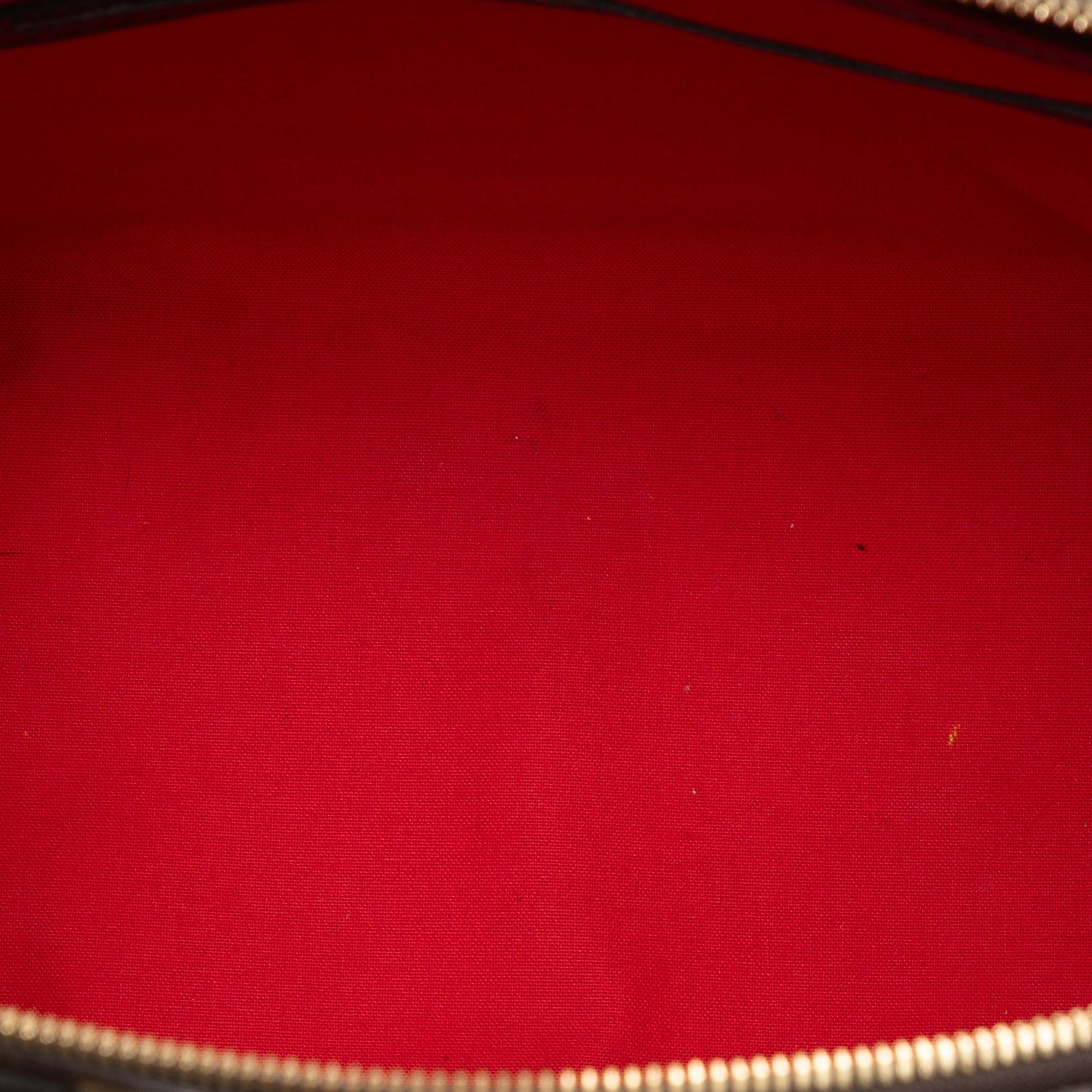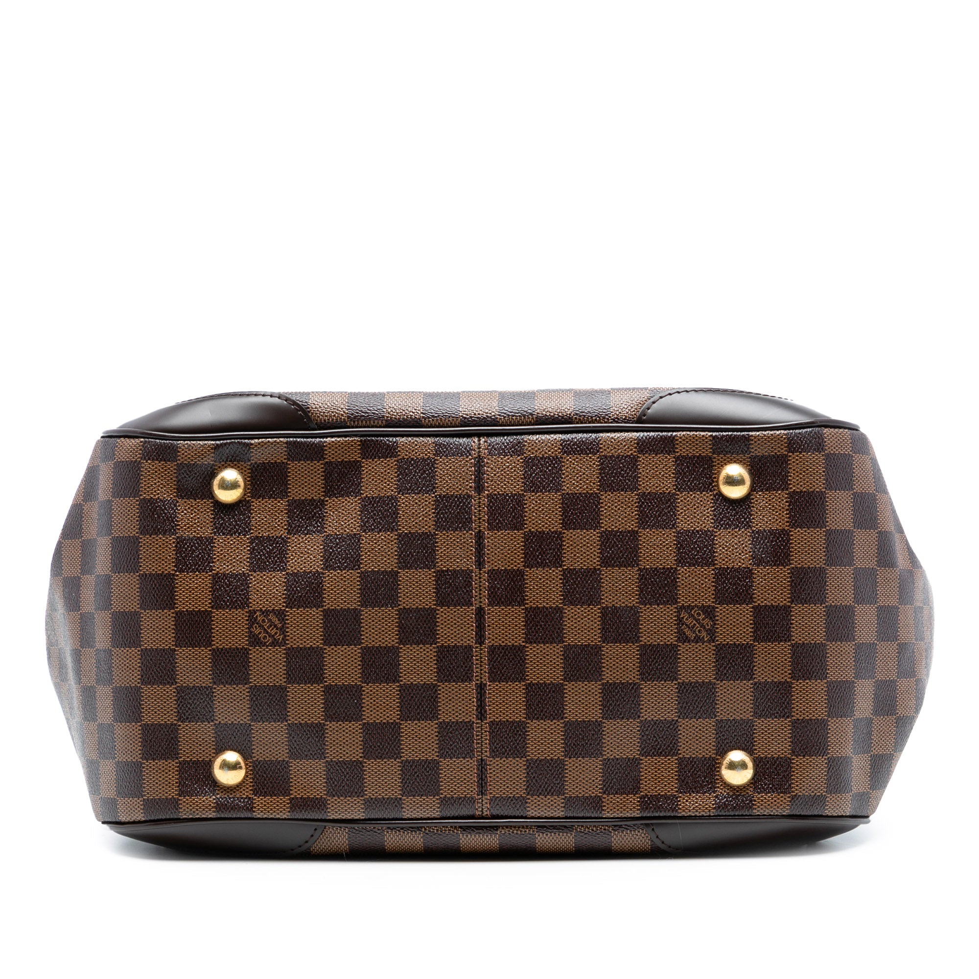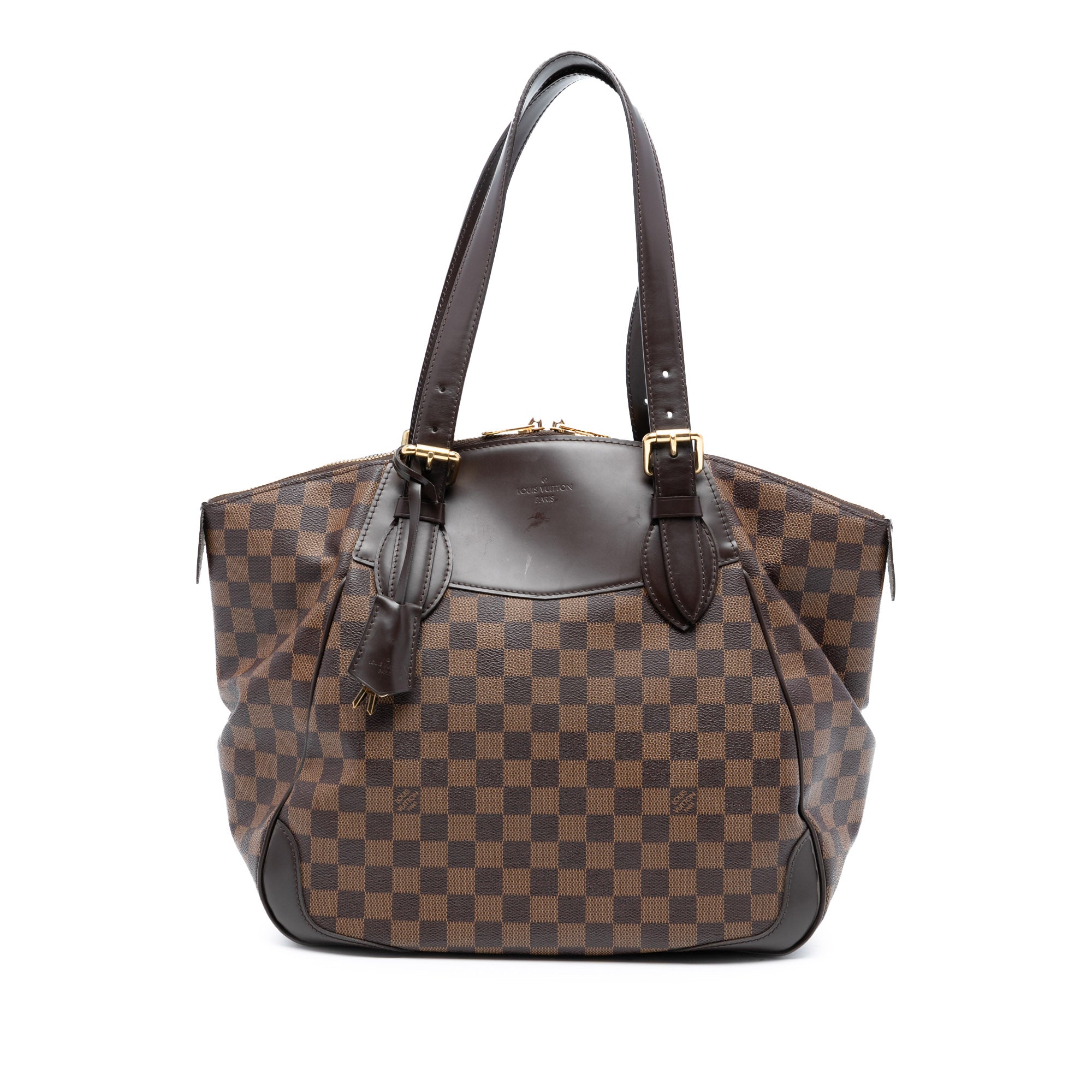 The Verona GM features a damier ebene canvas body with leather trim, flat leather straps, a 2-way top zip closure, and an interior slip pocket. Retail Price: 1870.00