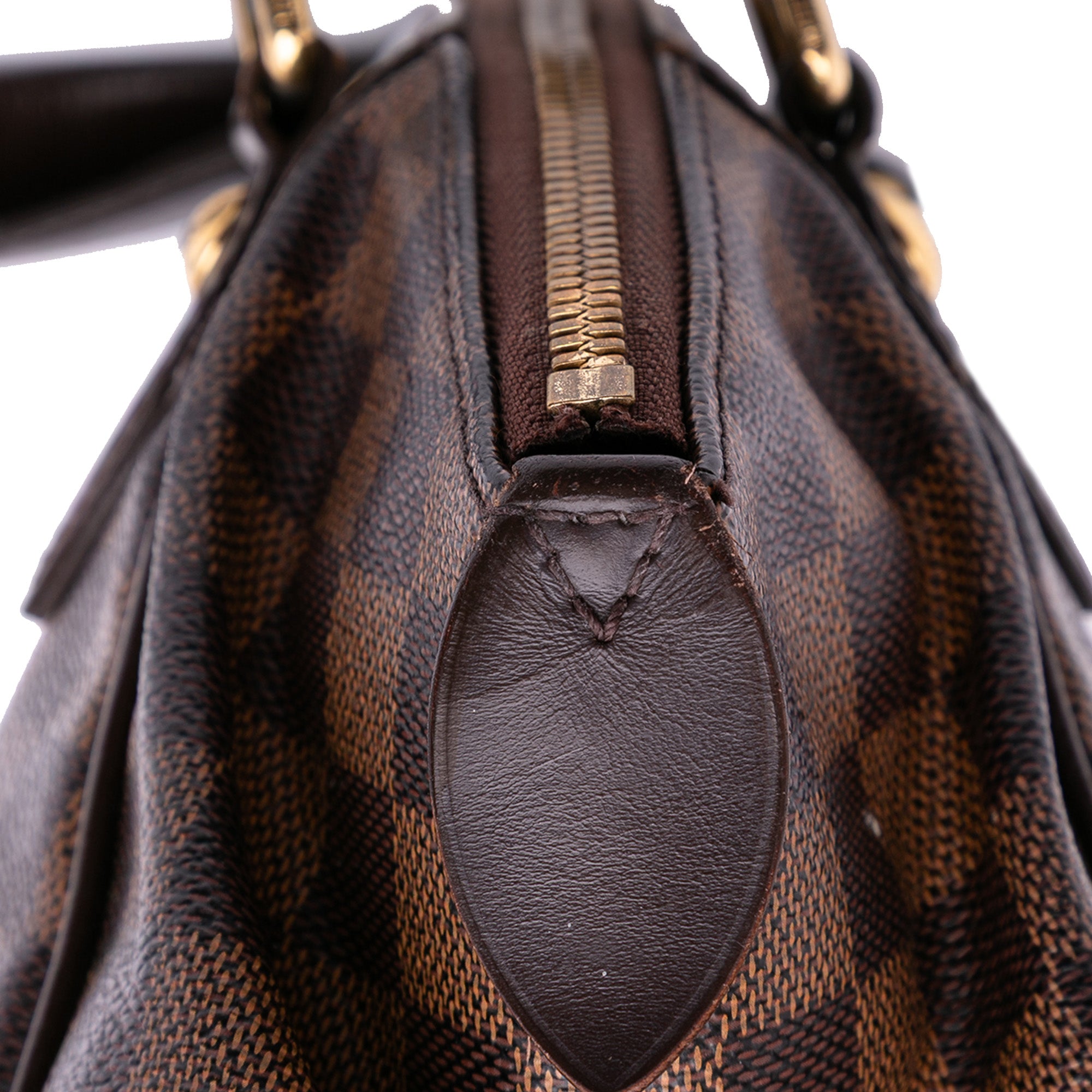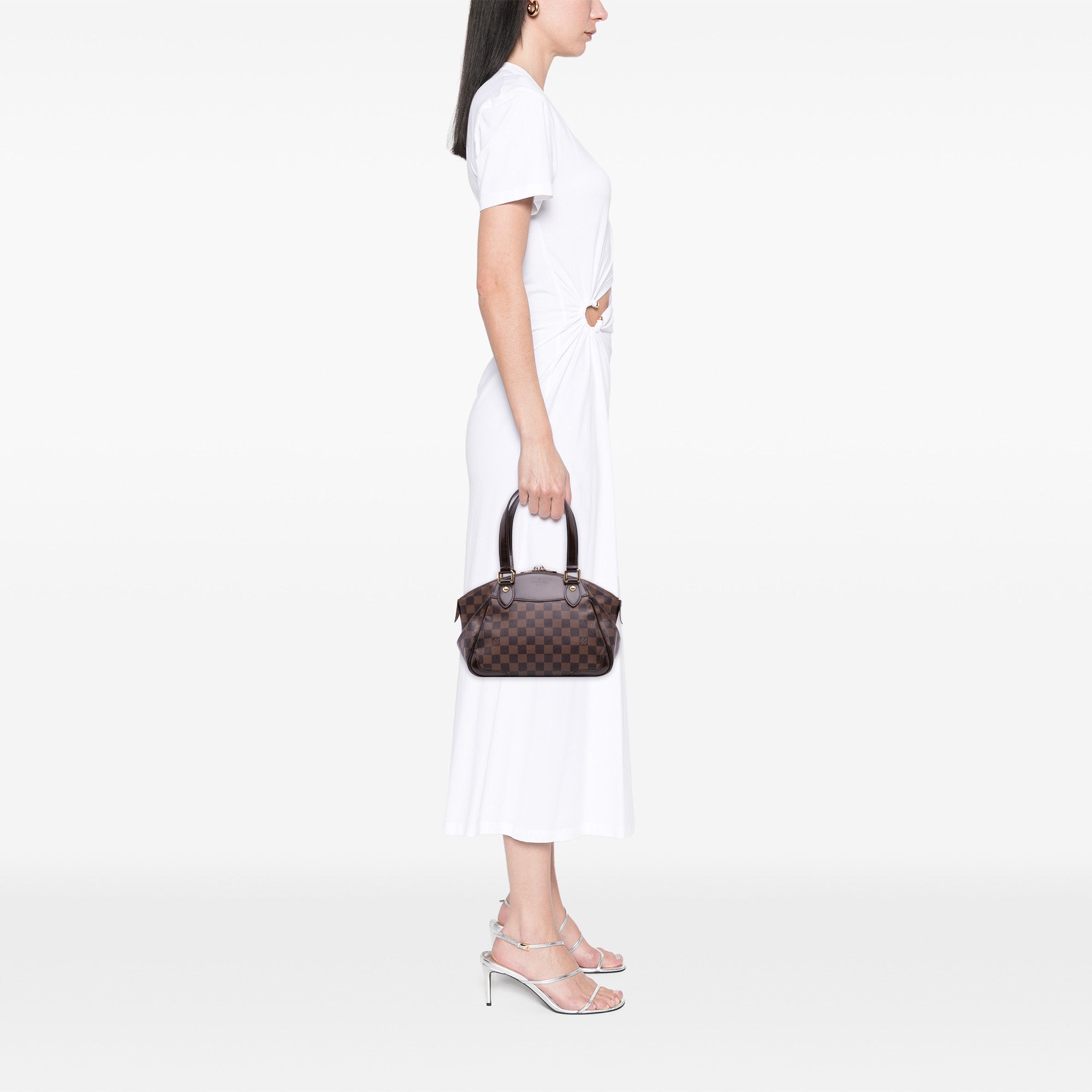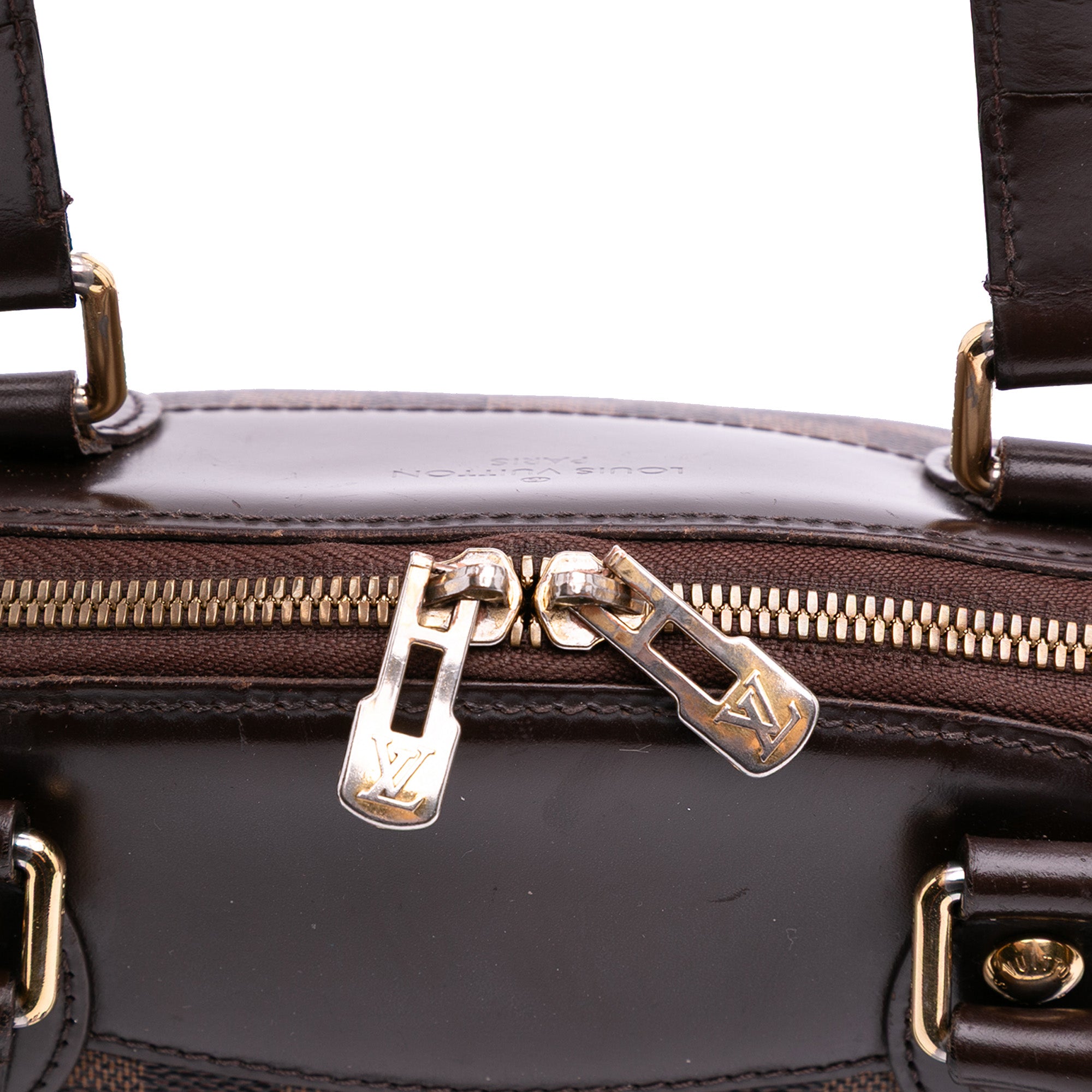 The Verona PM features a damier ebene canvas body with leather trim, flat leather handles, a top zip closure, and an interior slip pocket. Retail Price: 1560.00