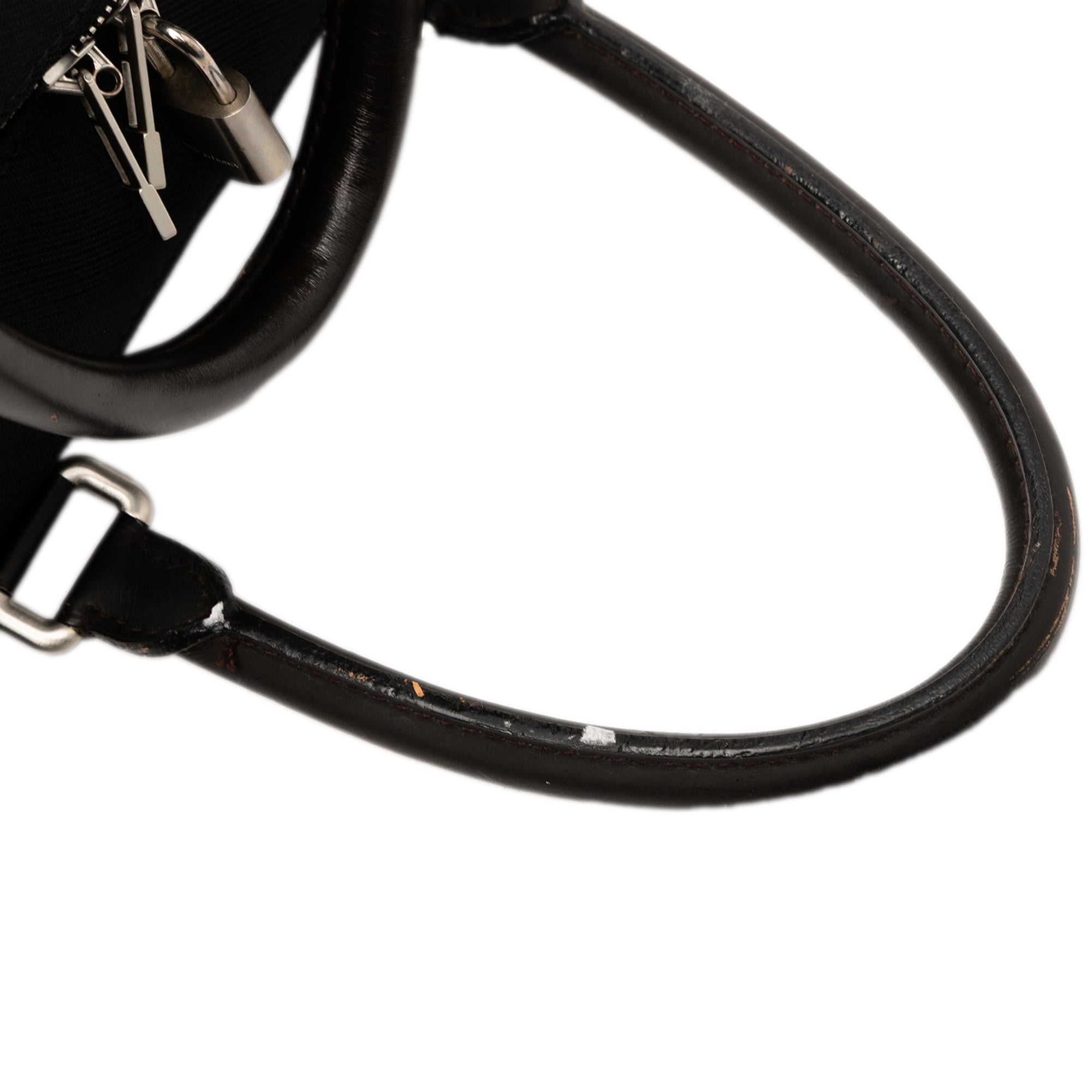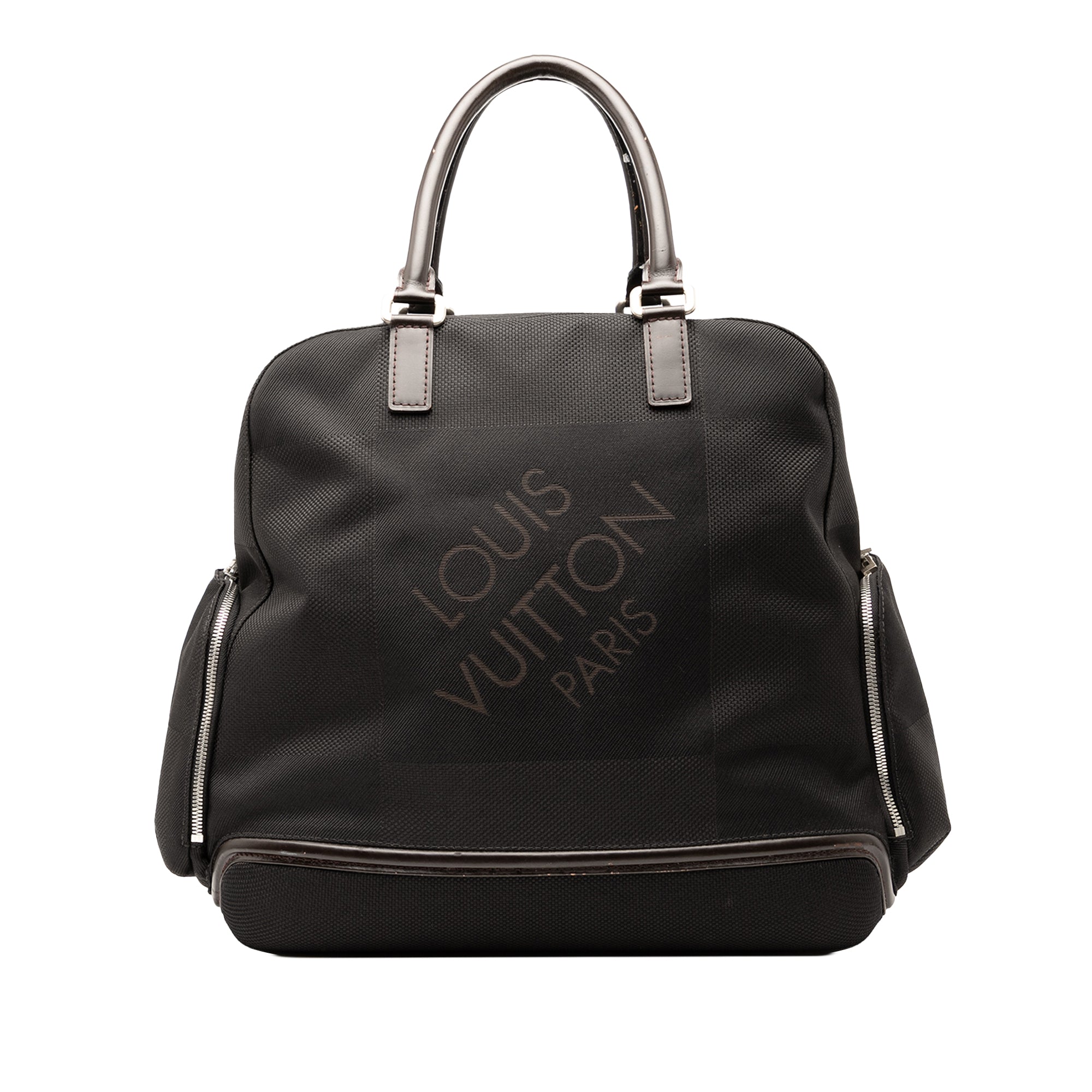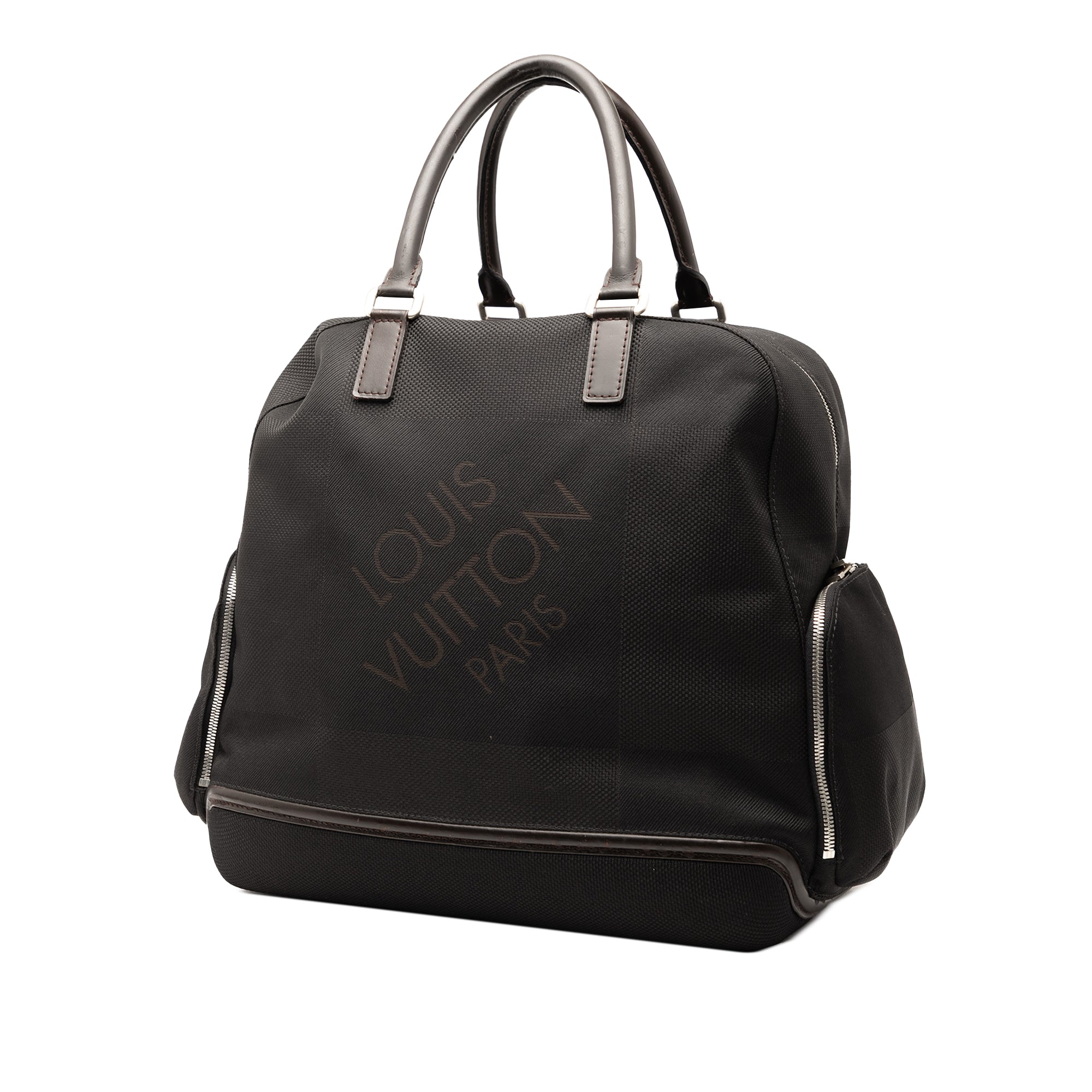 The Aventurier Polaire features a damier geant canvas body with leather trim, rolled leather handles, a two-way zip around closure, and exterior side zip pockets. Retail Price: 1230.00