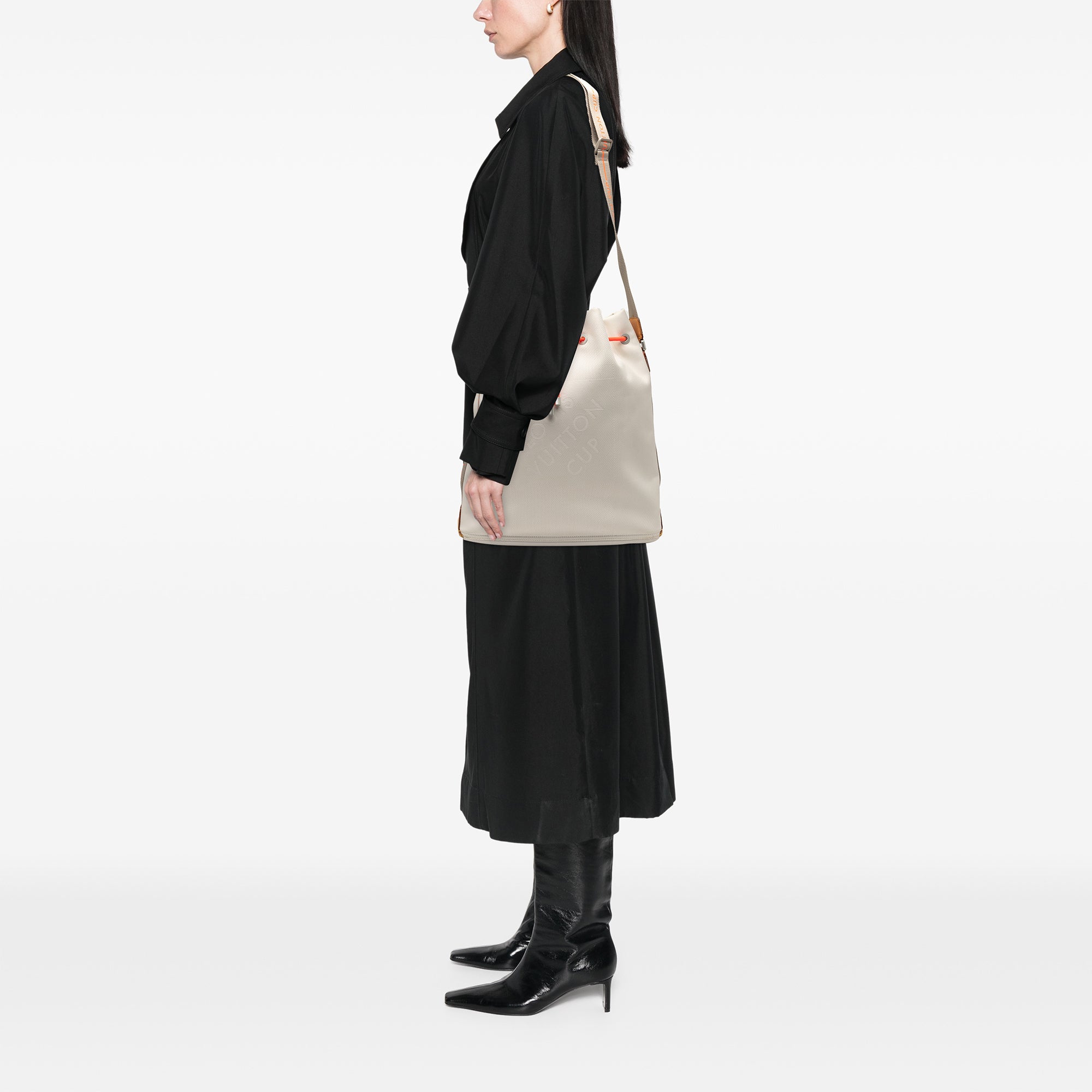 The LV Cup Volunteer Bag features a damier geant canvas body, an adjustable flat strap, an open top with a drawstring closure, and a pouch inclusion. Retail Price: 1000.00
