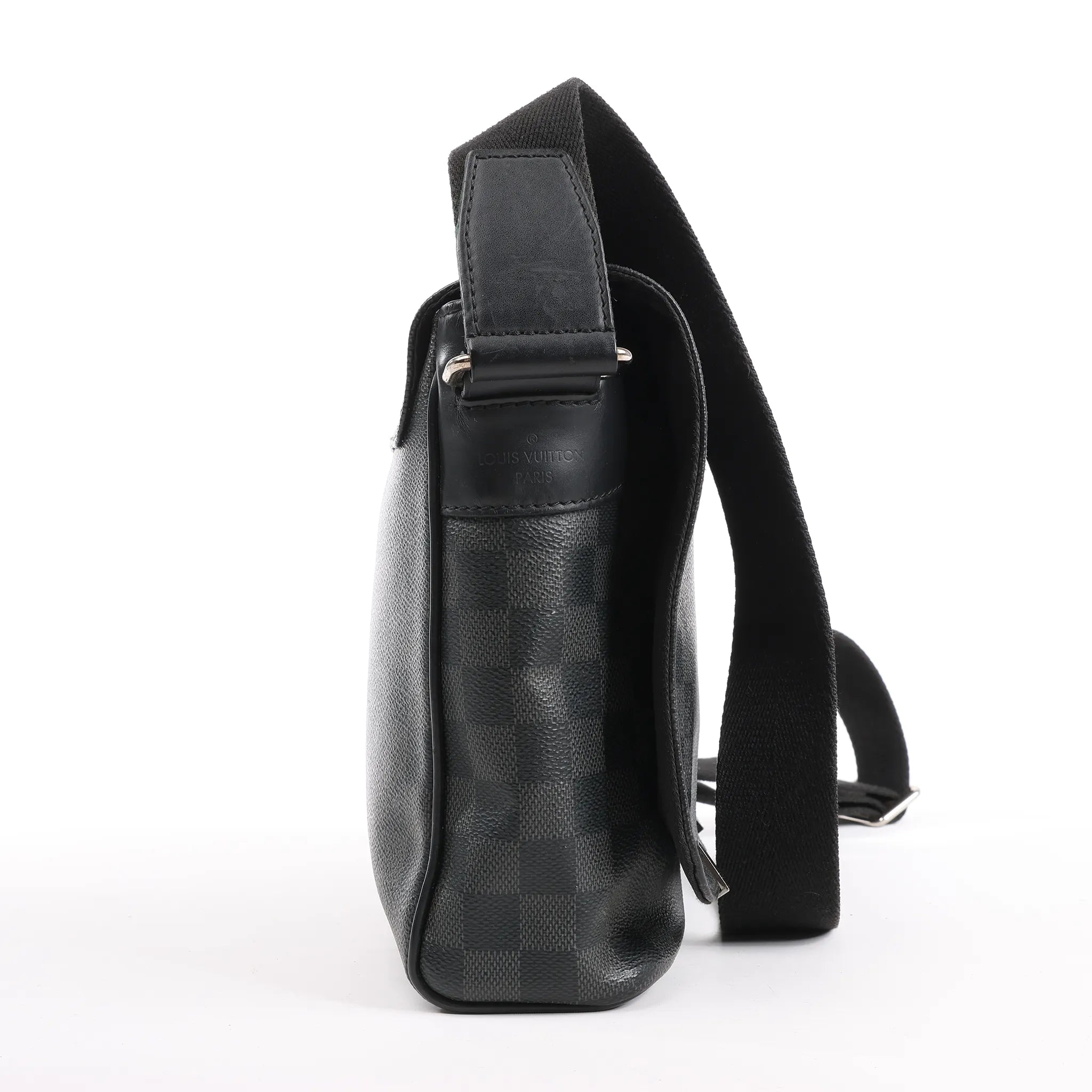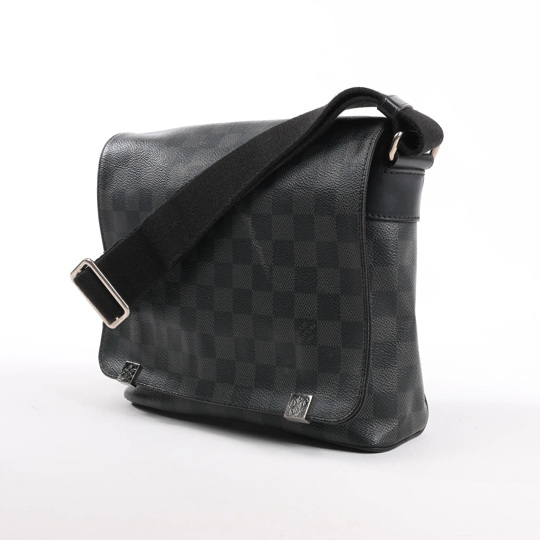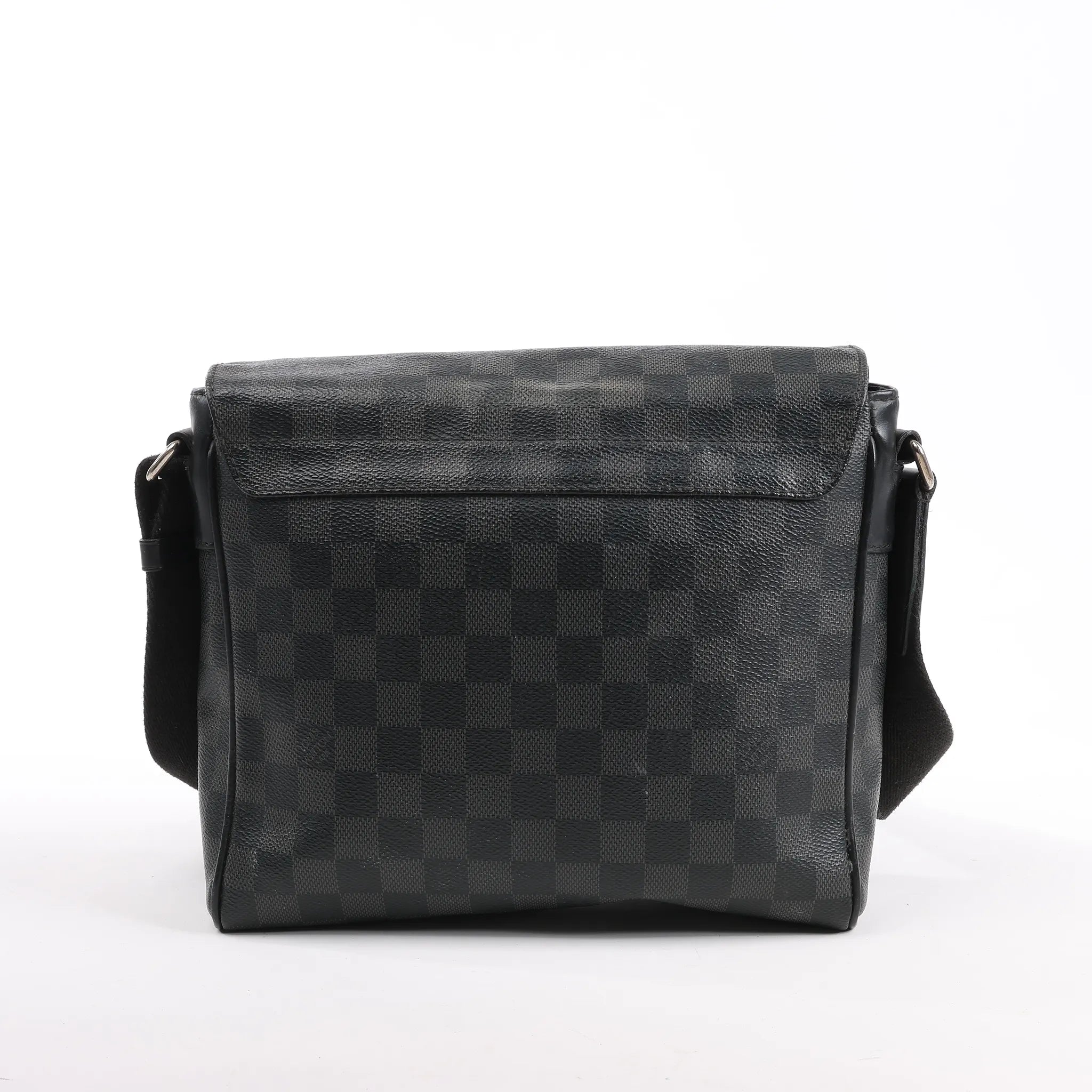 The Louis Vuitton Damier Graphite District PM Messenger Bag (N41028) delivers sleek urban style with everyday function. Crafted from black checkered coated canvas, it features a flap closure, textile-lined interior, and adjustable strap—perfect for on-the-go essentials.Brand: Louis VuittonModel: DistrictSize: PMWidth: 24.5 cmHeight: 20 cmExterior Condition: ExcellentInterior Condition: ExcellentCondition Details: The exterior coated canvas is clean and beautiful and in excellent condition, except a scratch at the front flap. The strap is very good condition. The hardware has scratches. The interior is in great condition, except some stains. The date code is CA0148.Colour: Gray, BlackInterior Colour: BlackHardware Colour: Gold Material: LeatherComes With: -