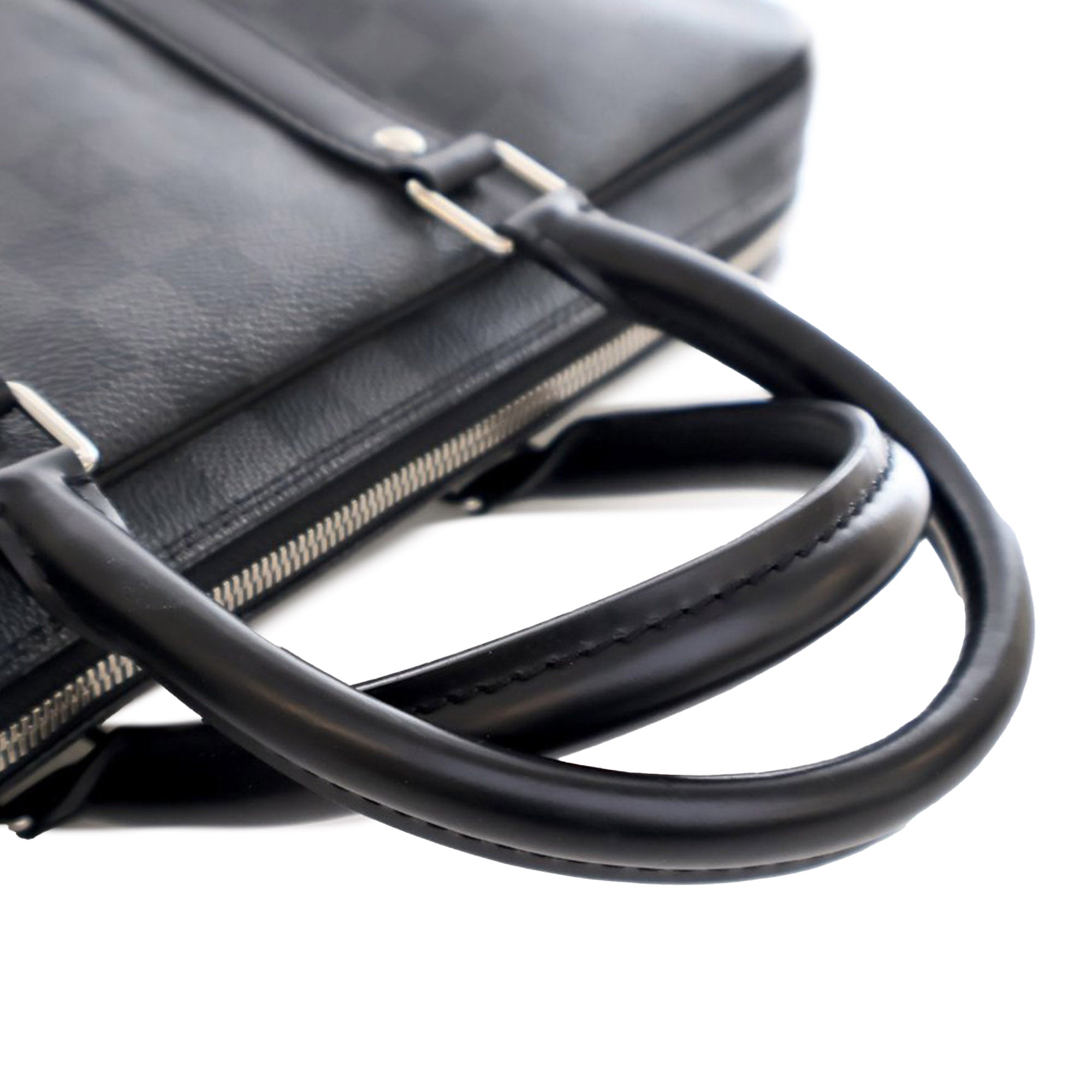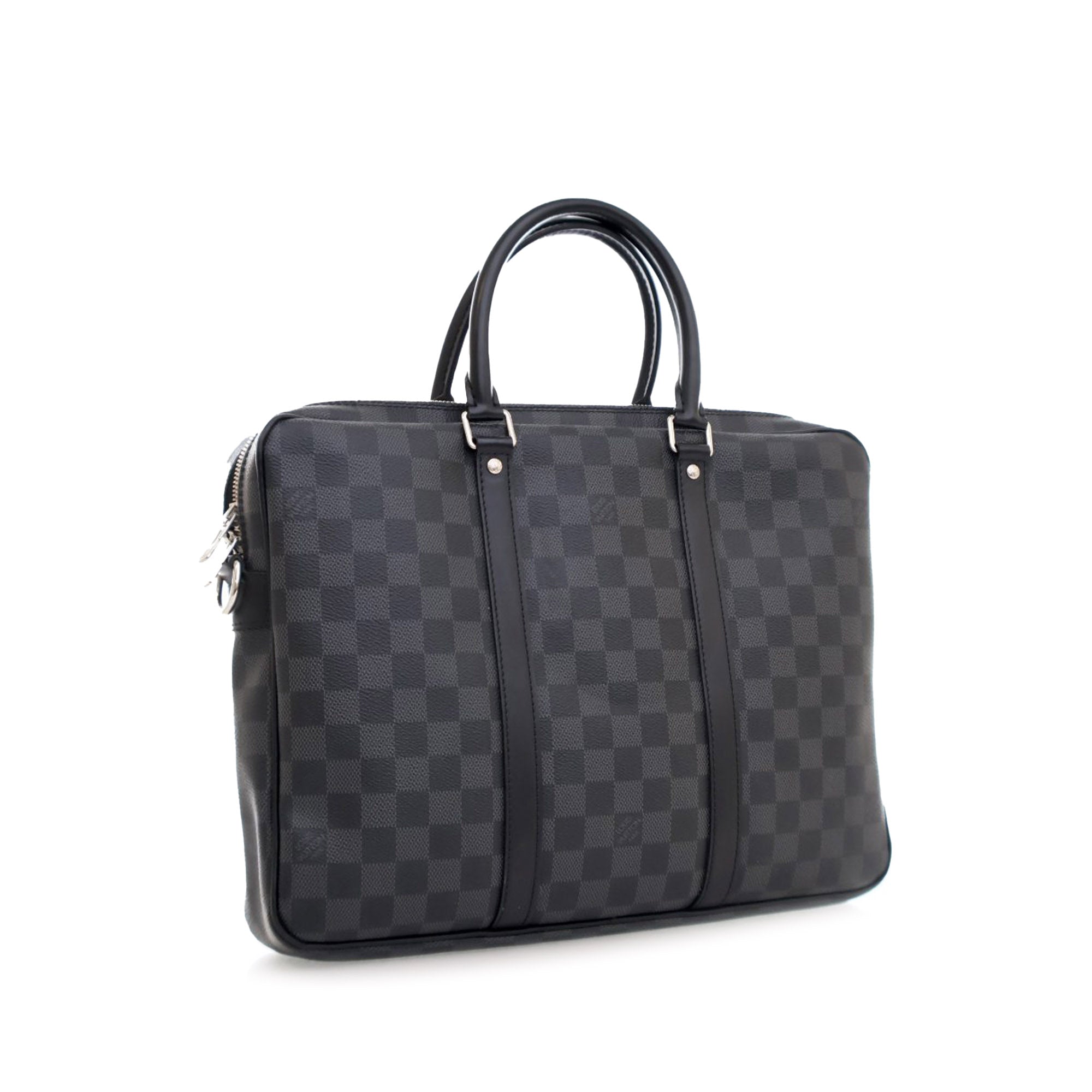 The Porte-Documents Voyage features a damier graphite canvas body with leather trim, rolled leather handles, a zip around closure, and interior zip and slip compartments. Retail Price: 1380.00