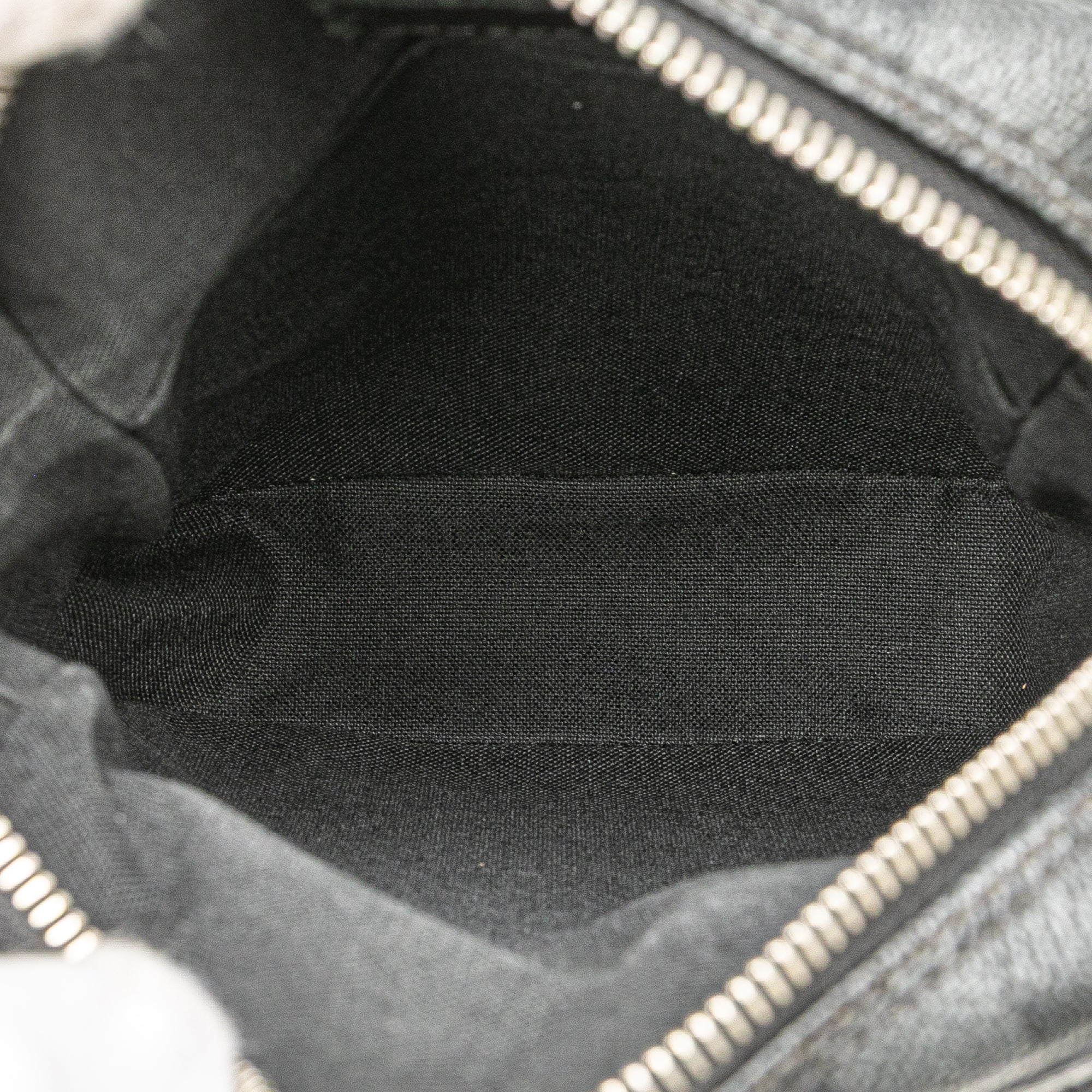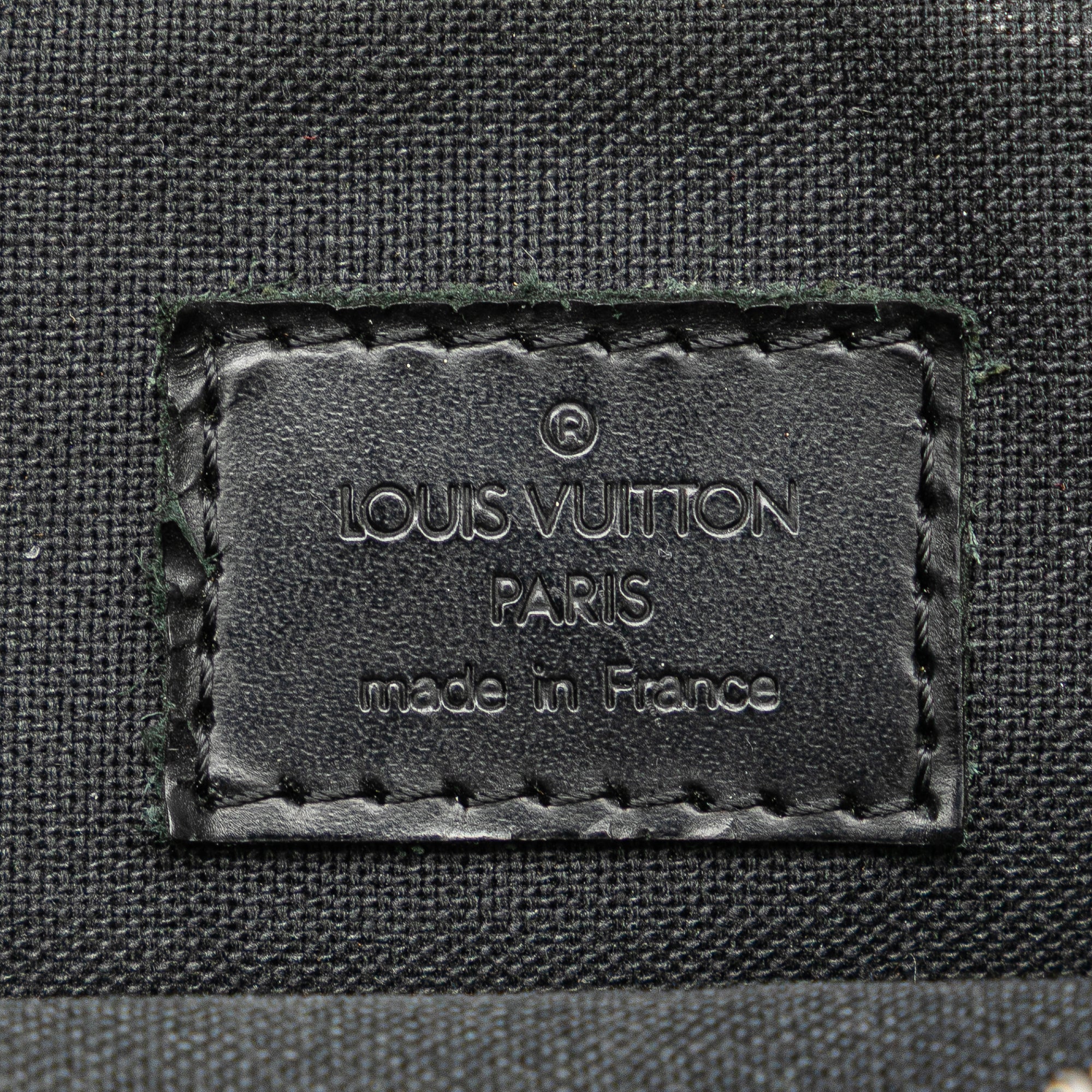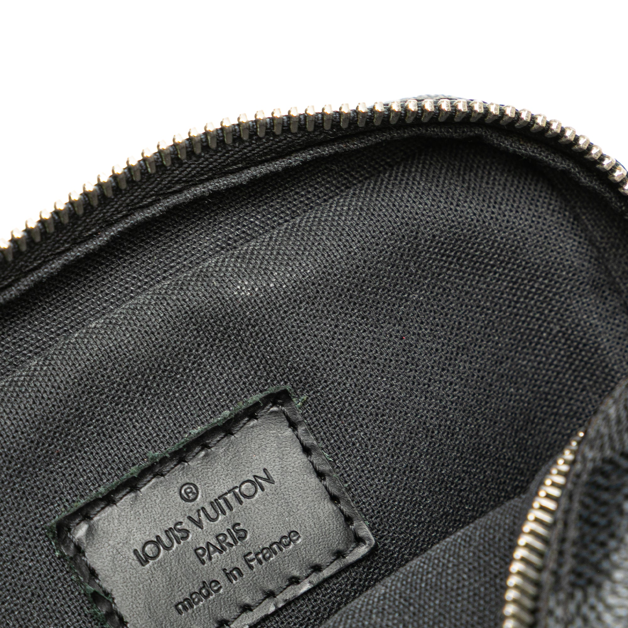 The Rem features a damier graphite canvas body with leather trim, an adjustable flat leather strap, a top zip closure, an exterior zip pocket, and an interior slip pocket. Retail Price: 1220.00