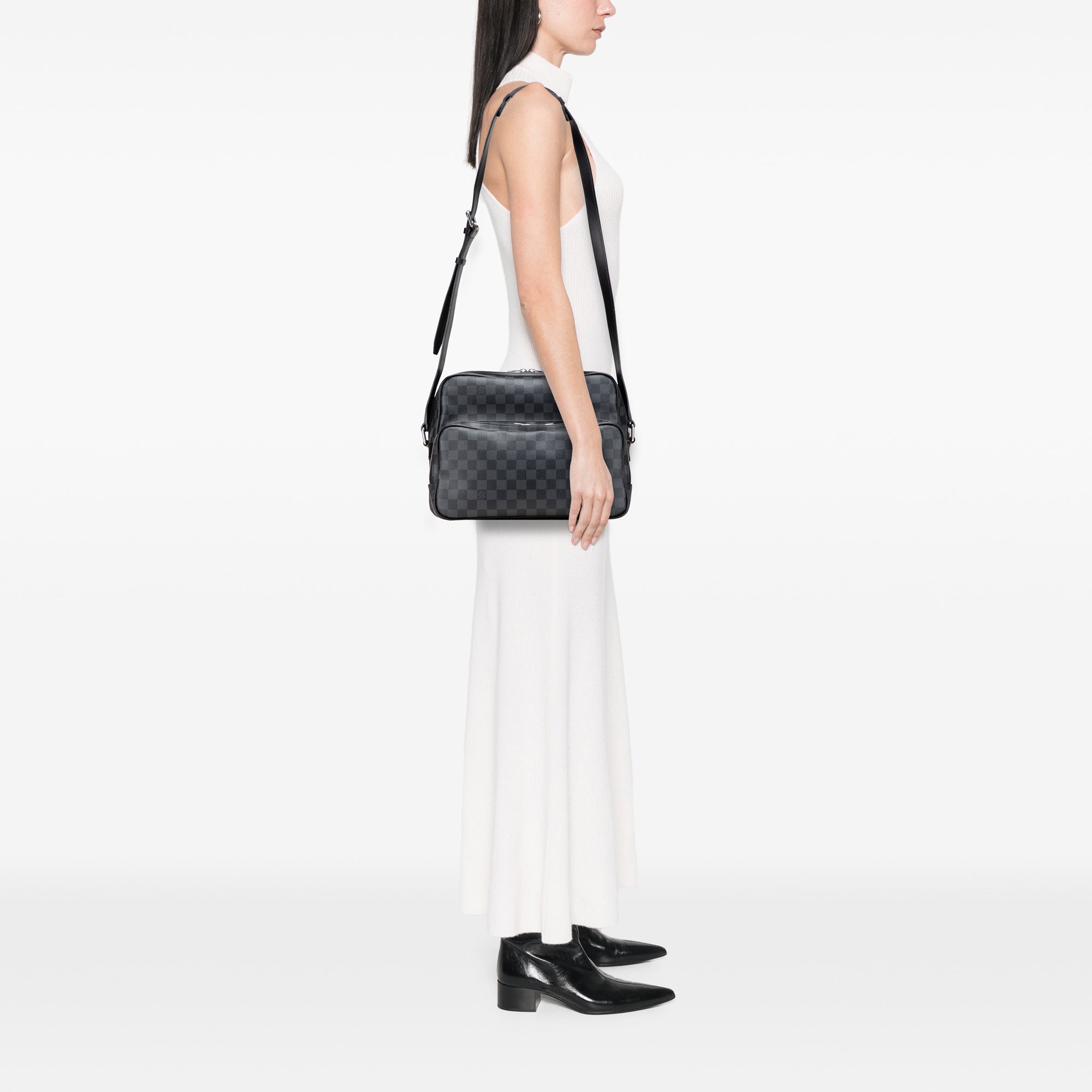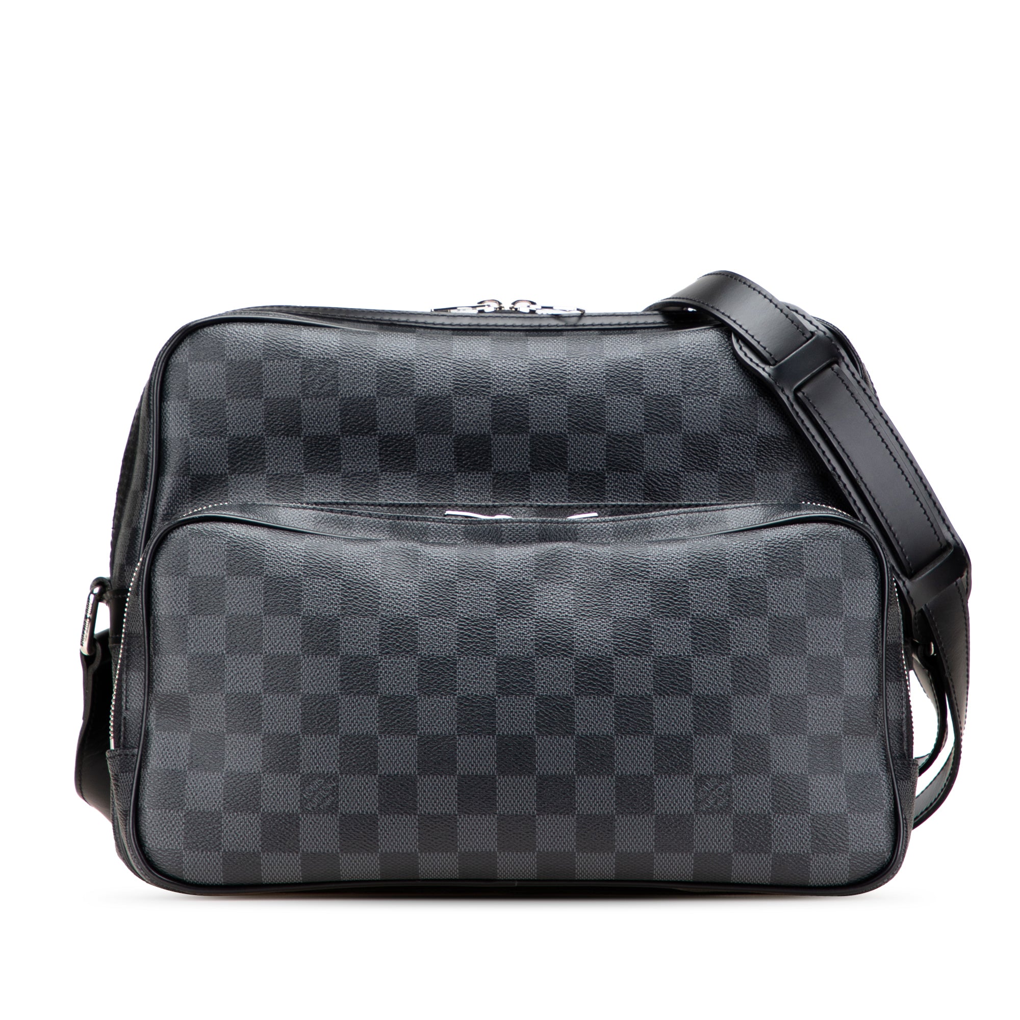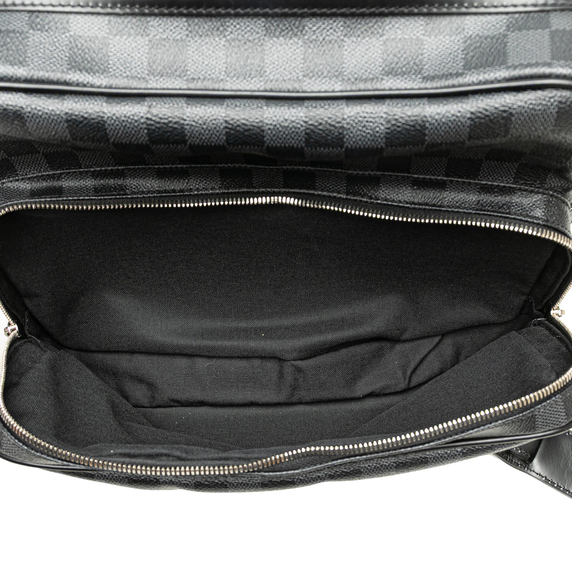 The Sac Leoh features a damier graphite canvas body with leather trim, an adjustable flat leather strap, a top zip closure, a front exterior zip pocket, and interior zip and slip pockets. Retail Price: 2450.00