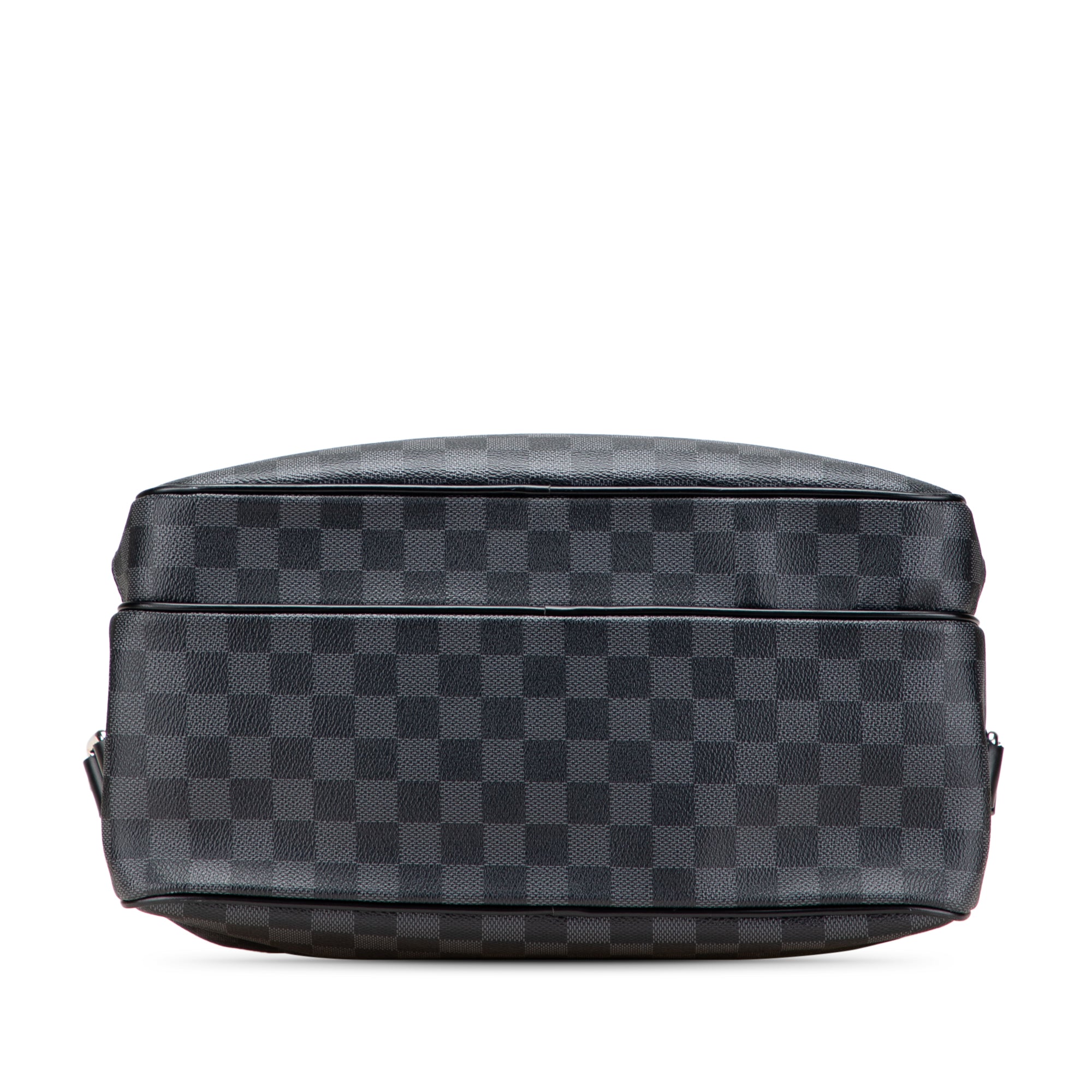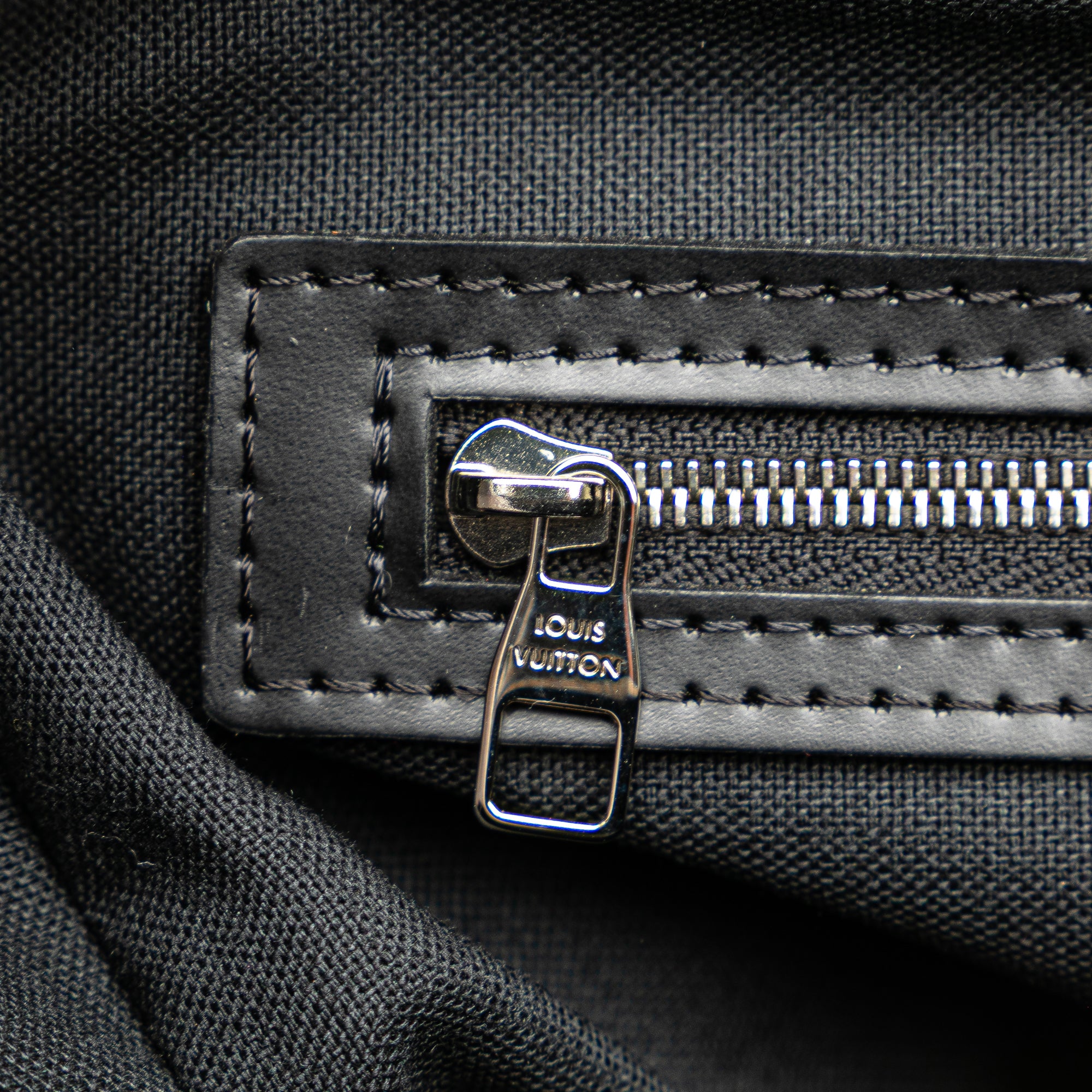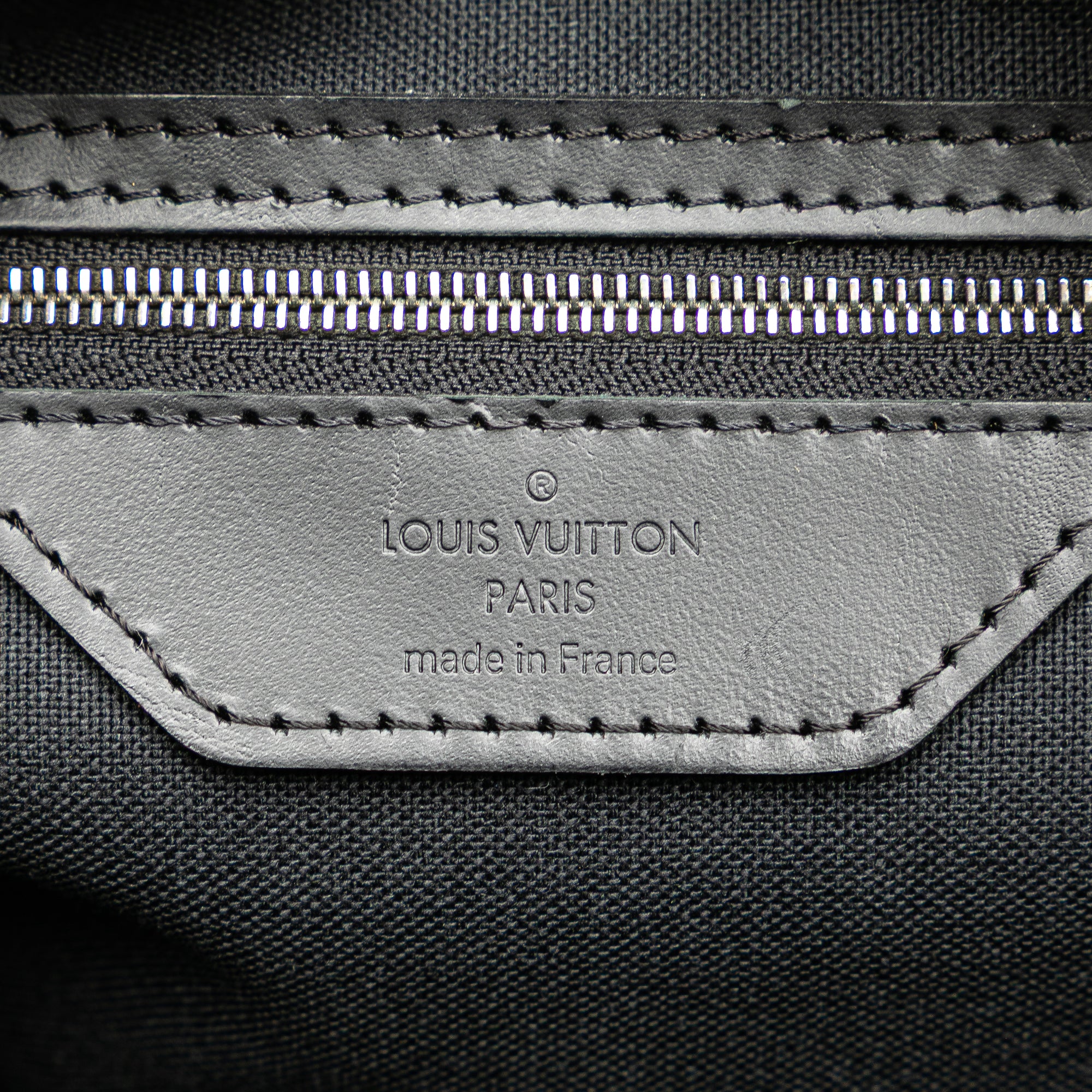 The Sac Leoh features a damier graphite canvas body with leather trim, an adjustable flat leather strap, a top zip closure, a front exterior zip pocket, and interior zip and slip pockets. Retail Price: 2450.00
