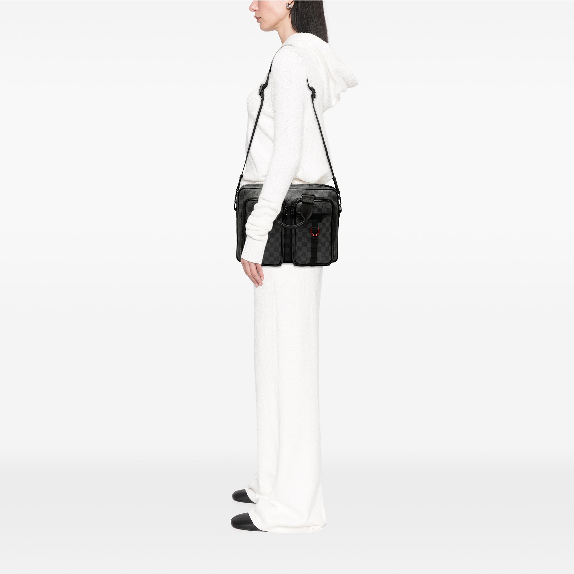 The Utility features a damier graphite canvas body with leather trim, flat top handles, a detachable flat shoulder strap with leather guard, a two-way top zip closure, exterior front zip pockets, and interior slip pockets. Inclusion: Dust bag. Retail Price: 2700.00