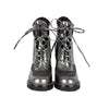 The Louis Vuitton Digital Gate Platform Ankle Boots by Nicolas Ghesquière feature a futuristic take on classic ankle boot design with a shiny silver platform heel. These striking boots feature a silver patent and mesh design, a chunky ombré heel, and a rubber sole. The lace-up front closing ensures a secure fit.