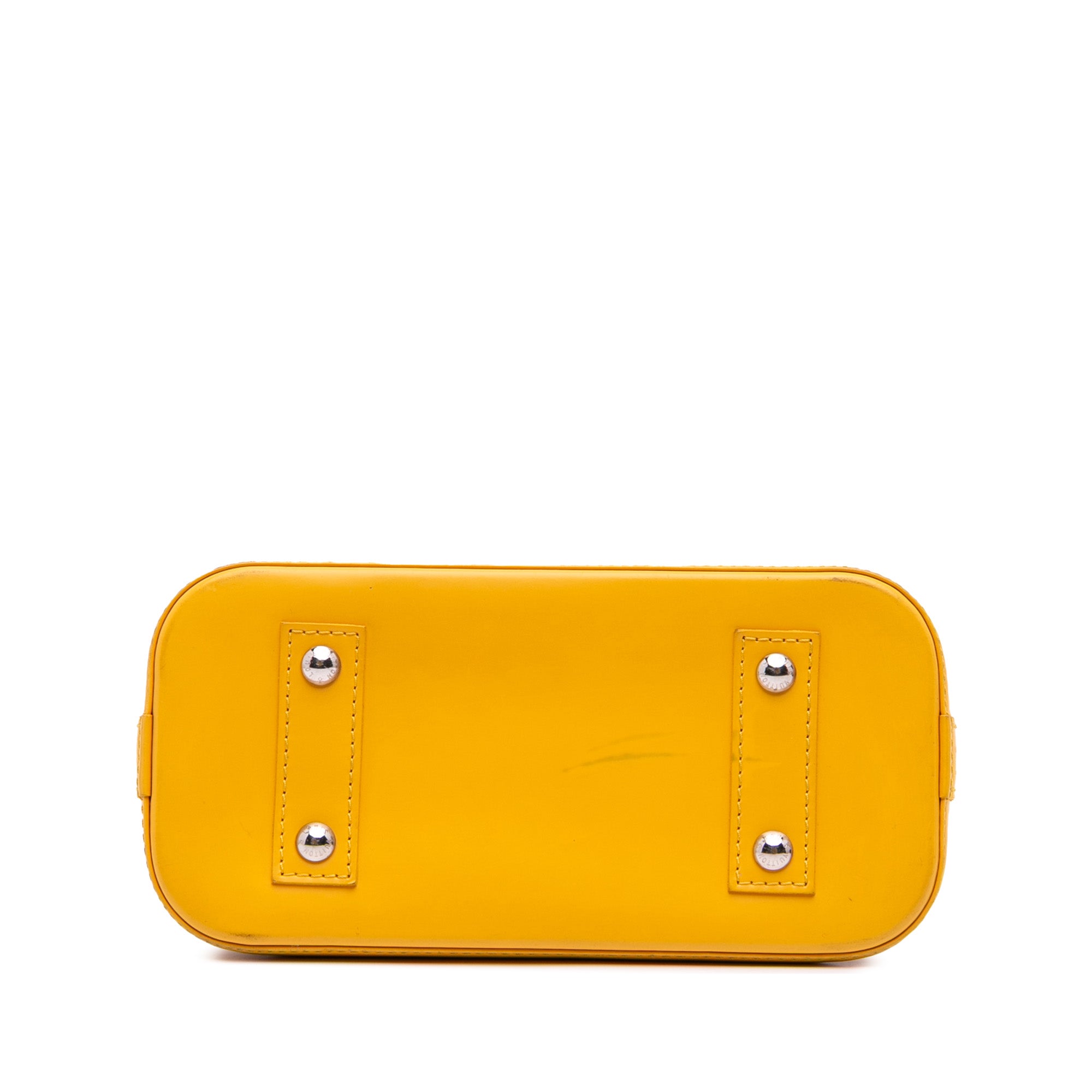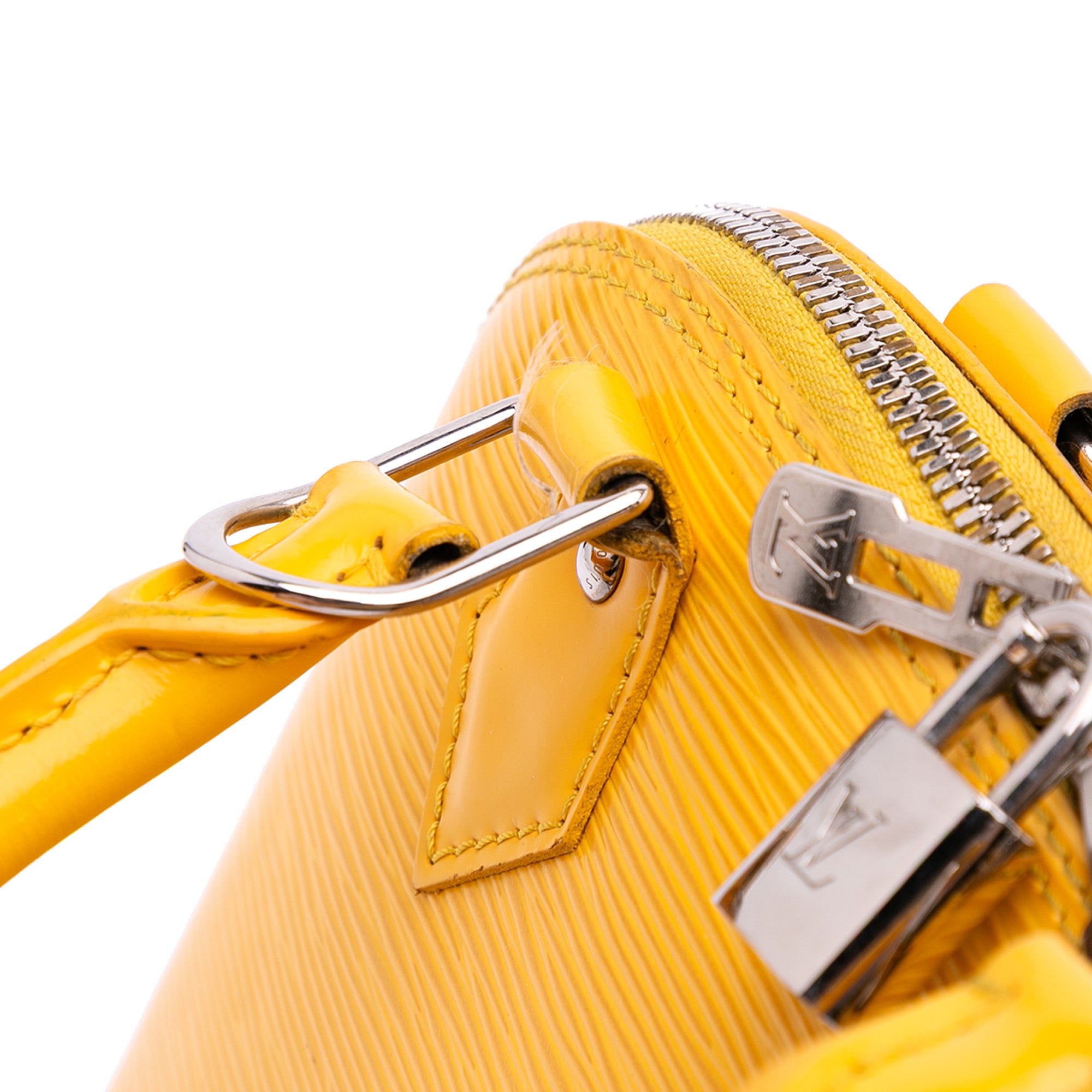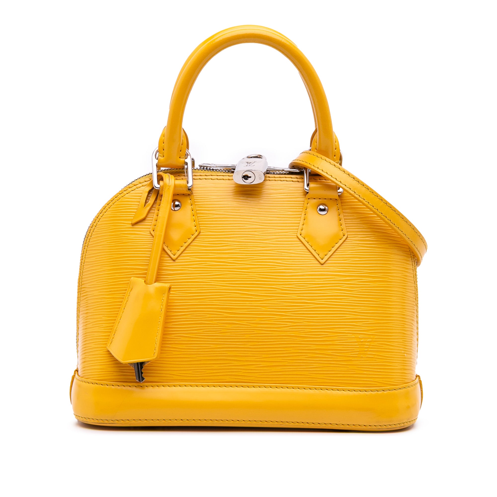 The Alma BB features an epi leather body, rolled leather top handles, a detachable flat leather strap, a top zip closure, and an interior slip pocket. Retail Price: 2195.00