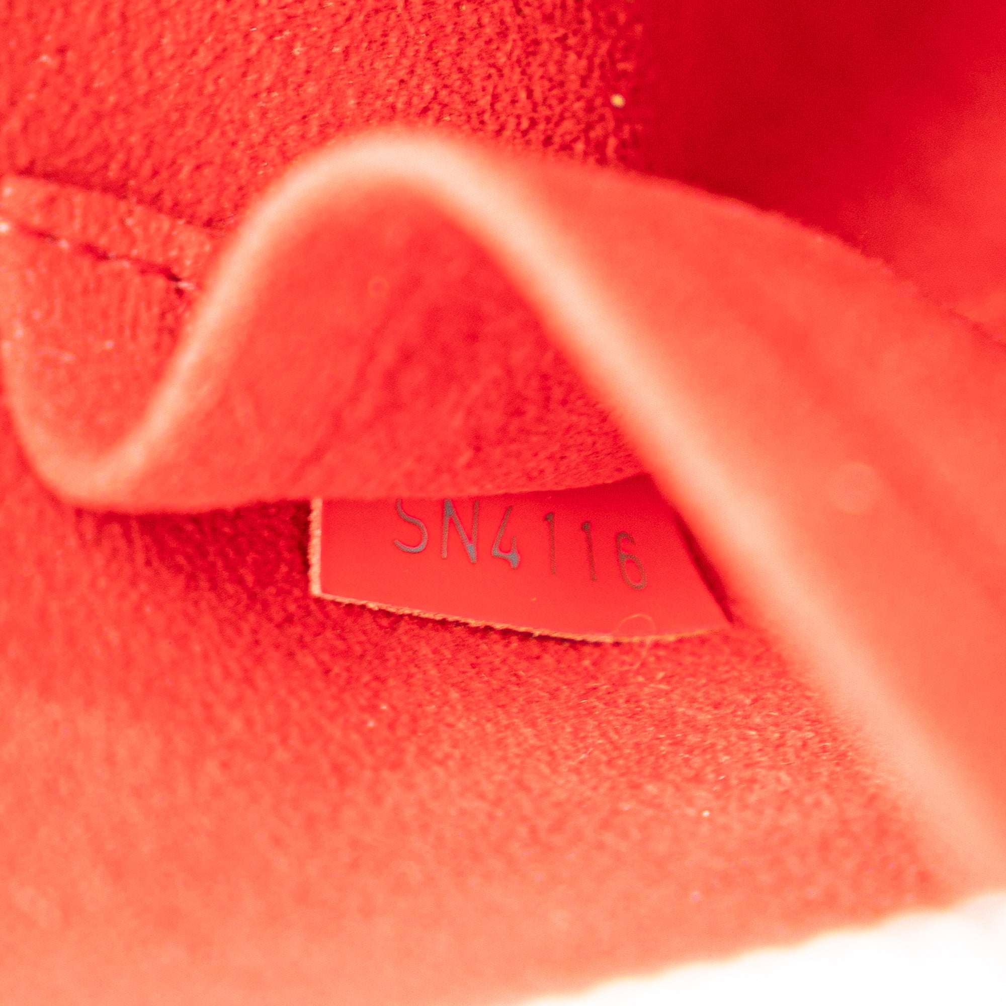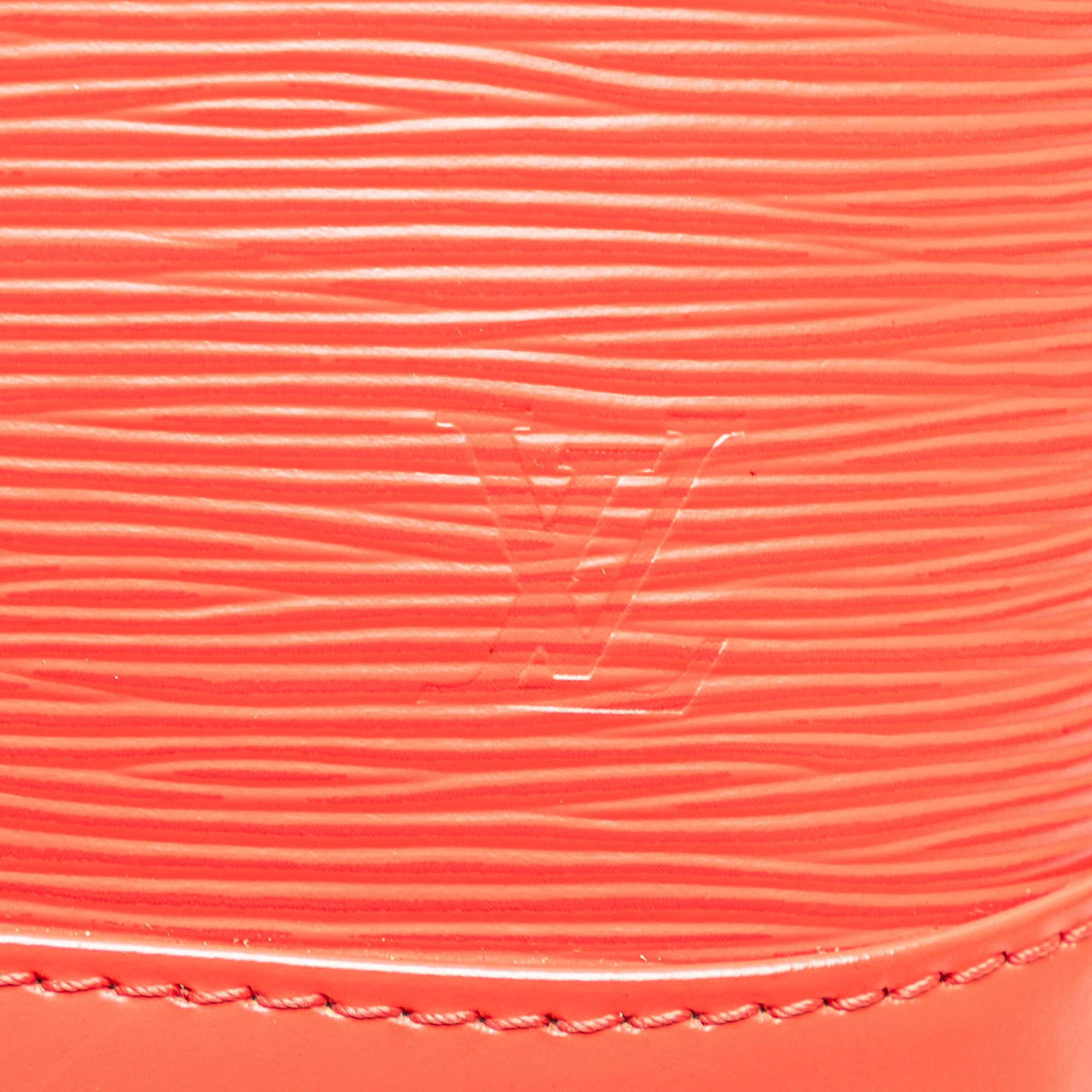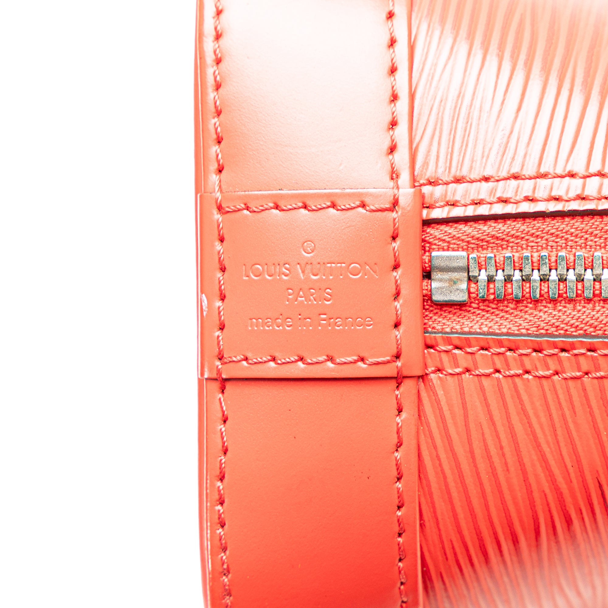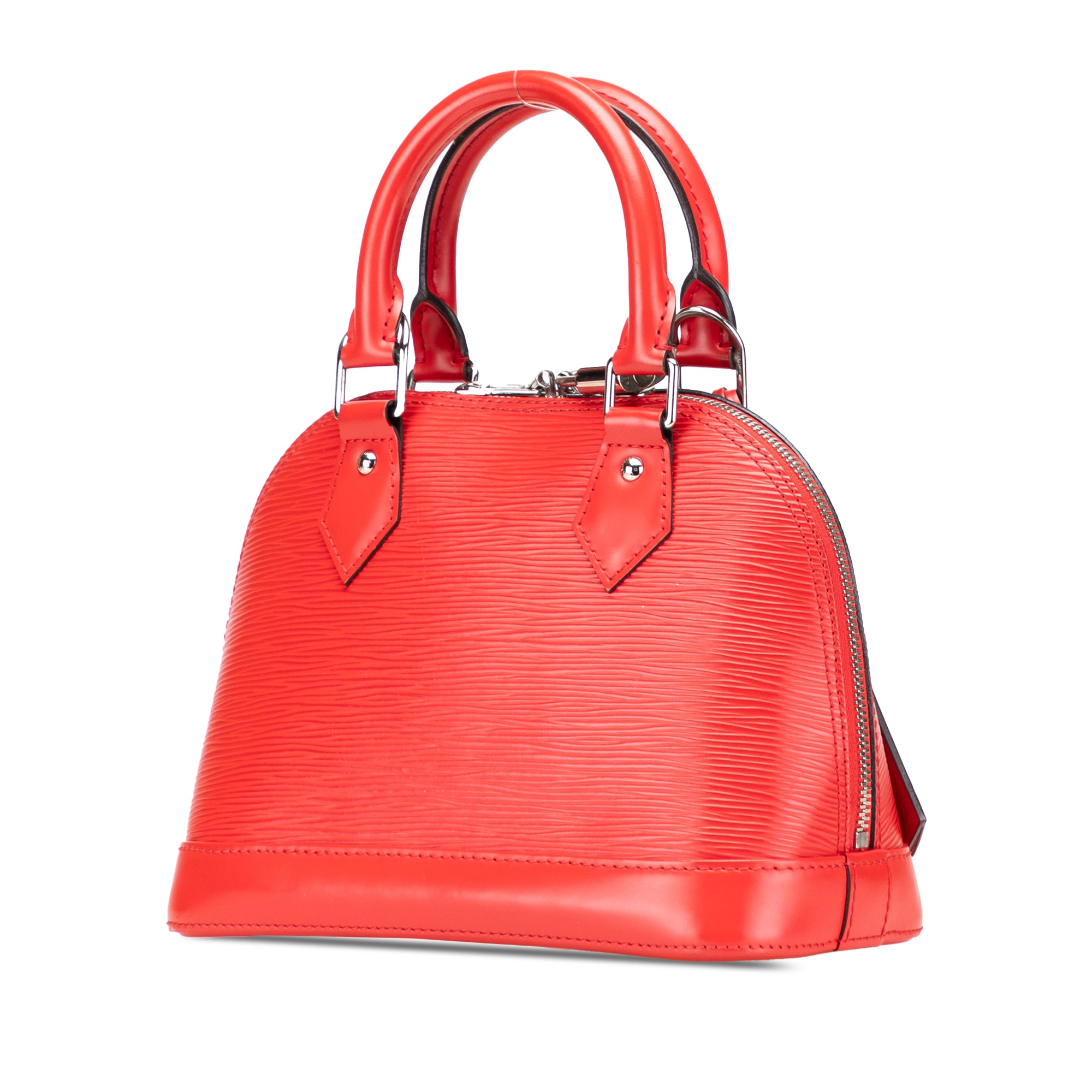 The Alma BB features an epi leather body, rolled top handles, a detachable flat leather strap, a top zip closure, and an interior slip pocket. Retail Price: 2150.00