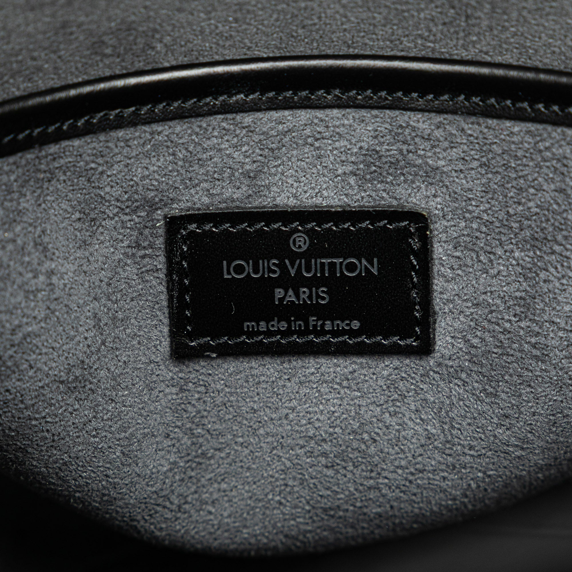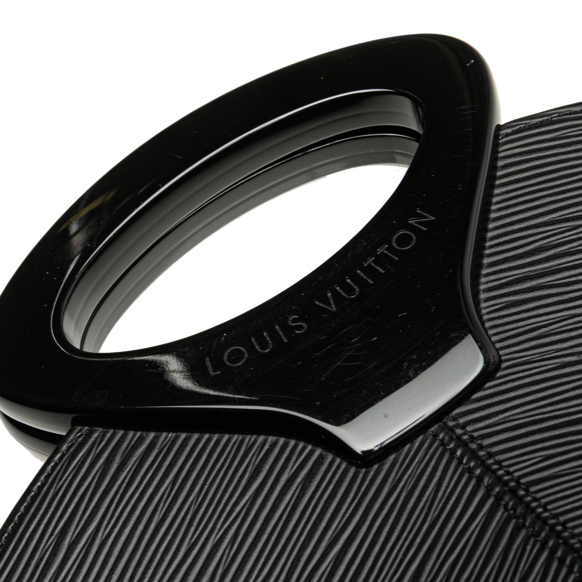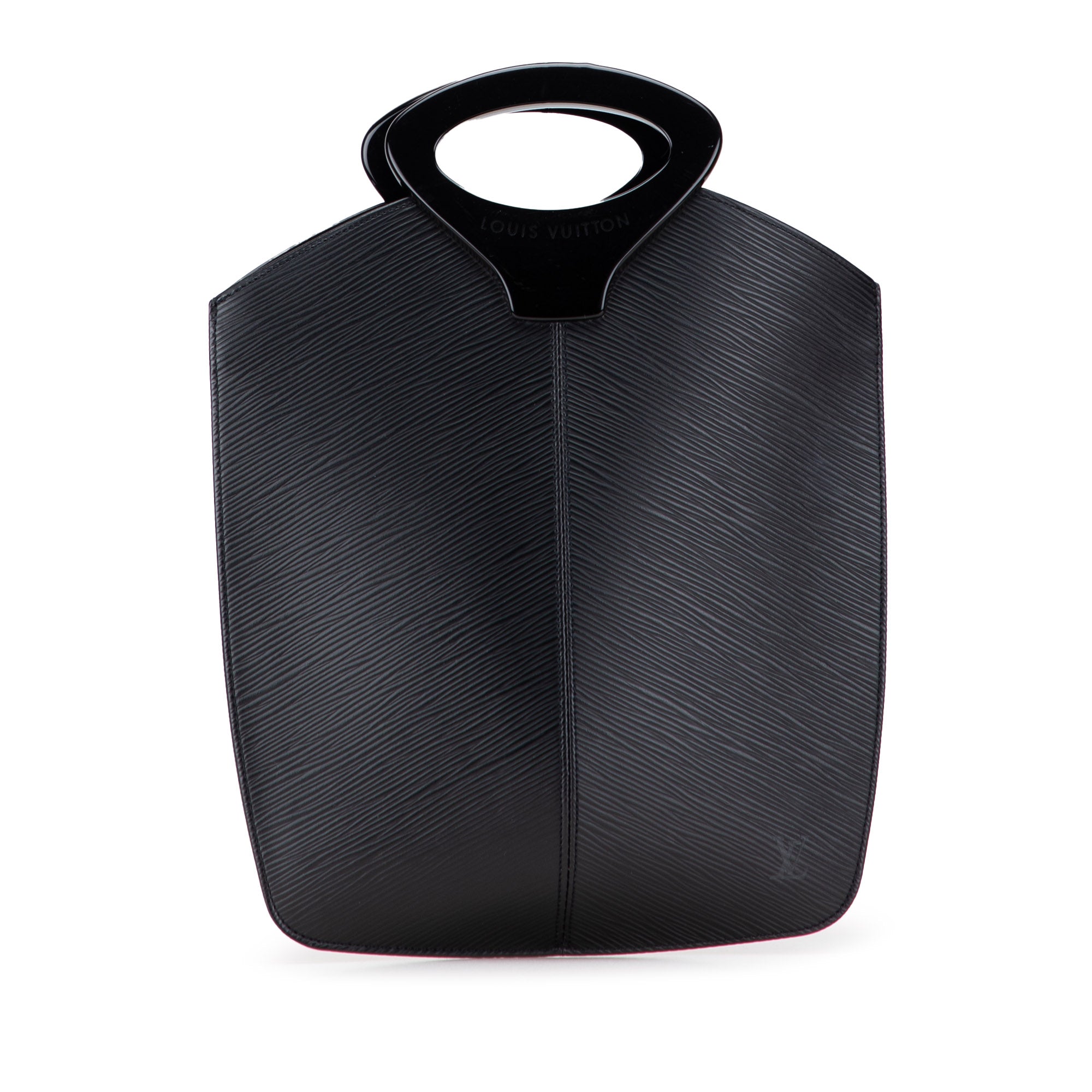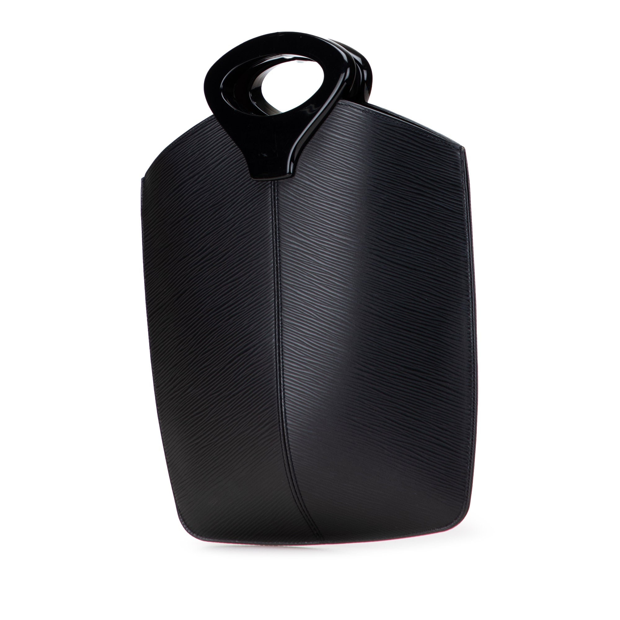 The Demi Lune features an epi leather body, structured plastic handles, an open top, and an interior slip pocket. Retail Price: 1280.00