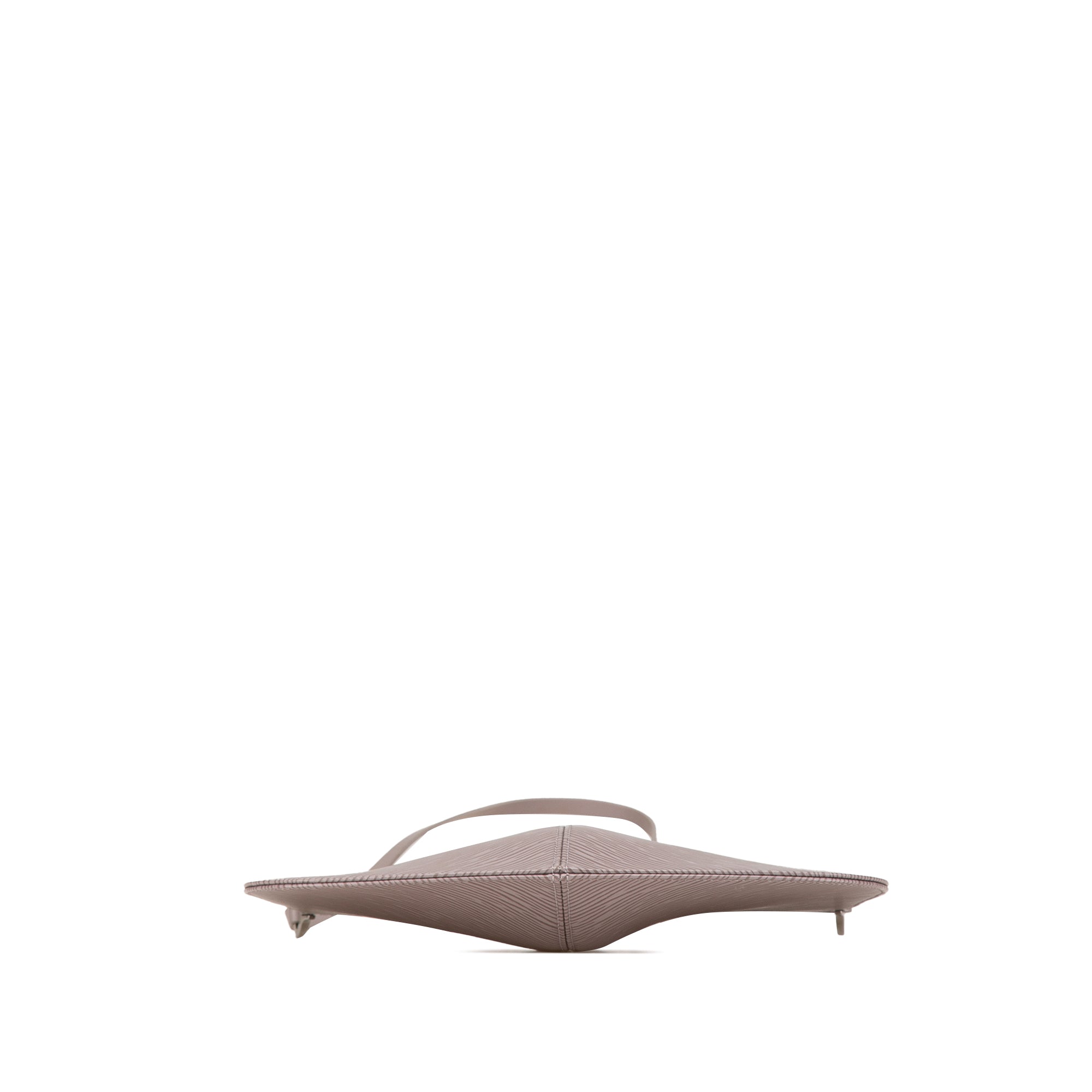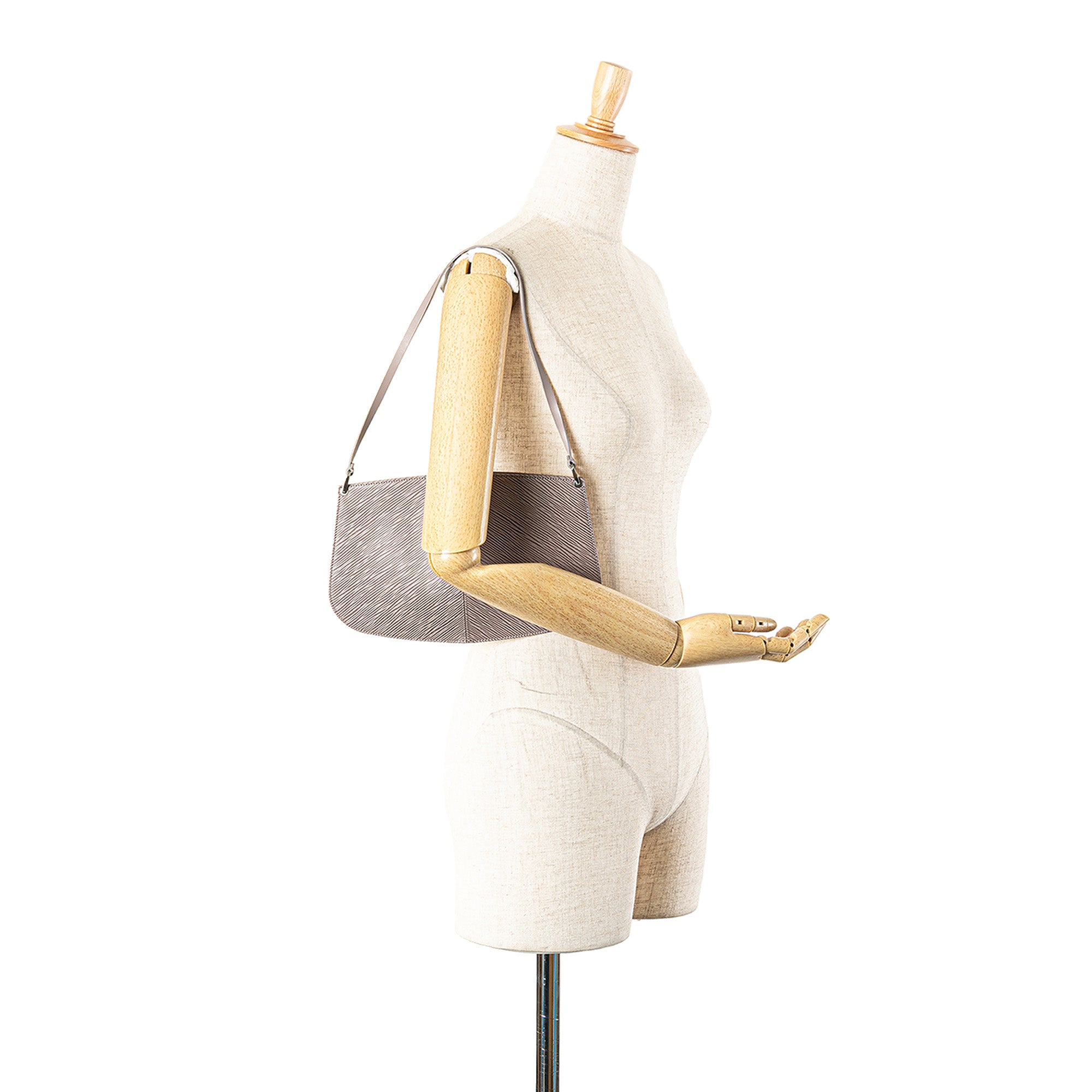 The Demi Lune Pochette features an epi leather body, a flat leather strap, and an open top with magnetic snap closure. Inclusion: Dust bag. Retail Price: 900.00