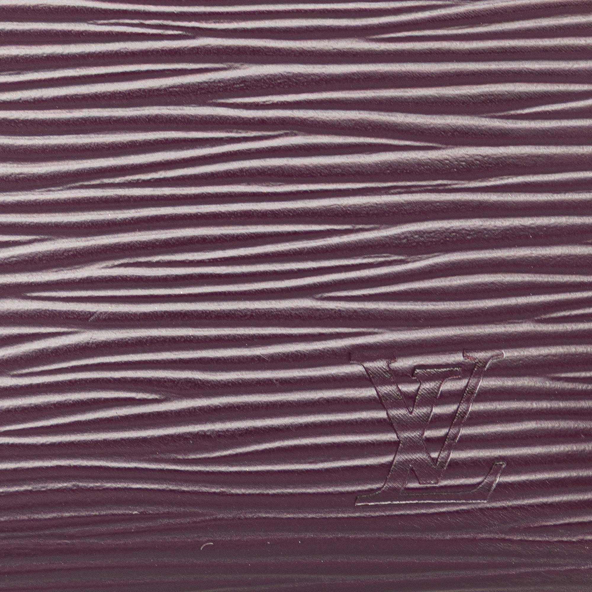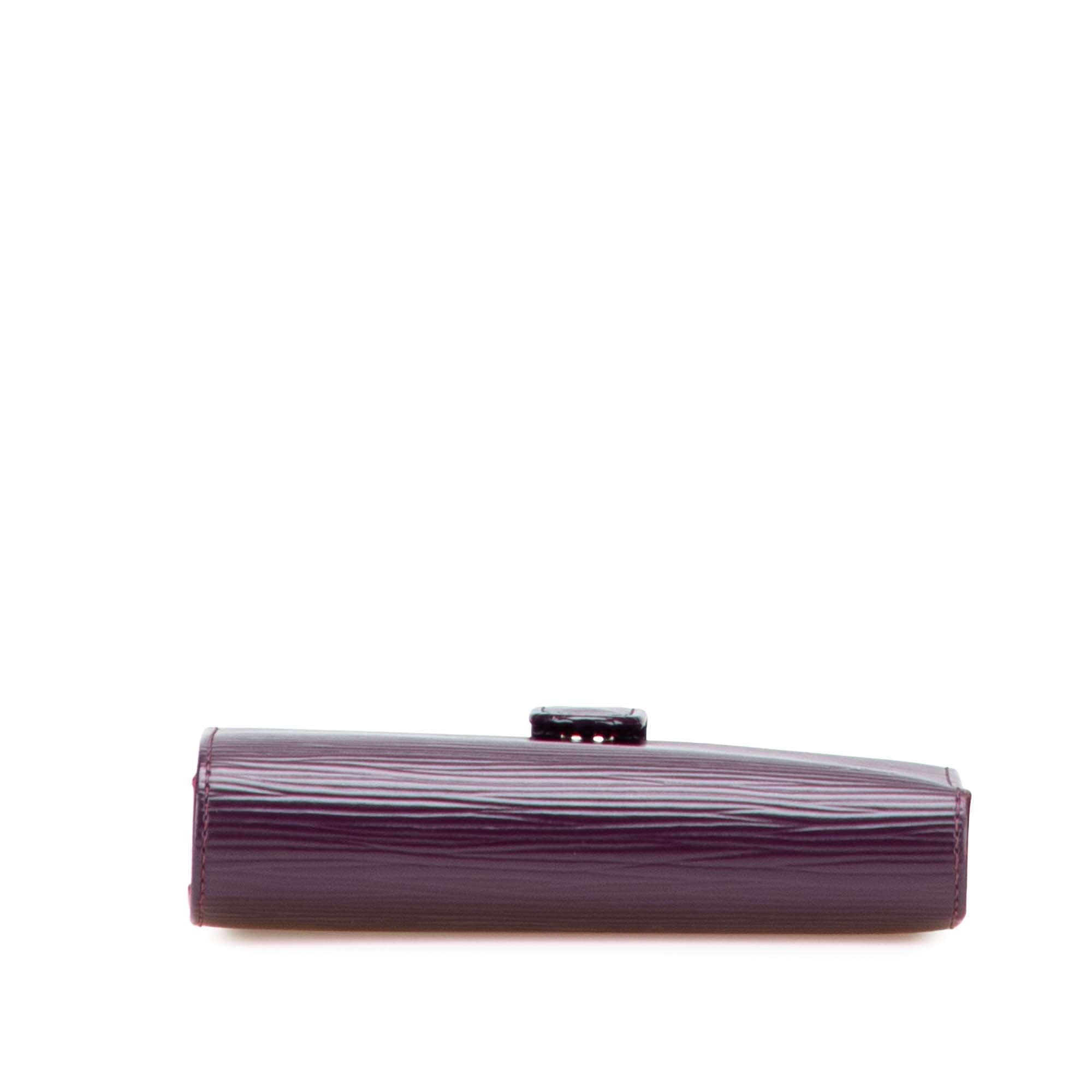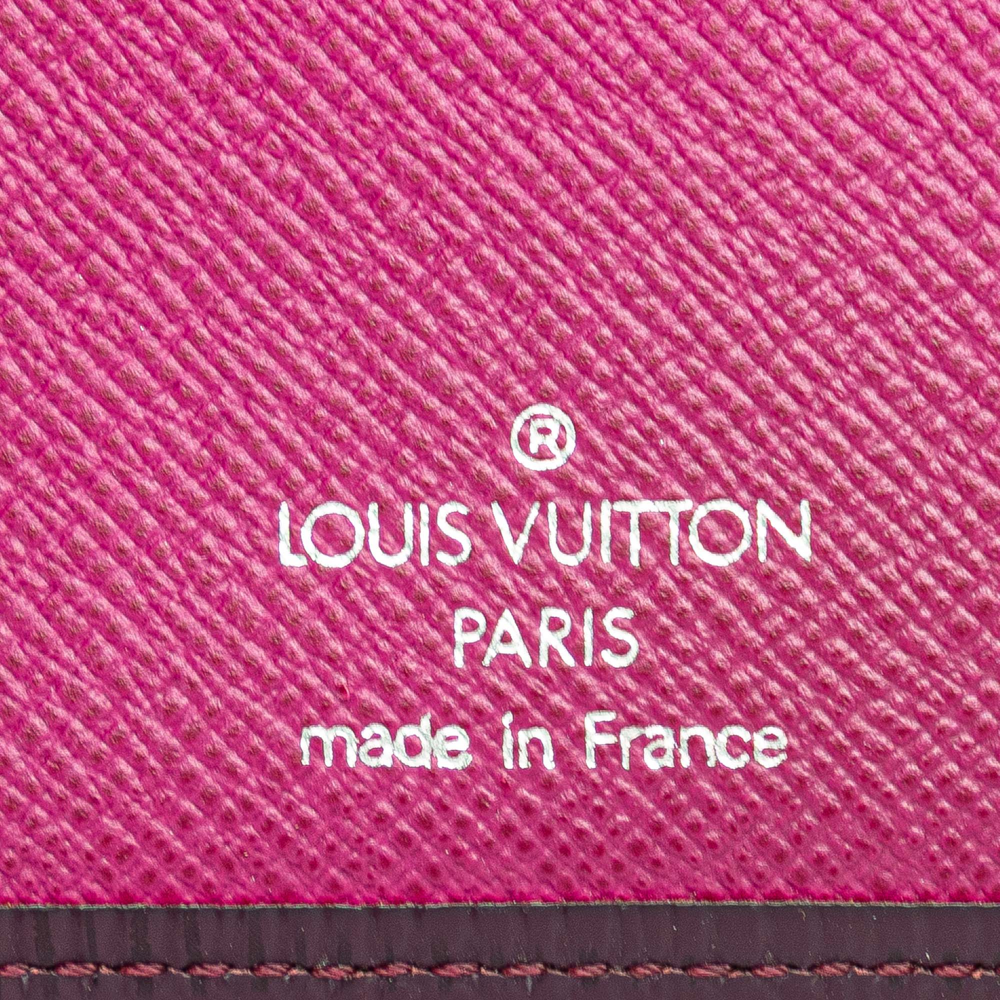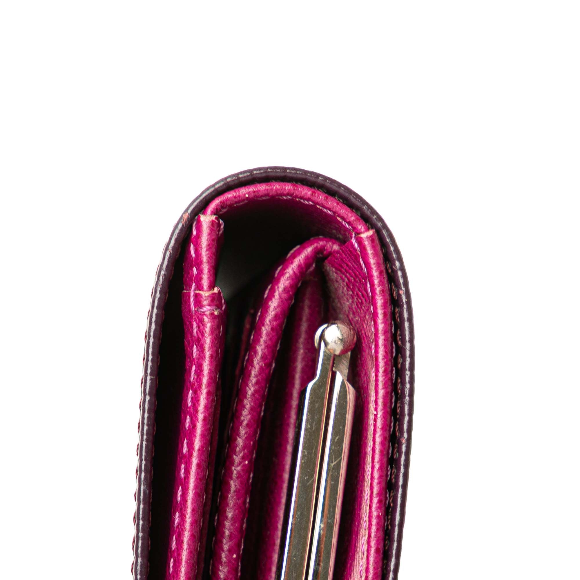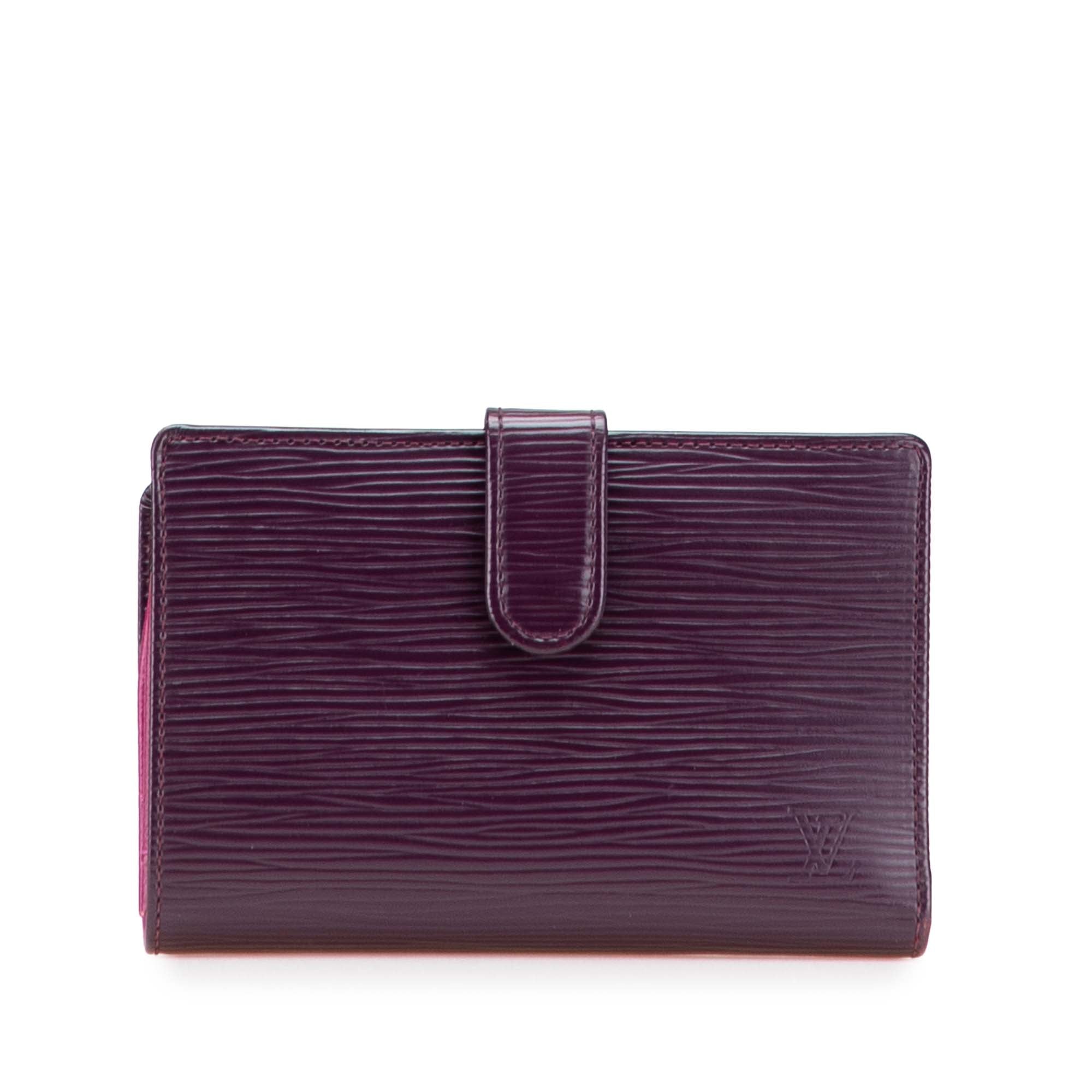 This wallet features an epi leather body, a top strap with a snap button closure, an exterior back compartment with a kiss lock closure, and interior slip pockets. Retail Price: 905.00