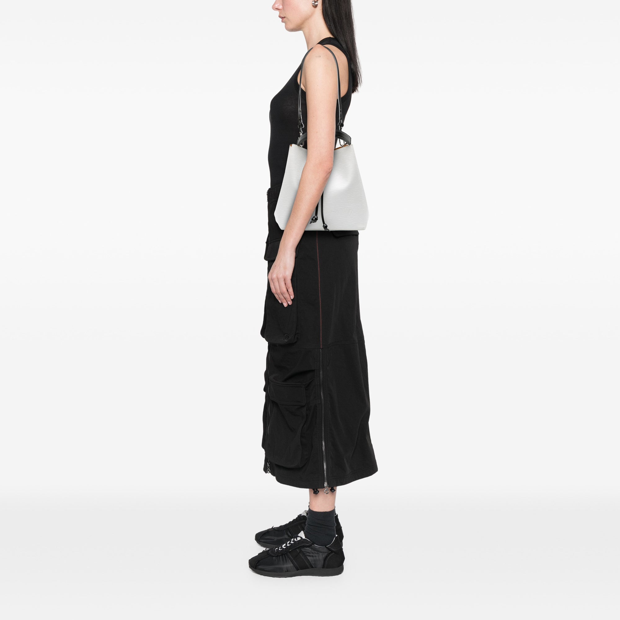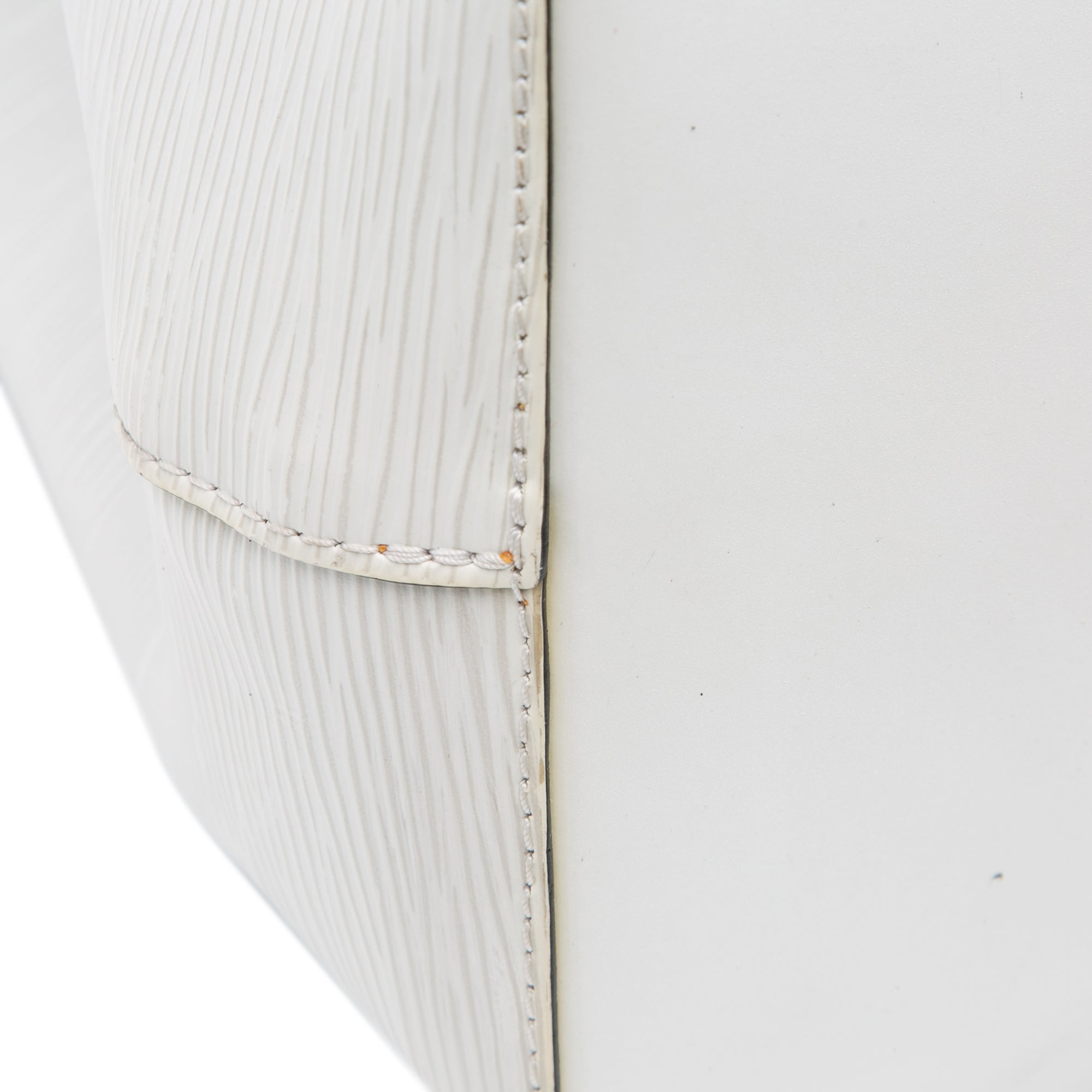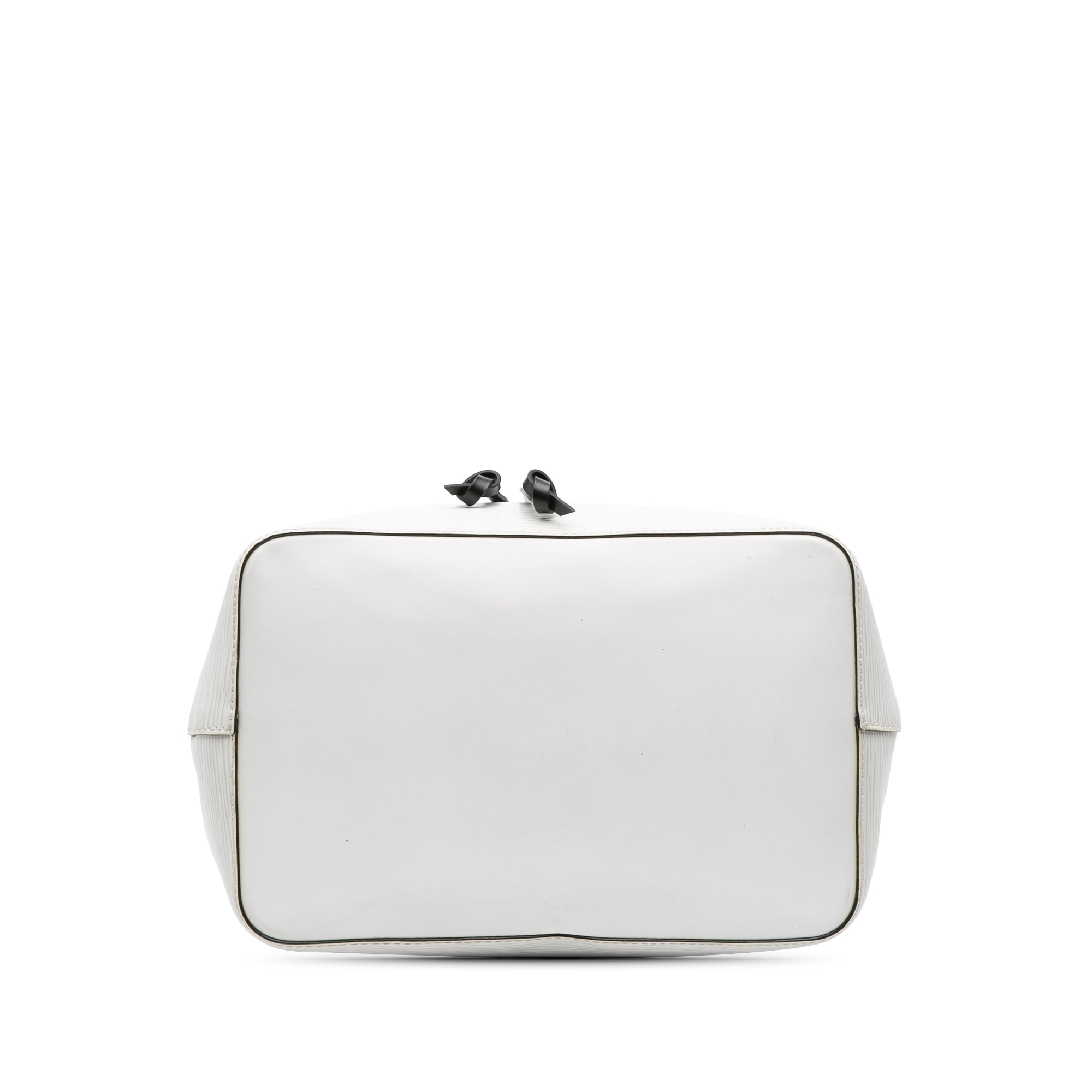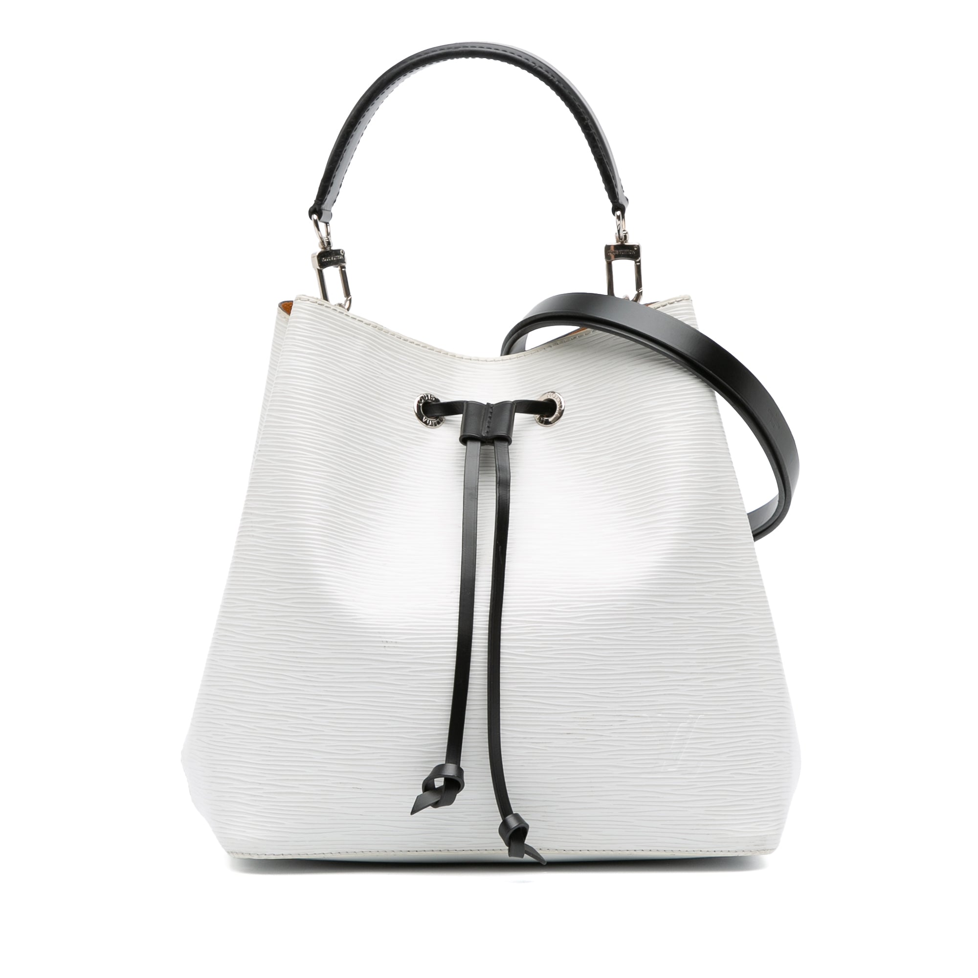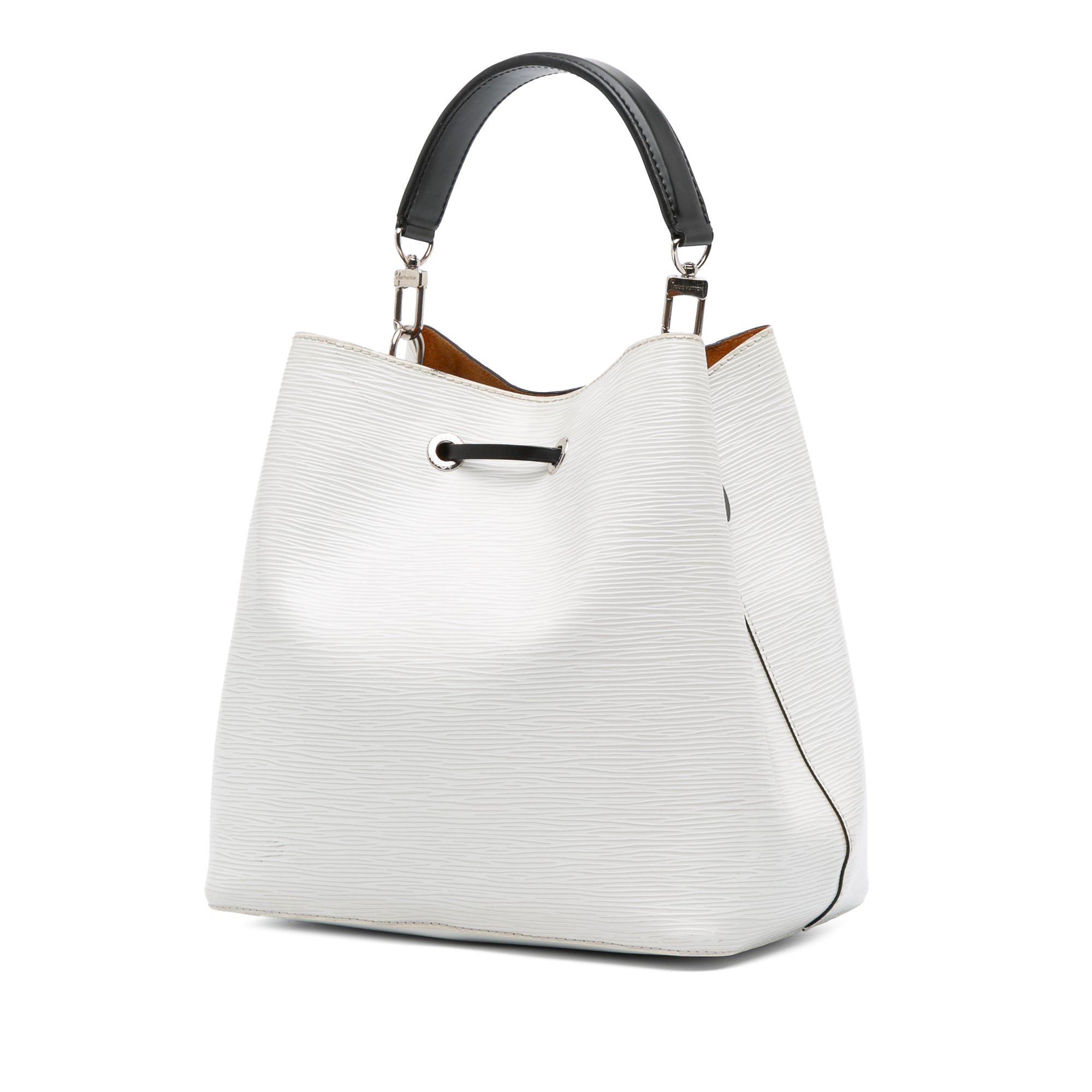 The NeoNoe MM features an epi leather body, a flat leather handle, a detachable flat leather strap, an open top with a drawstring closure, and an interior zip compartment. Retail Price: 2570.00