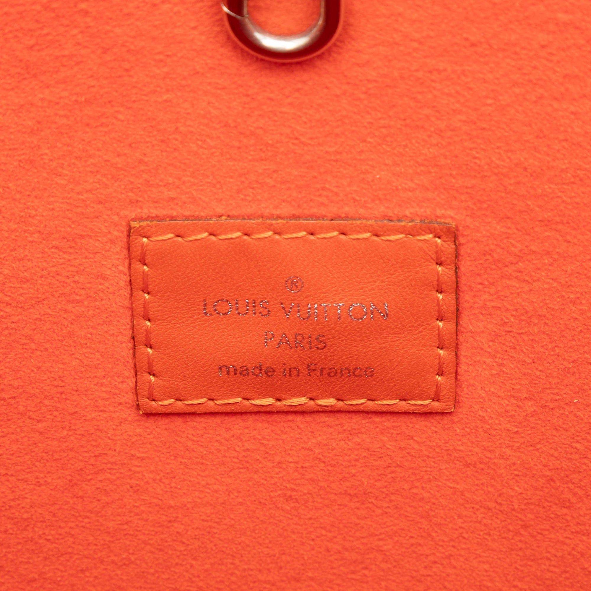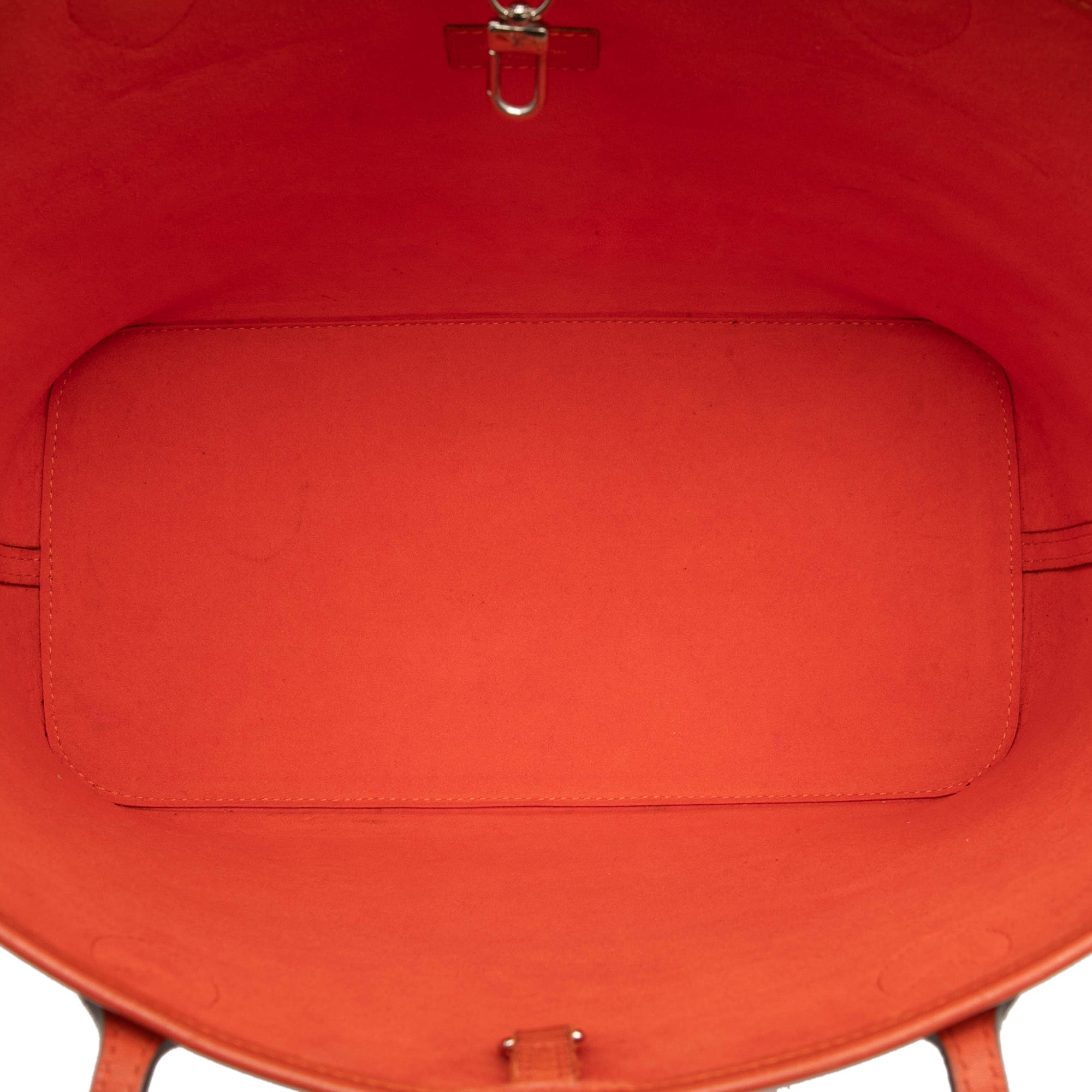 The Neverfull MM features an epi leather body, flat leather handles, an open top with a lobster clasp closure, and a pouch inclusion. Retail Price: 2570.00