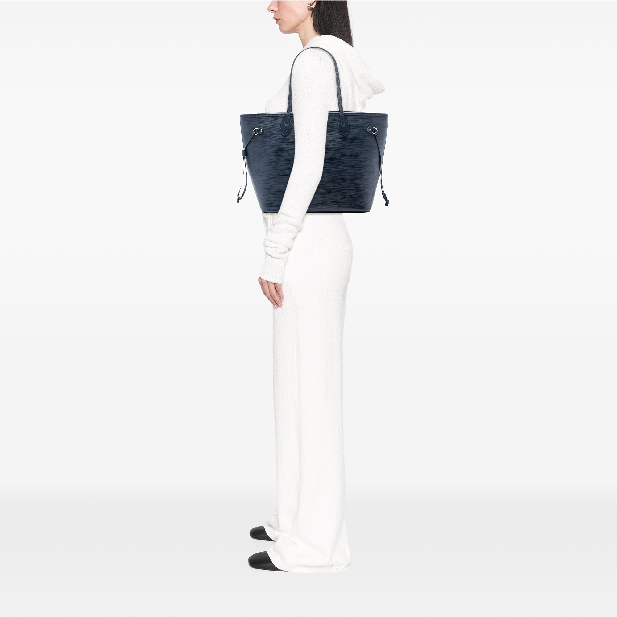 The Neverfull MM features an epi leather body, flat leather straps, and an open top with lobster clasp closure. Retail Price: 2450.00
