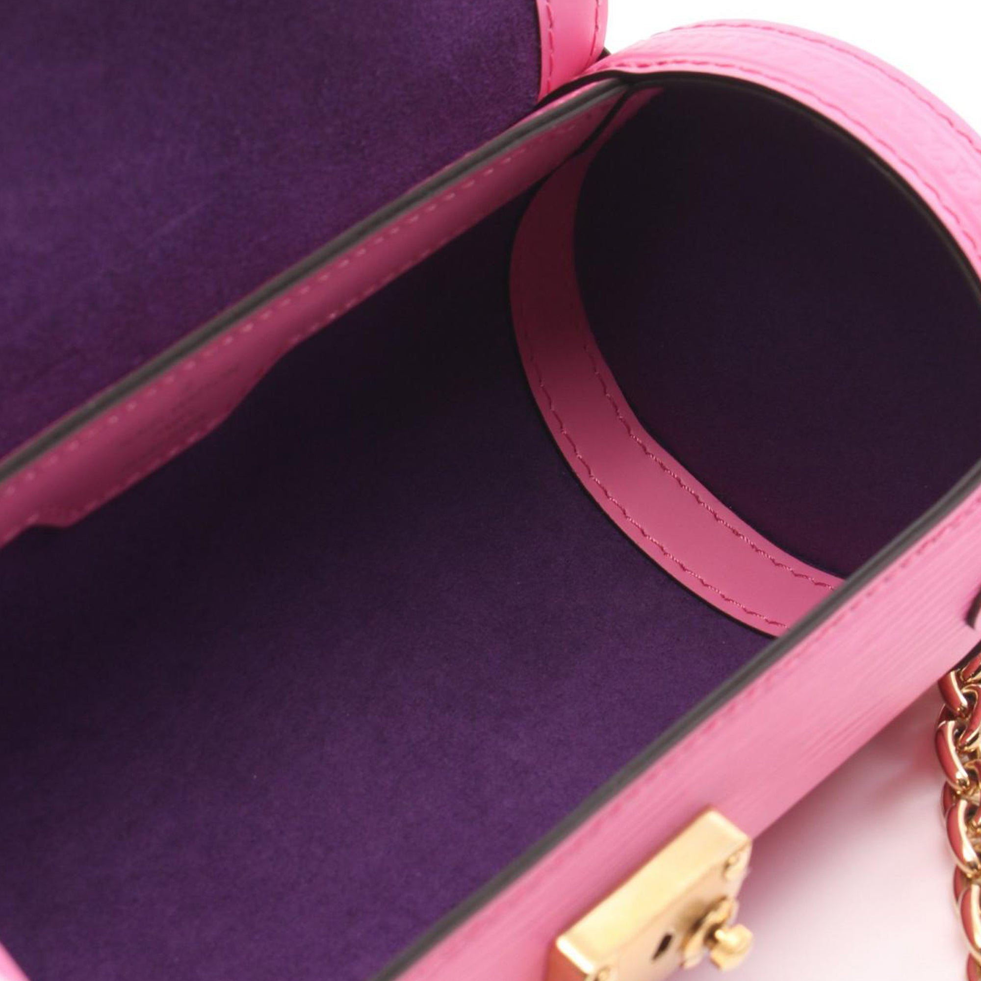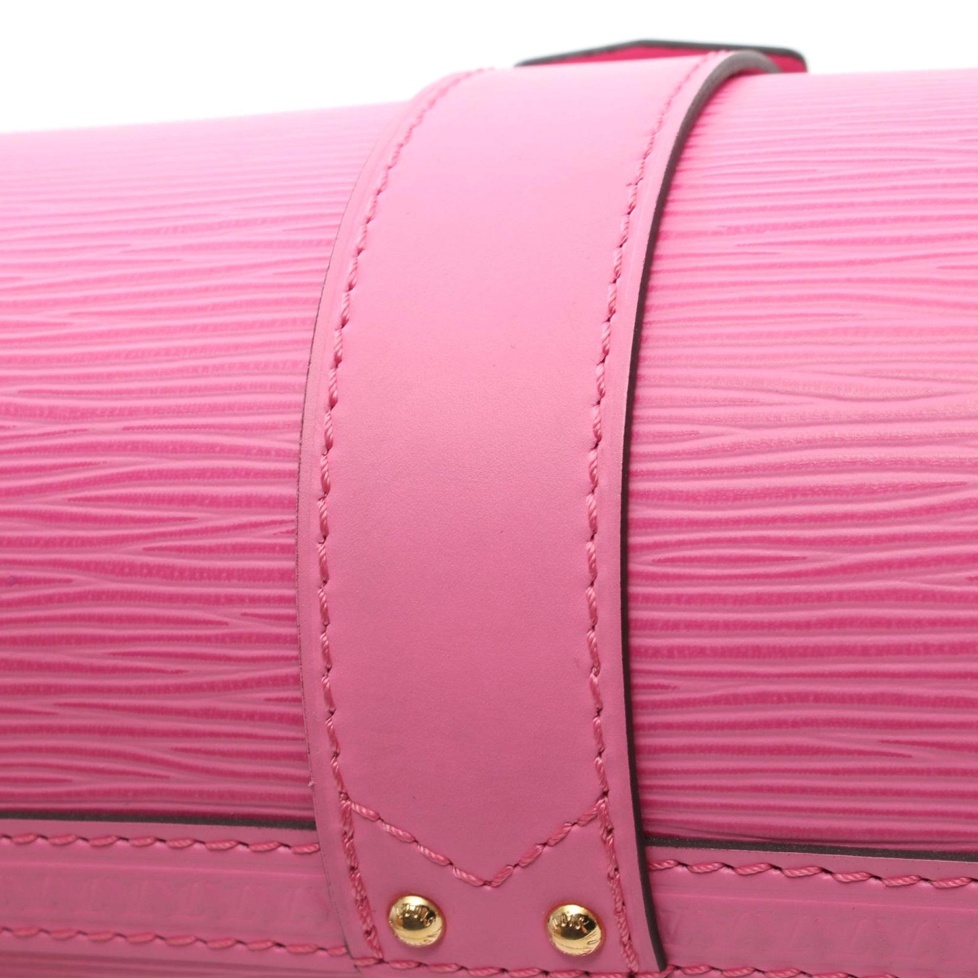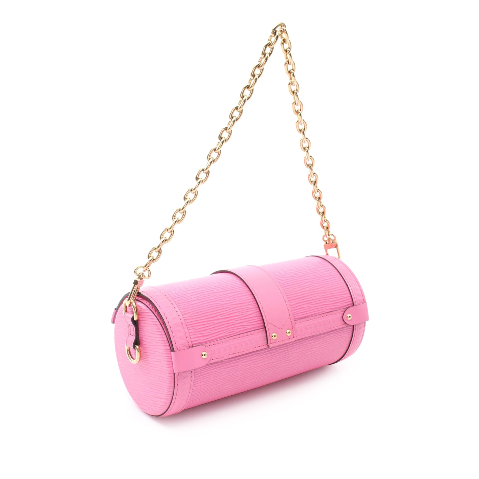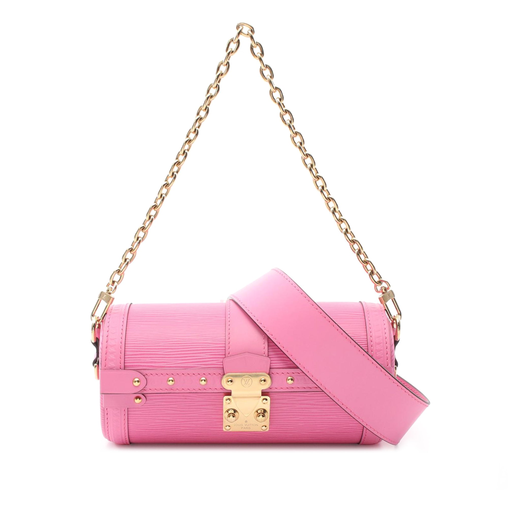 The Papillon Trunk features an epi leather body, a detachable gold-tone chain link handle, a detachable flat leather strap, and a top flap with S-lock closure. Retail Price: 2910.00