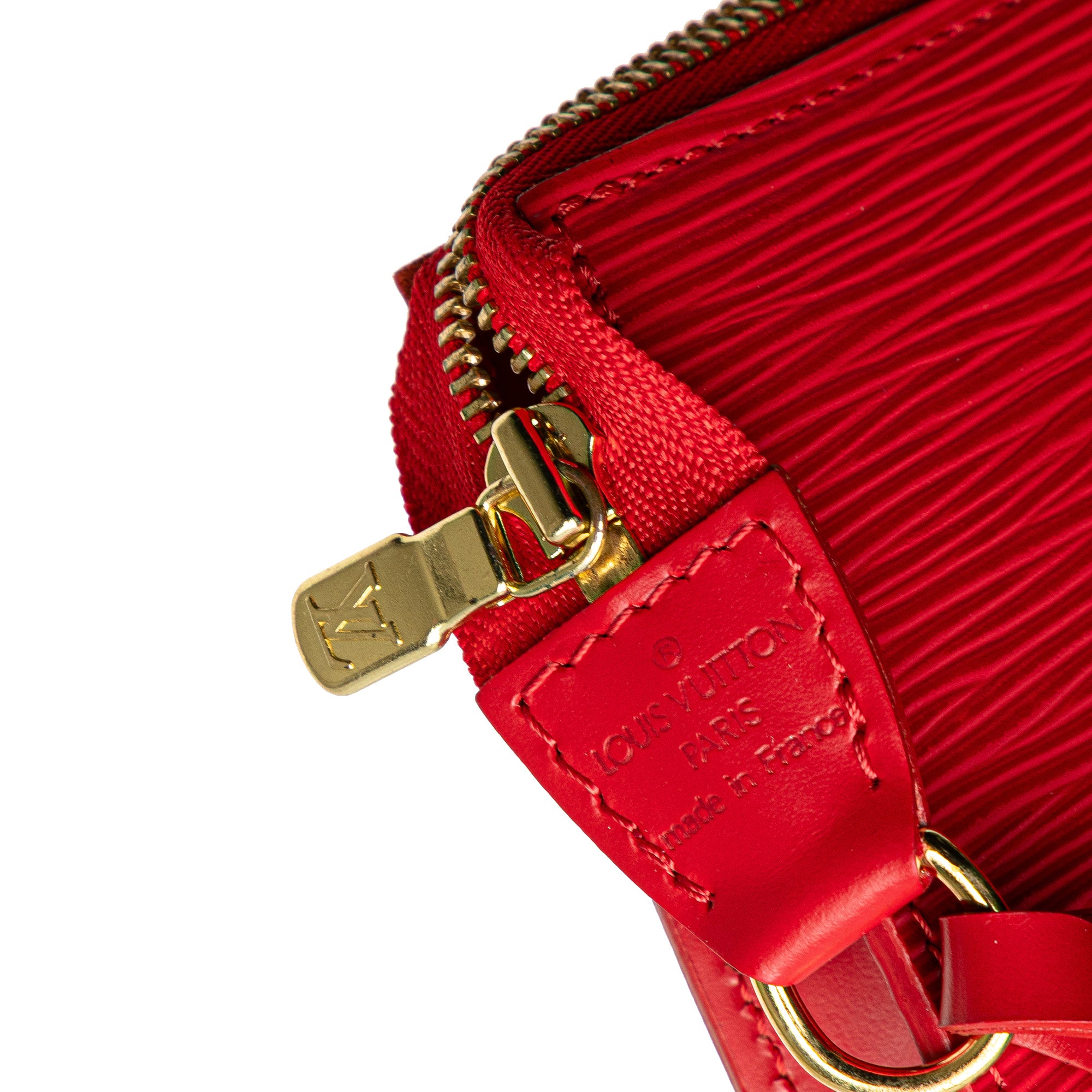The Pochette Accessoires features an epi leather body, a flat leather shoulder strap, and a top zip closure. Retail Price: 990.00