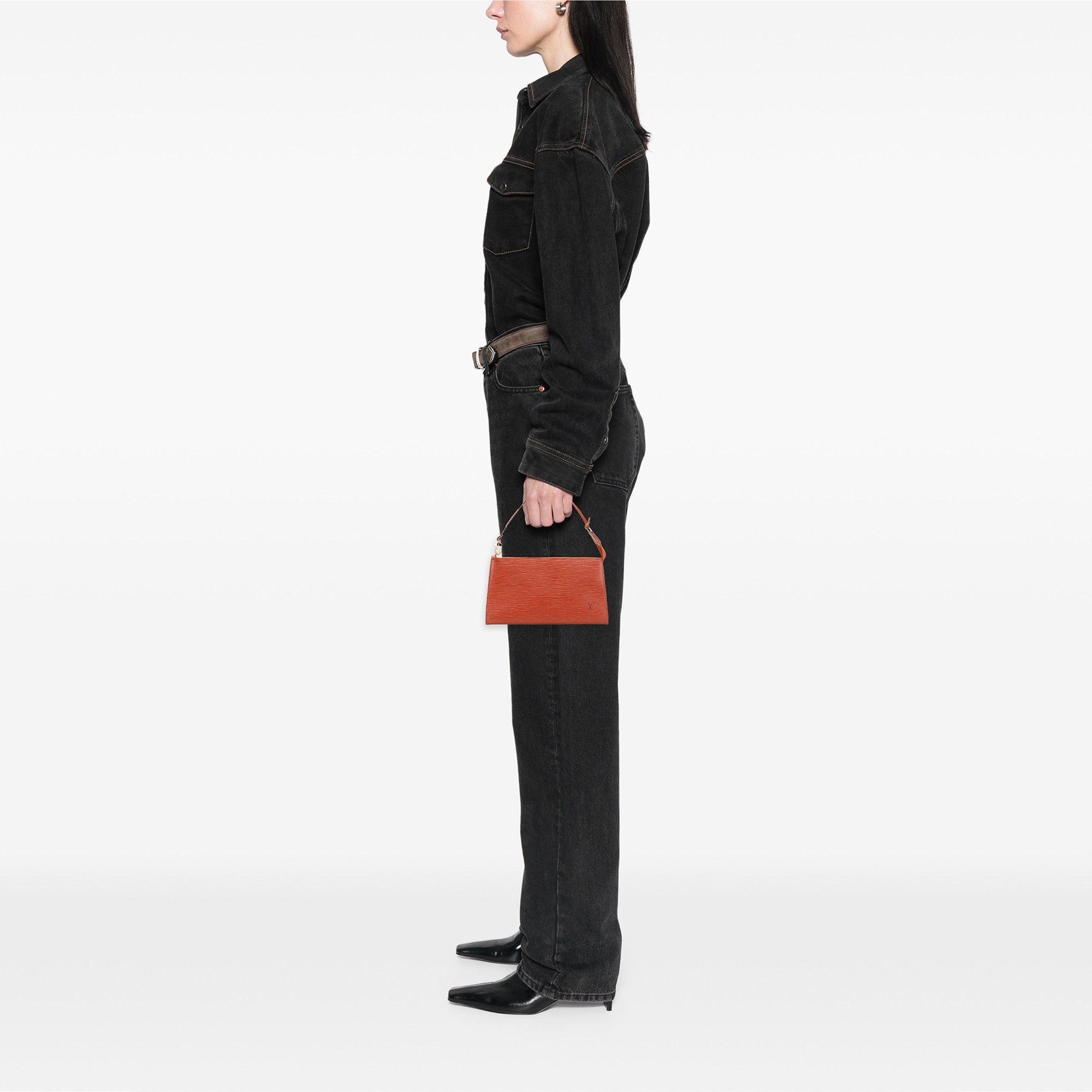 The Pochette Accessoires features an epi leather body, a flat shoulder strap, and a top zip closure. Retail Price: 773.00