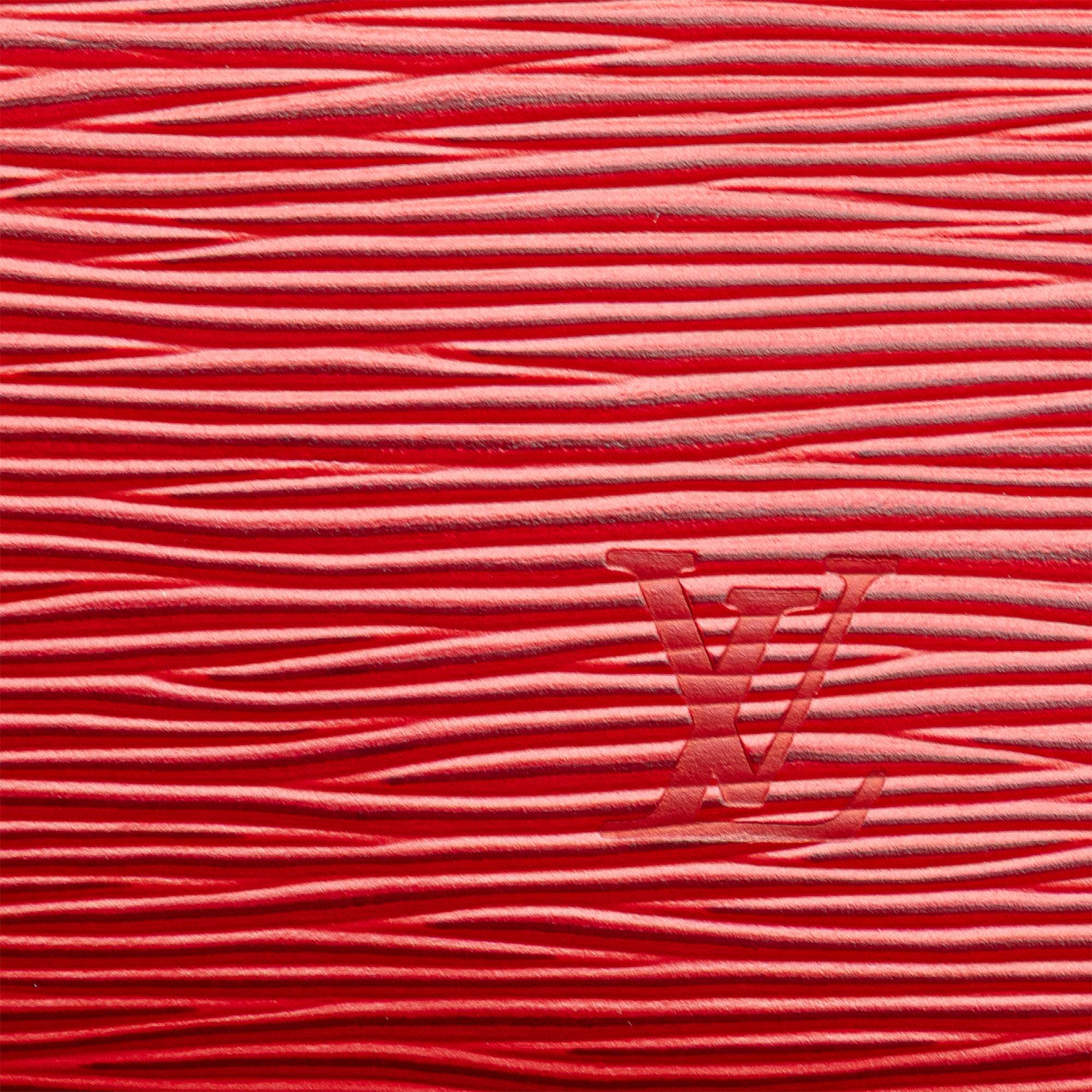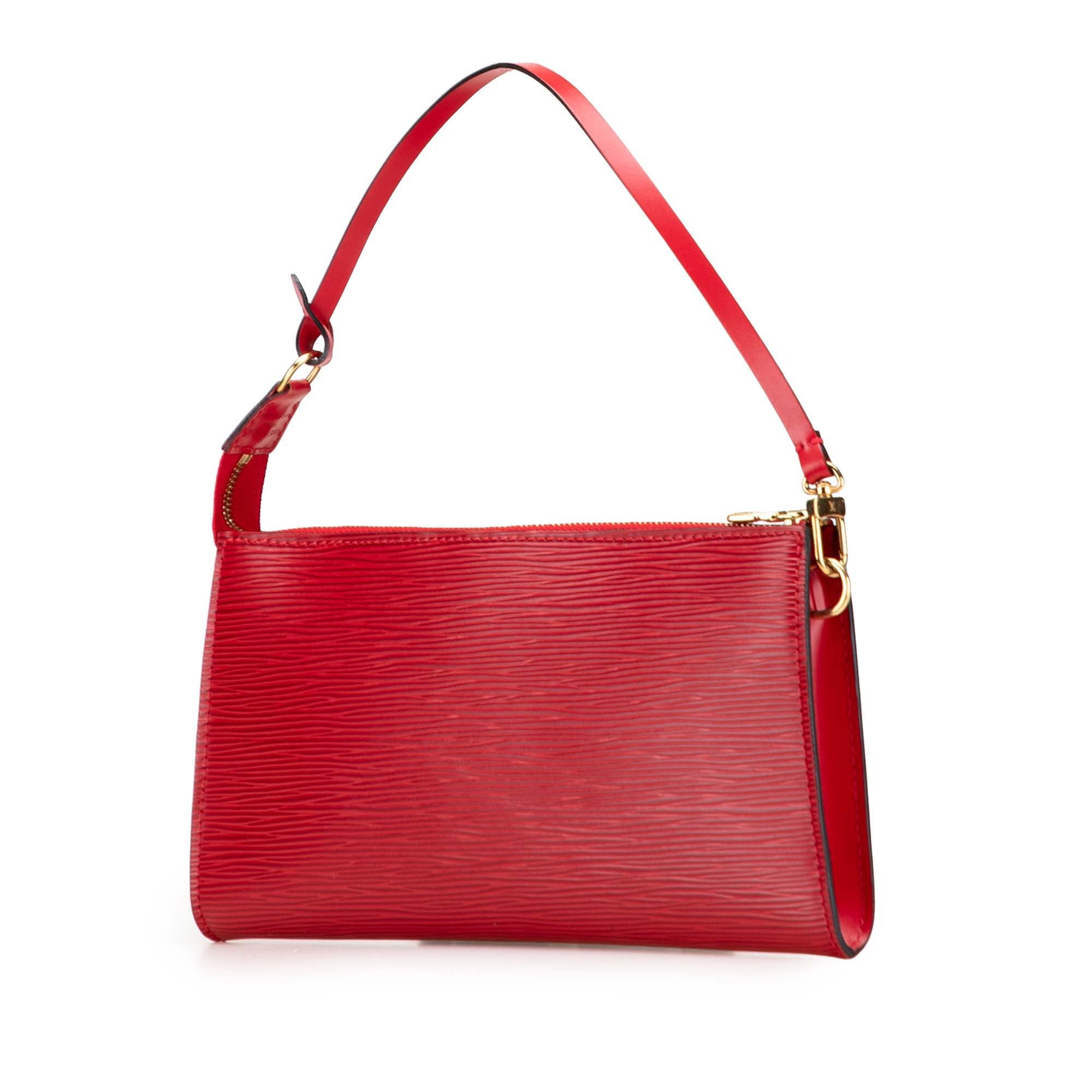 The Pochette Accessoires features an epi leather body, a flat leather shoulder strap, and a top zip closure. Retail Price: 990.00