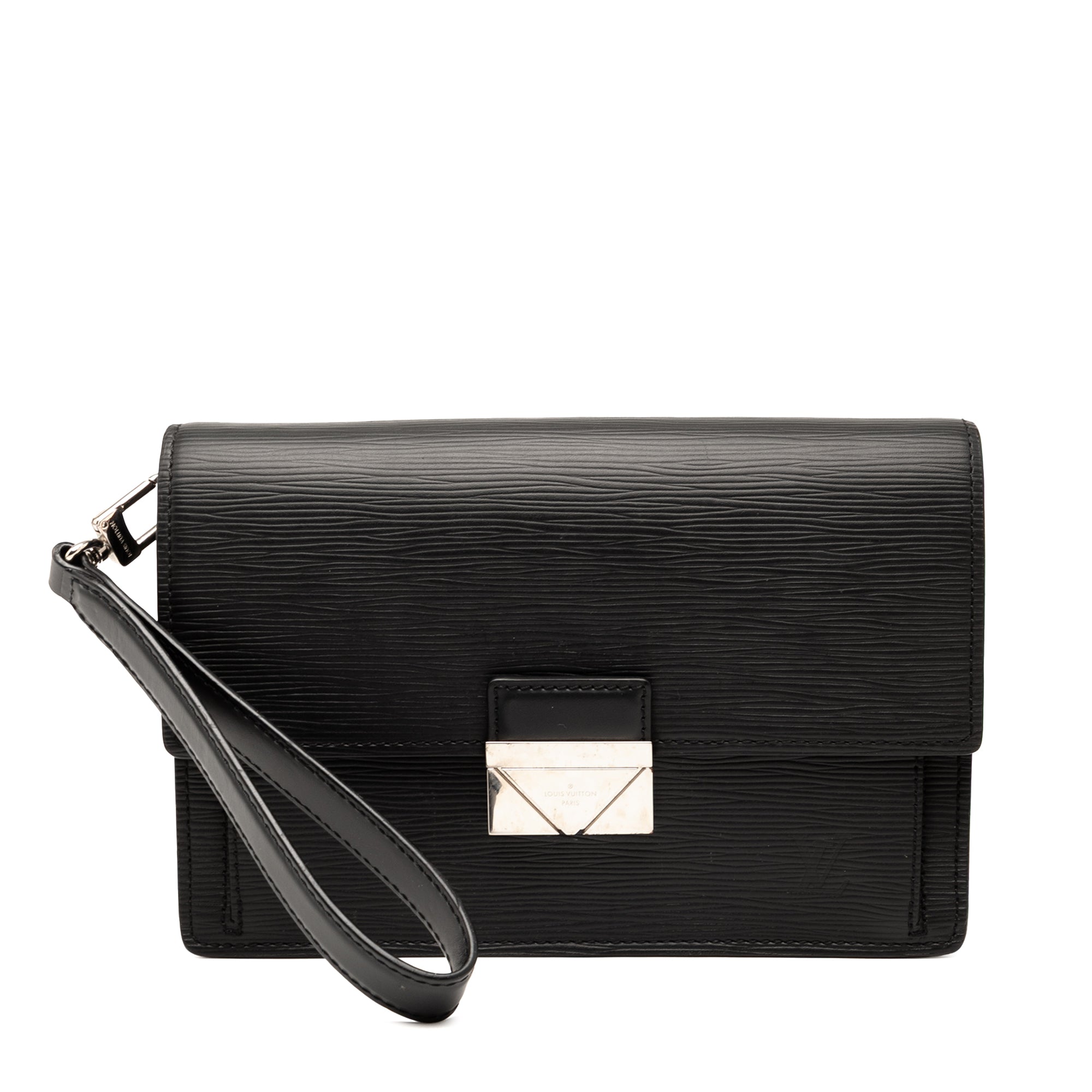 This clutch bag features an epi leather body, a flat leather wrist strap, a front flap with a push lock closure, an exterior back slip pocket, and interior zip and slip pockets. Retail Price: 1900.00