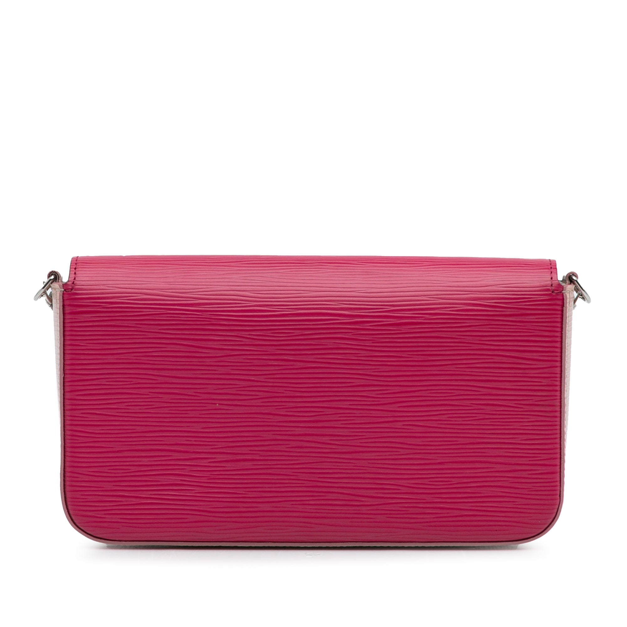 The Pochette Felicie features an epi leather body, a detachable chain strap, a flap with a snap button closure, a zip pouch, and interior slip pockets. Retail Price: 1620.00