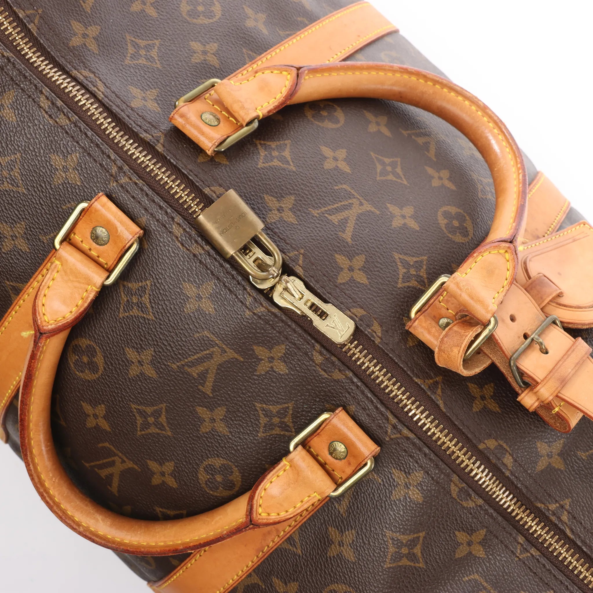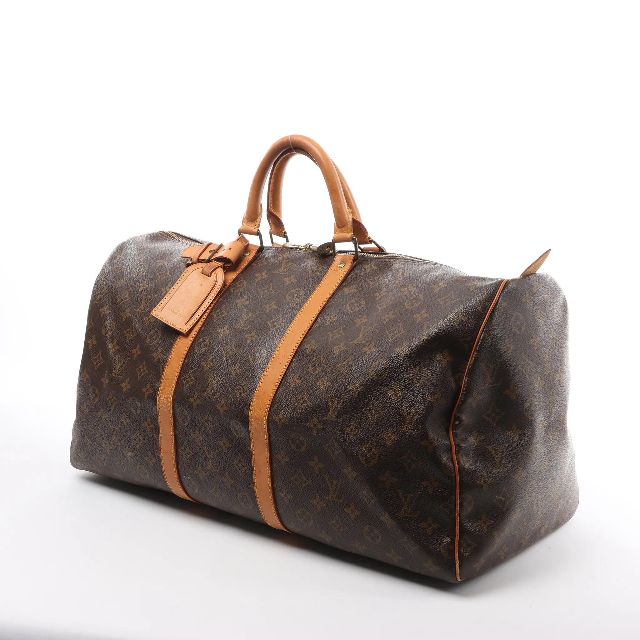 Brand: Louis VuittonModel: KeepallSize: 55Width: 56 cmHeight: 30.5 cmExterior Condition: Very goodInterior Condition: Very goodCondition Details: The exterior canvas is clean and beautiful, in excellent condition with light creases. The cowhide leather trim and handles are in great condition but have rubbings and water stains. The gold hardware has darkened. The interior is in good condition, except some stains. Date code: MI1910.Colour: BrownInterior Colour: BrownHardware Colour: GoldMaterial: Leather, CanvasComes With: Luggage tag, padlock (keys are missing)