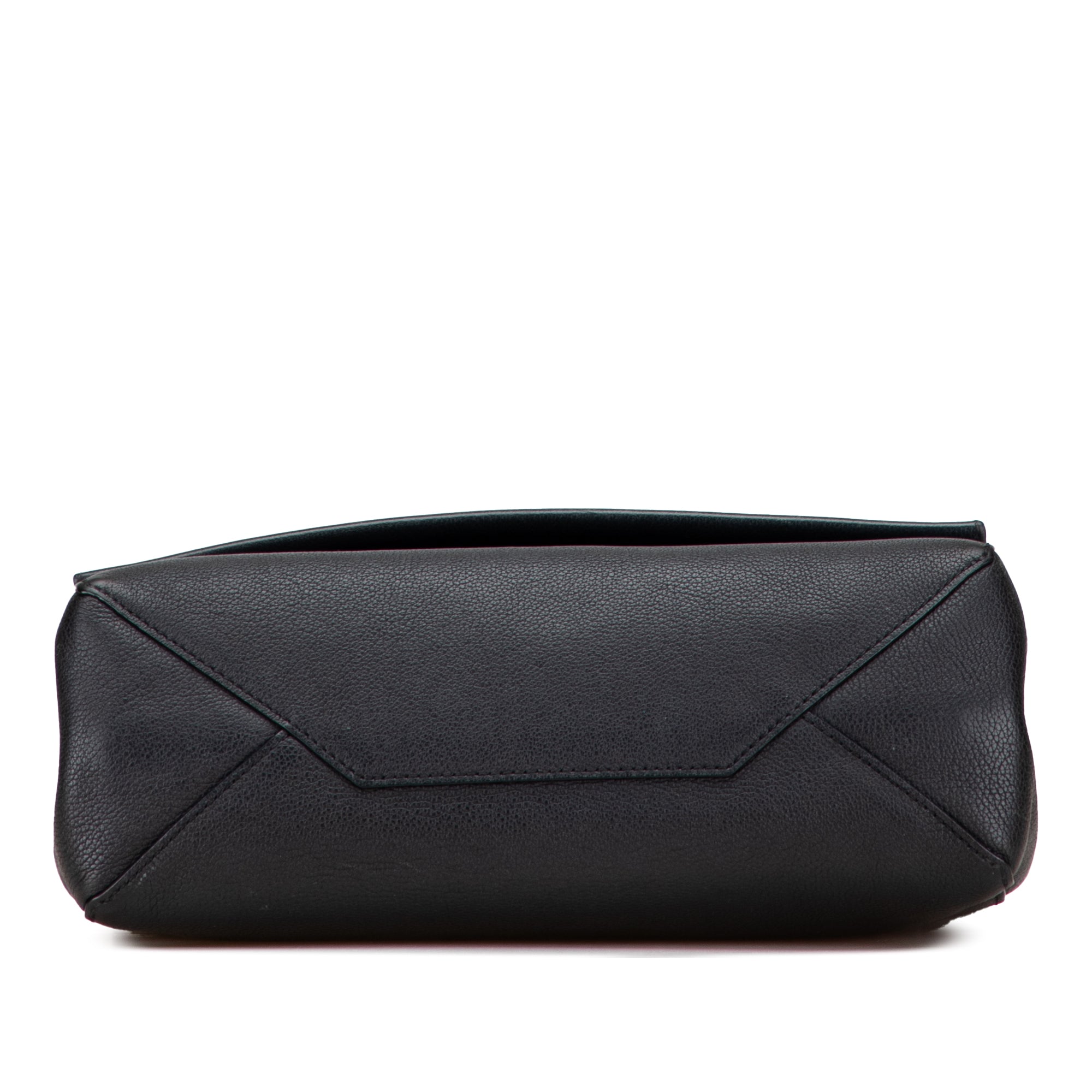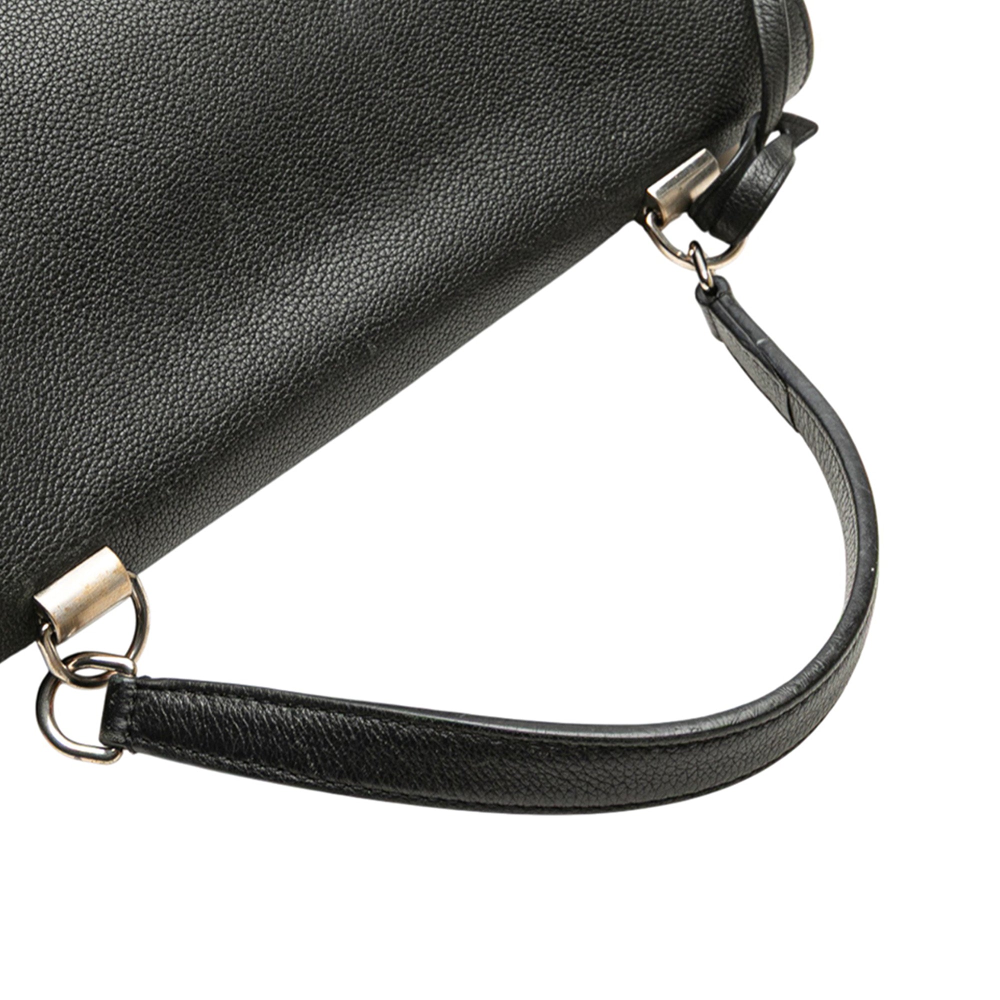 The LockMe II features a leather body, a flat leather handle, a detachable flat leather strap strap, a front flap with twist lock closure, and an interior slip pocket. Retail Price: 2340.00