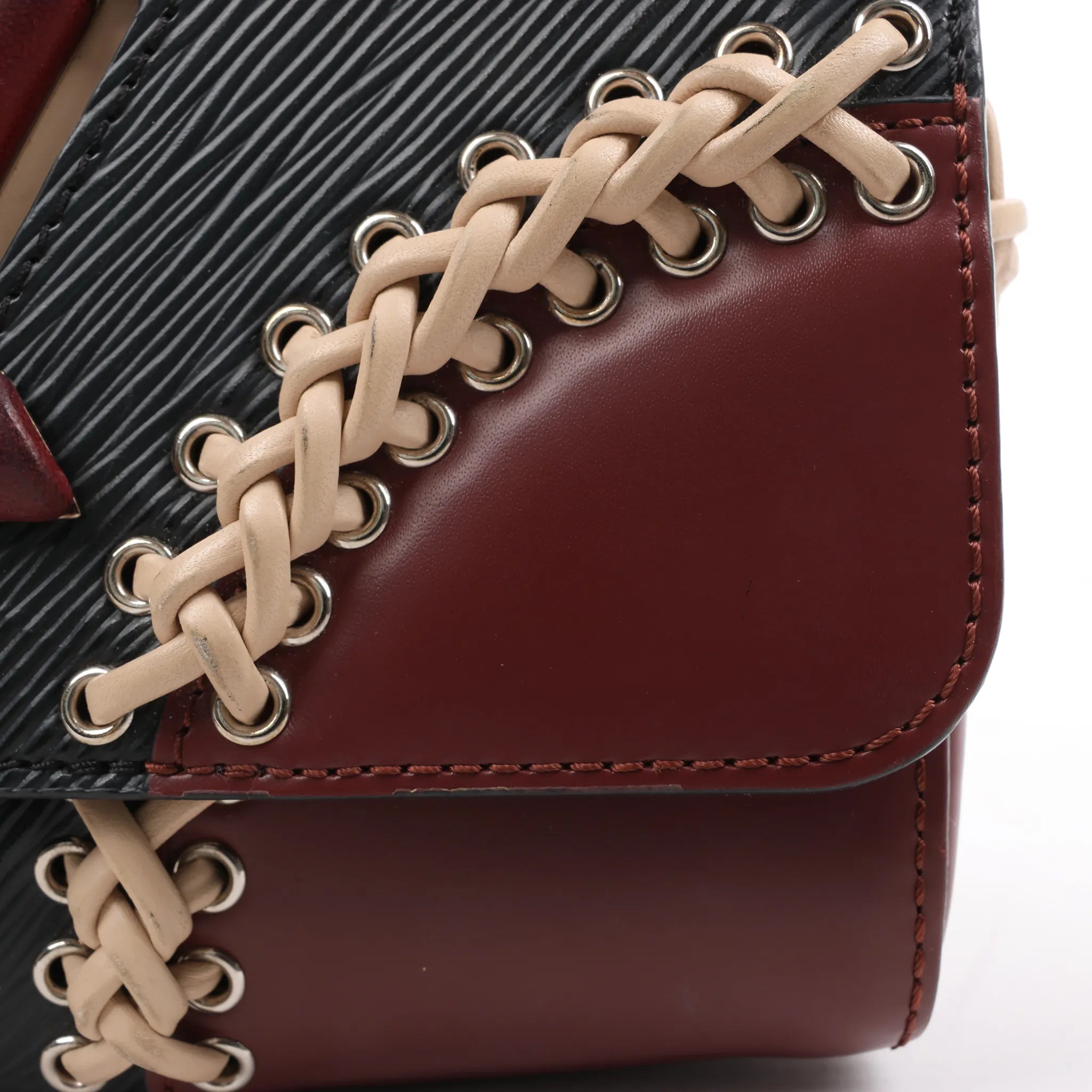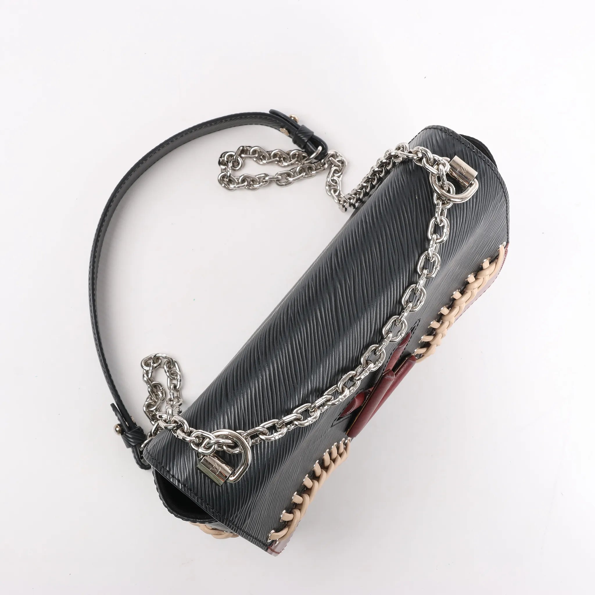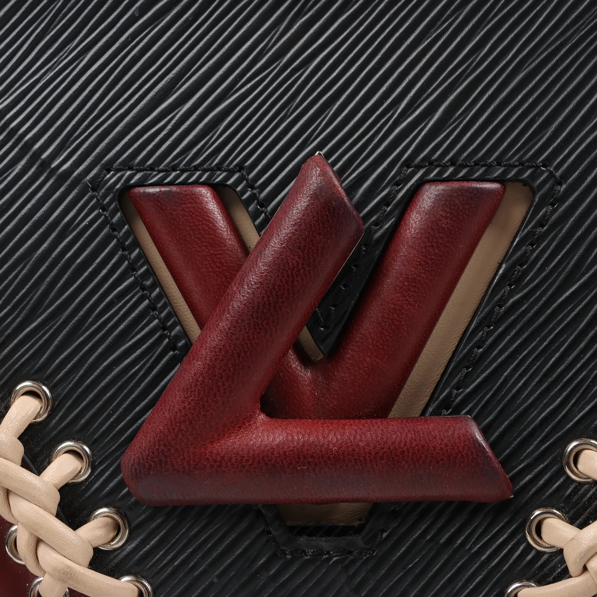 Make a bold statement with the Louis Vuitton Twist MM Shoulder Bag in black Epi leather (model M42449). Featuring a unique burgundy and beige lace-up detail, signature LV twist-lock, and silver-tone chain strap, this bag blends edgy craftsmanship with timeless luxury.