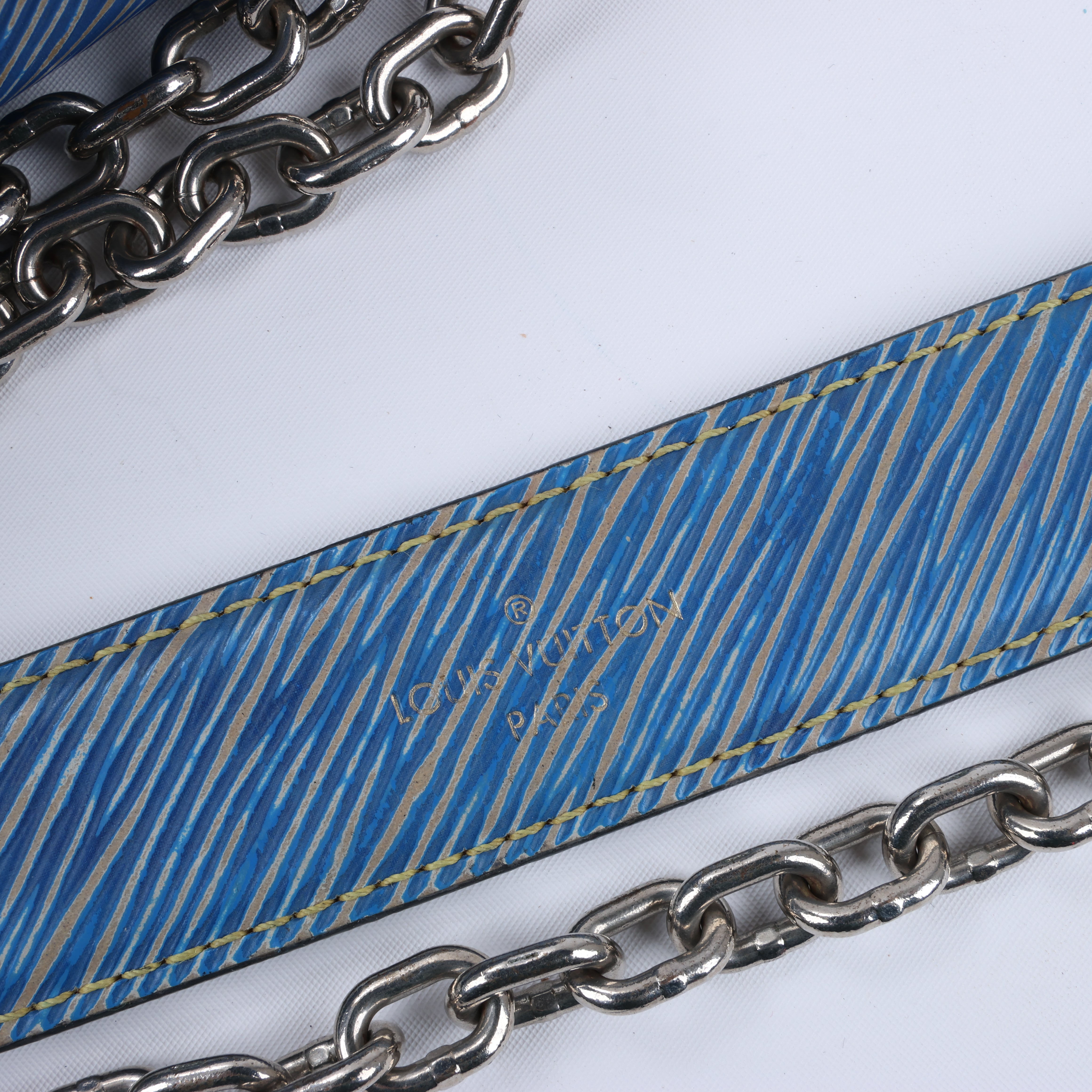 This Louis Vuitton Twist GM shoulder bag in denim blue Epi leather is effortlessly chic. Featuring the iconic LV twist-lock, a polished silver-tone chain strap, and a spacious interior, it combines modern elegance with everyday practicality.