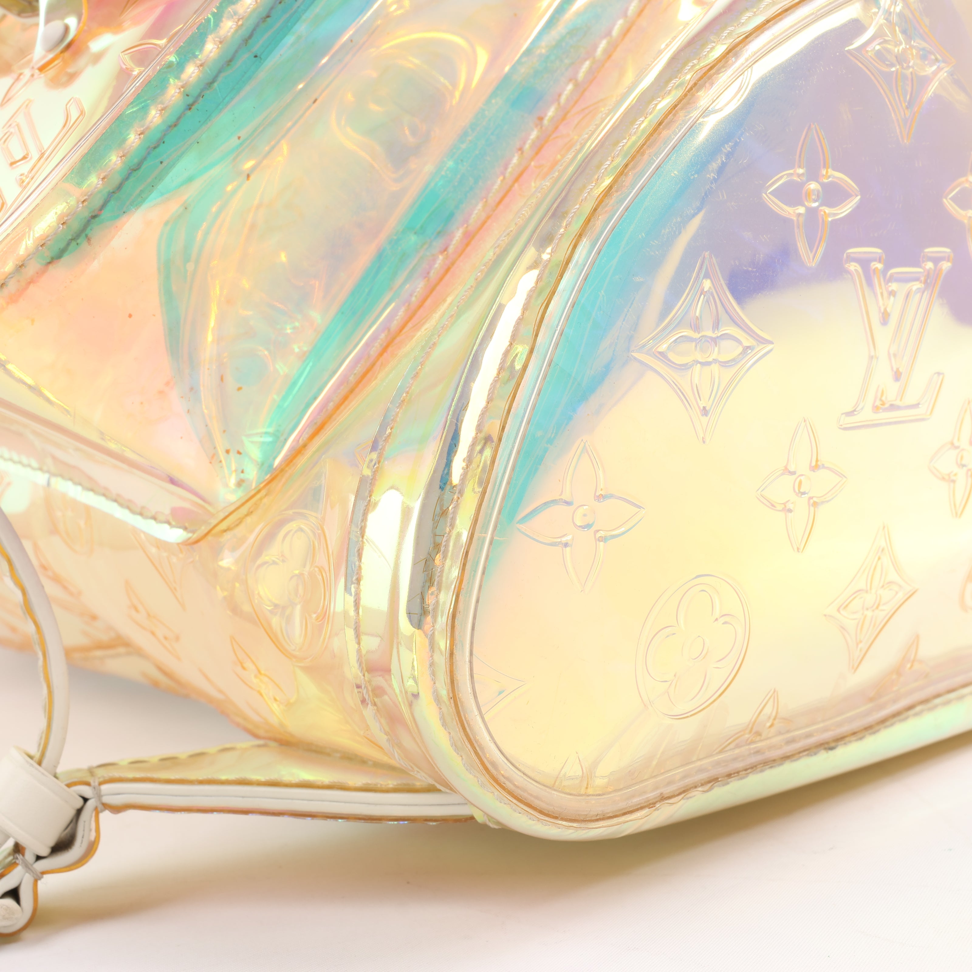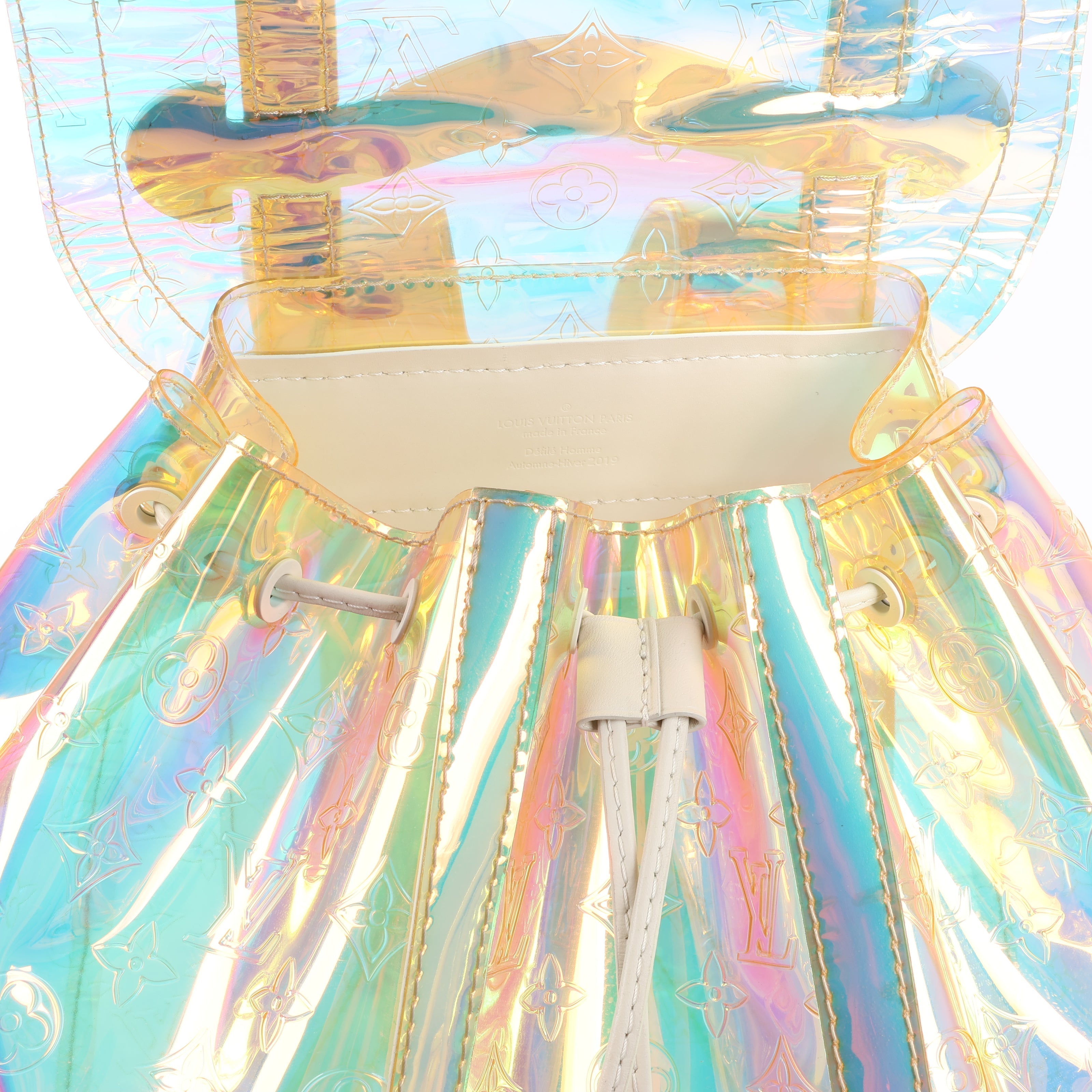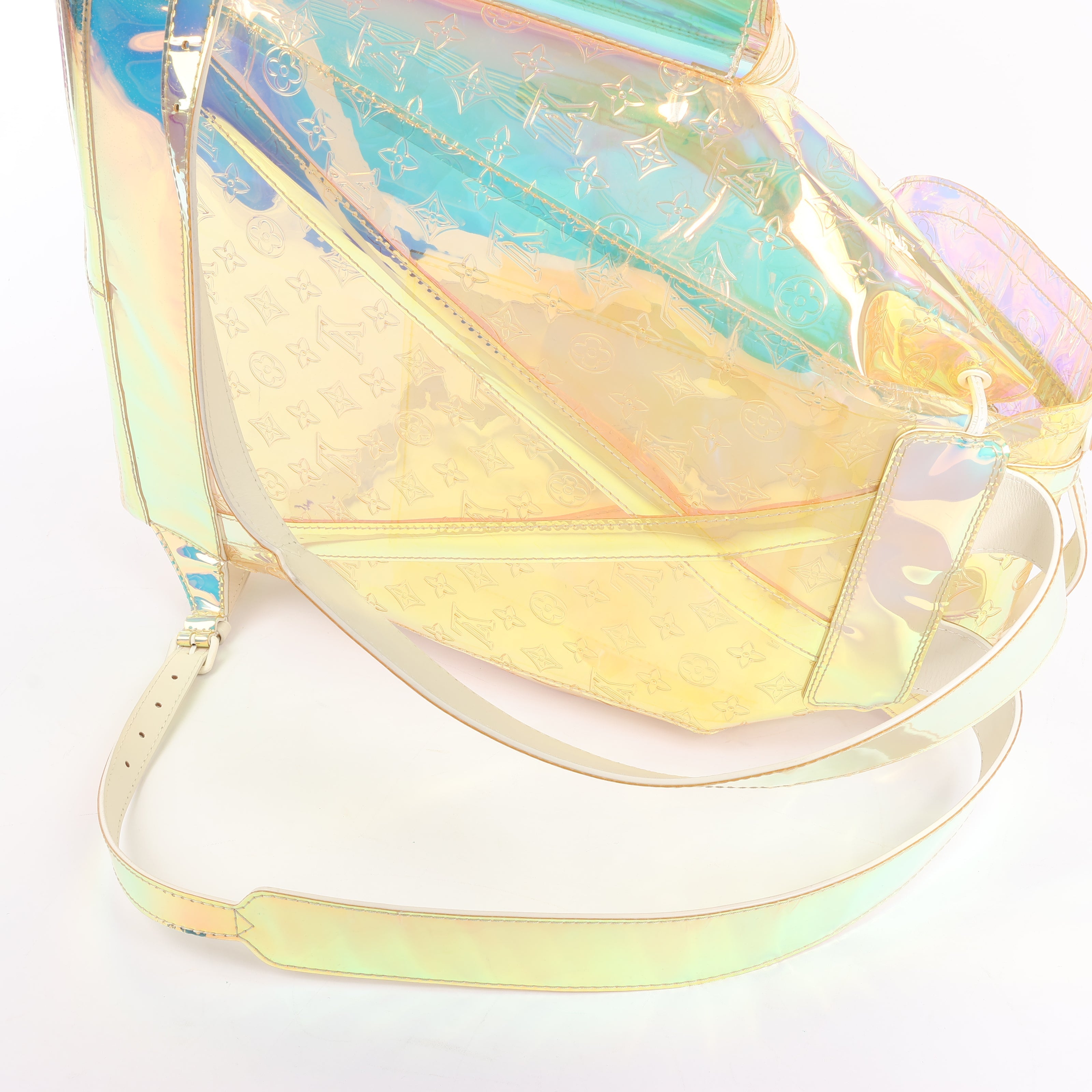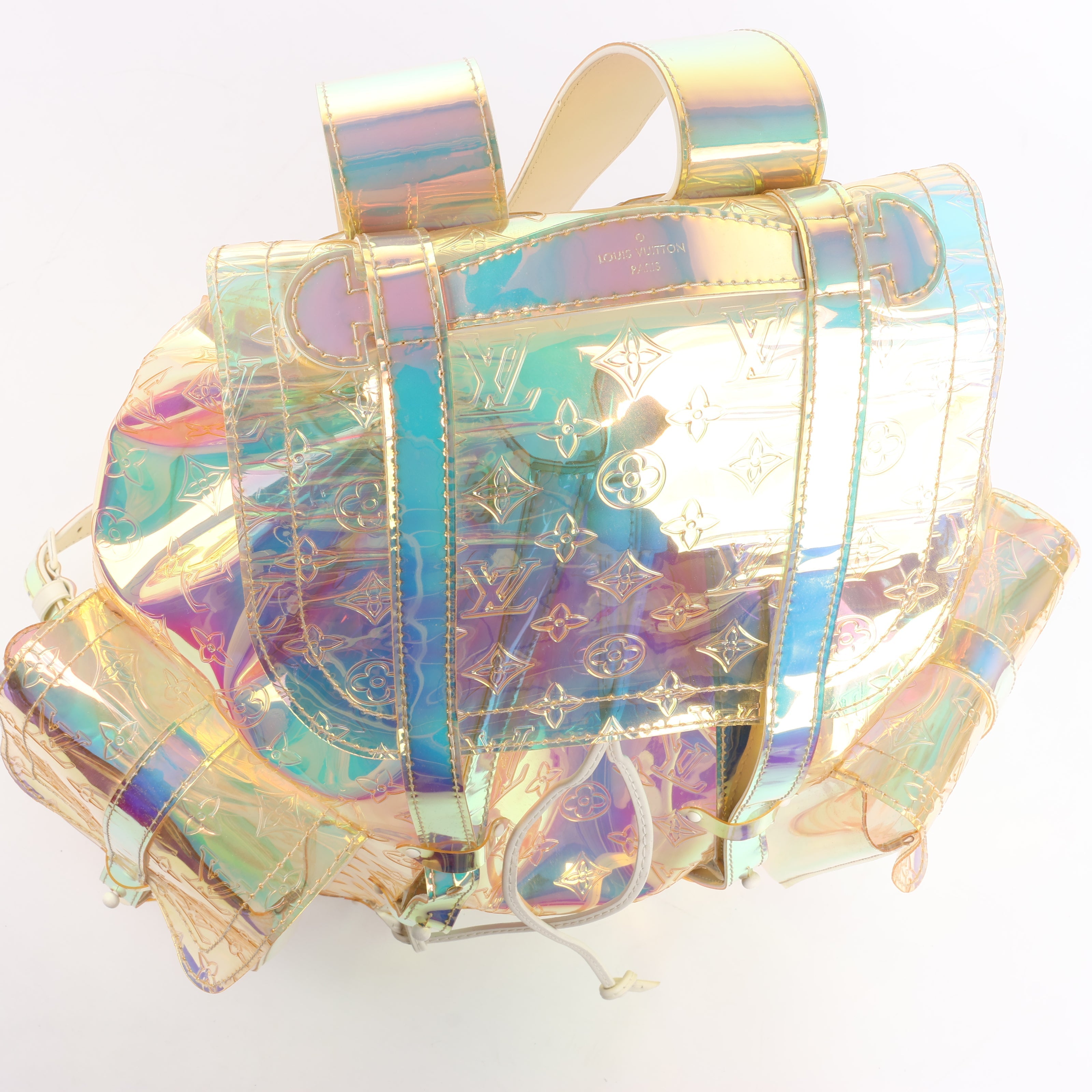 Louis Vuitton Monogram Prism Christopher GM Backpack in iridescent PVC with iconic monogram embossing. A futuristic, statement-making design combining luxury and innovation with spacious, functional style. Model M44766.