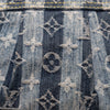 Introducing the limited edition Louis Vuitton Mini Pleaty Raye Bag, the stylish baguette crafted from fine striped denim and adorned with the iconic monogram print. With a beige leather shoulder strap, brass press lock, and orange suede interior, this bag is trendy and functional.