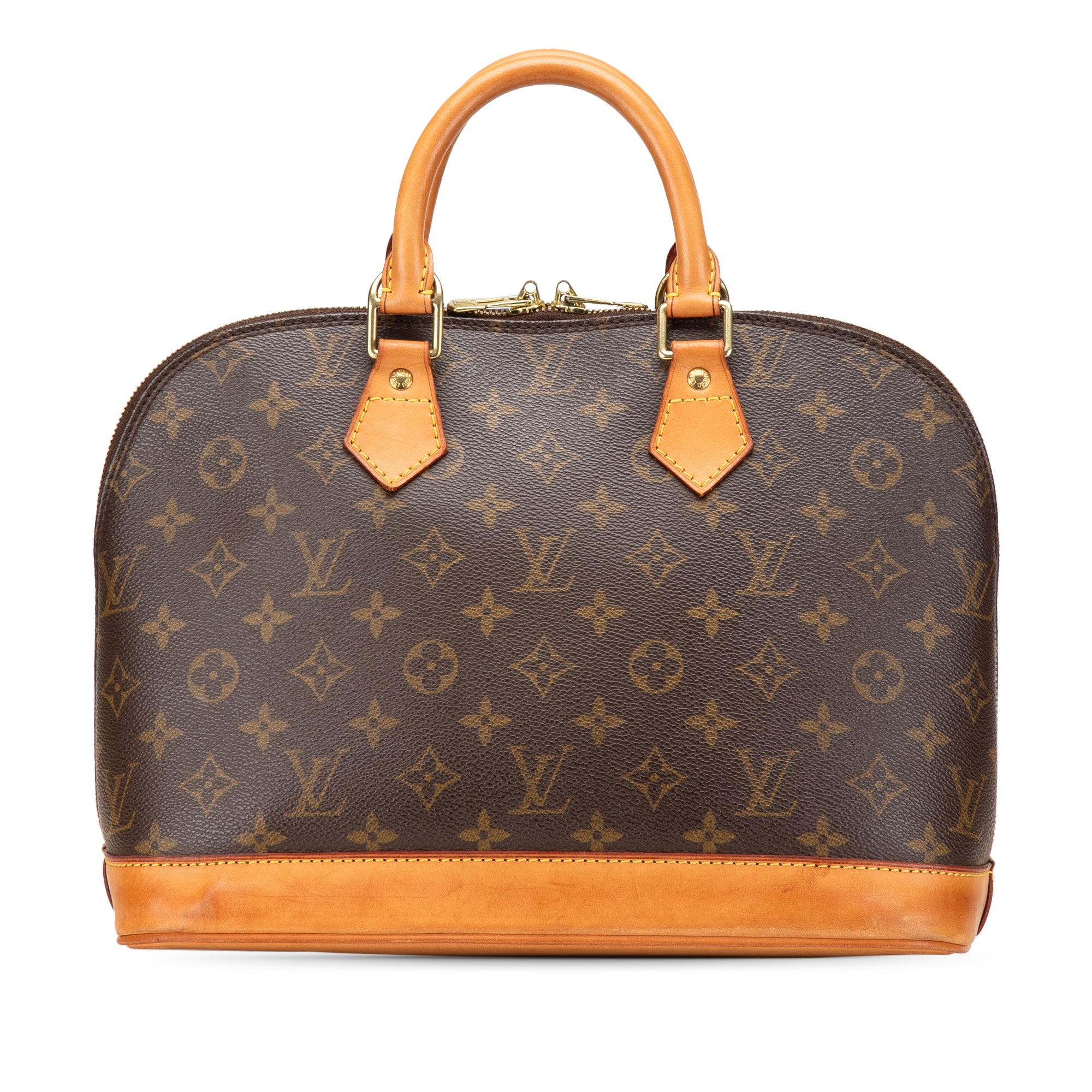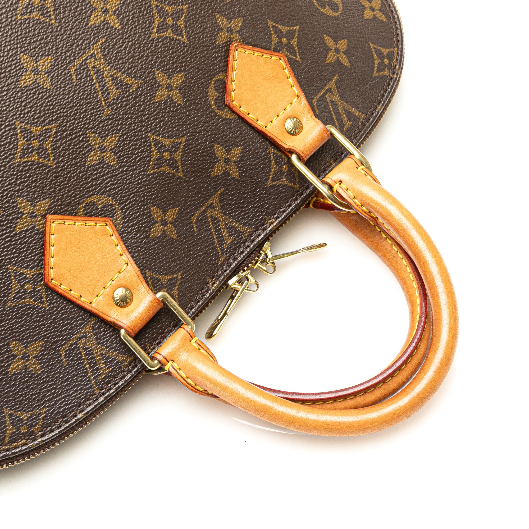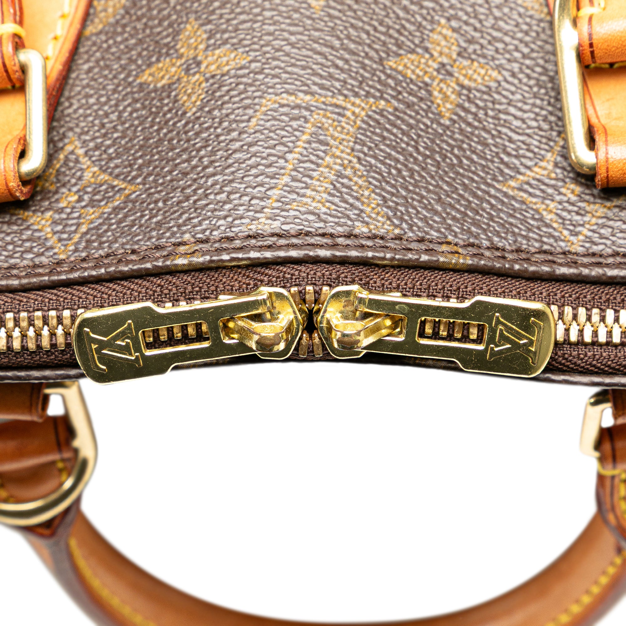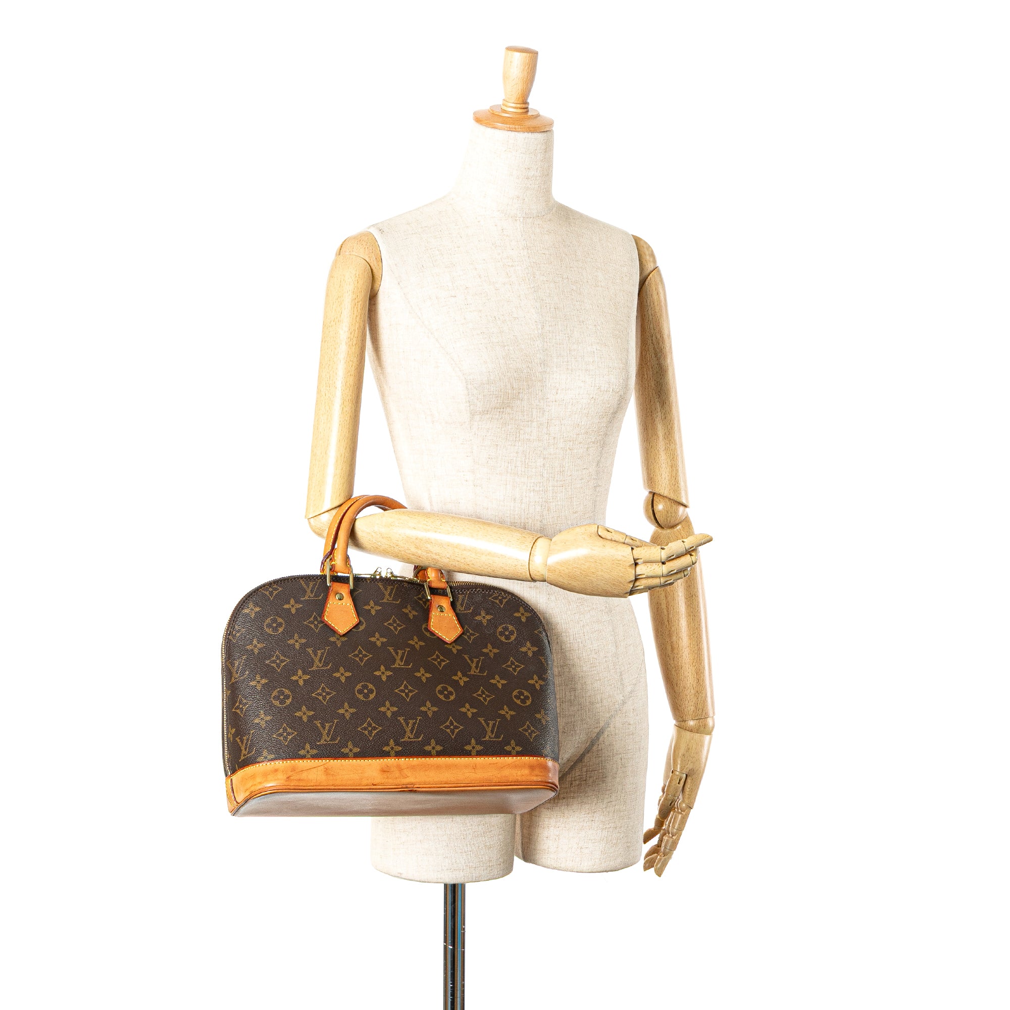 The Alma PM features a monogram canvas body with vachetta leather trim, rolled vachetta leather handles, a top zip closure, and an interior slip pocket. Retail Price: 1617.00