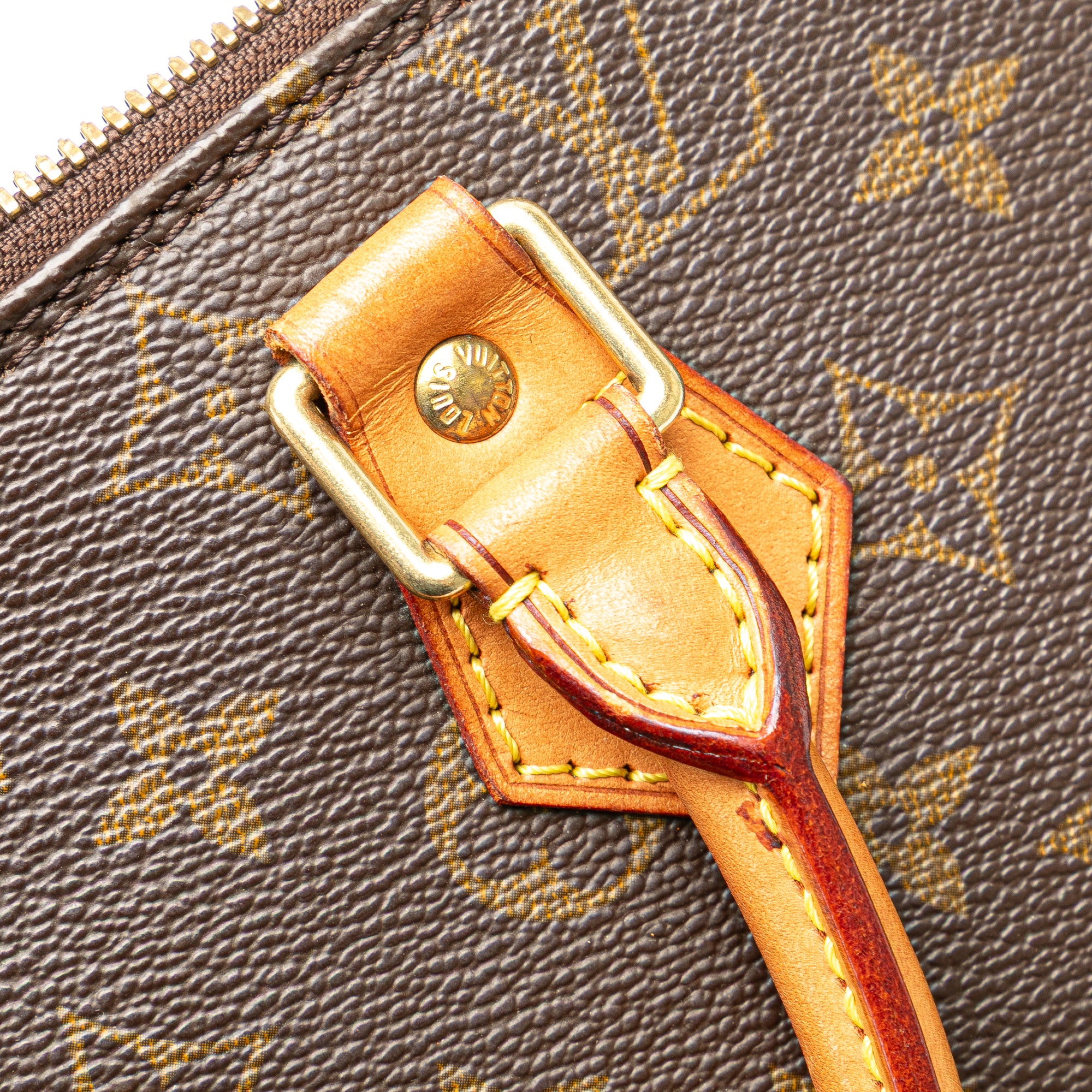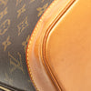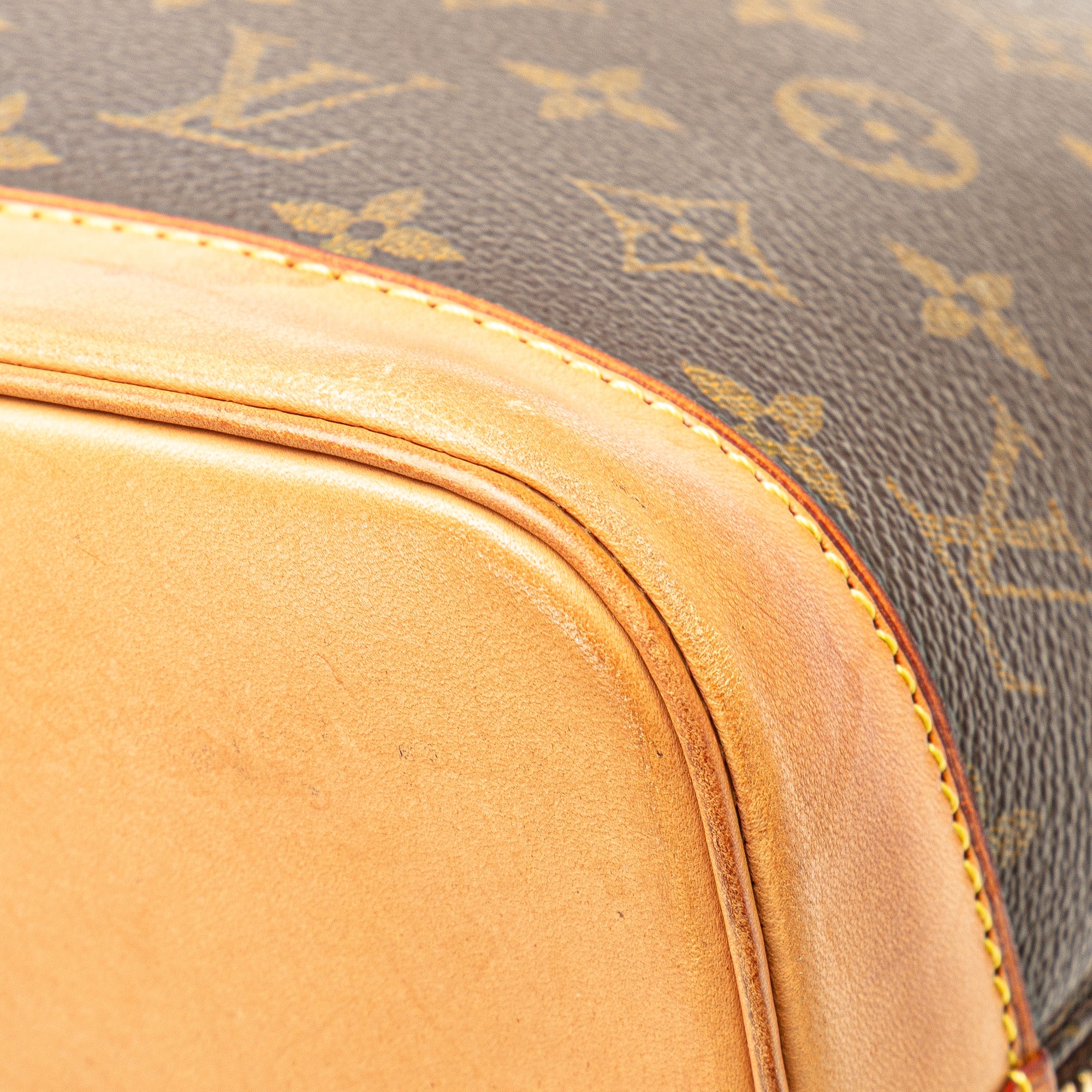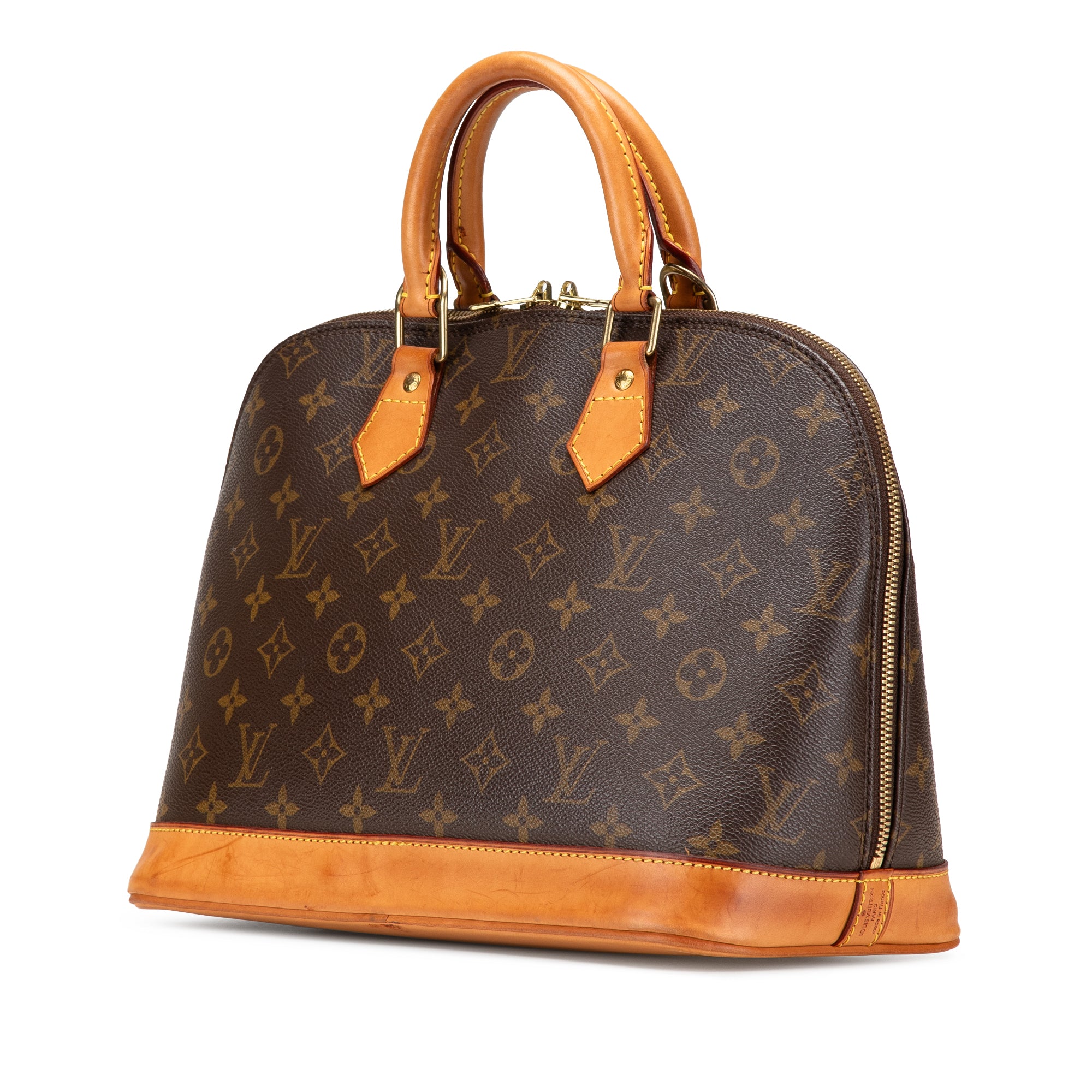 The Alma PM features a monogram canvas body with vachetta leather trim, rolled vachetta leather handles, a top zip closure, and an interior slip pocket. Retail Price: 1617.00