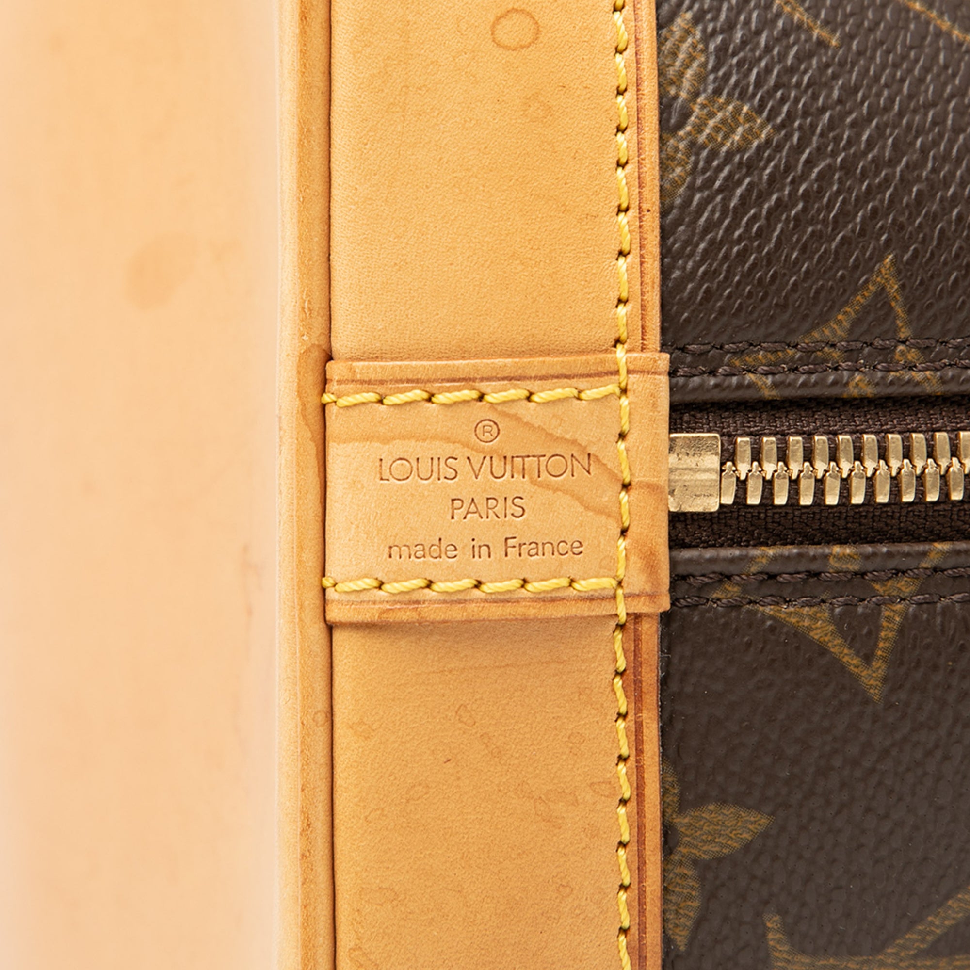 The Monogram Alma PM features a monogram canvas body, rolled vachetta leather handles, a vachetta leather bottom, a top zip closure, and an interior slip pocket. Retail Price: 1579.00