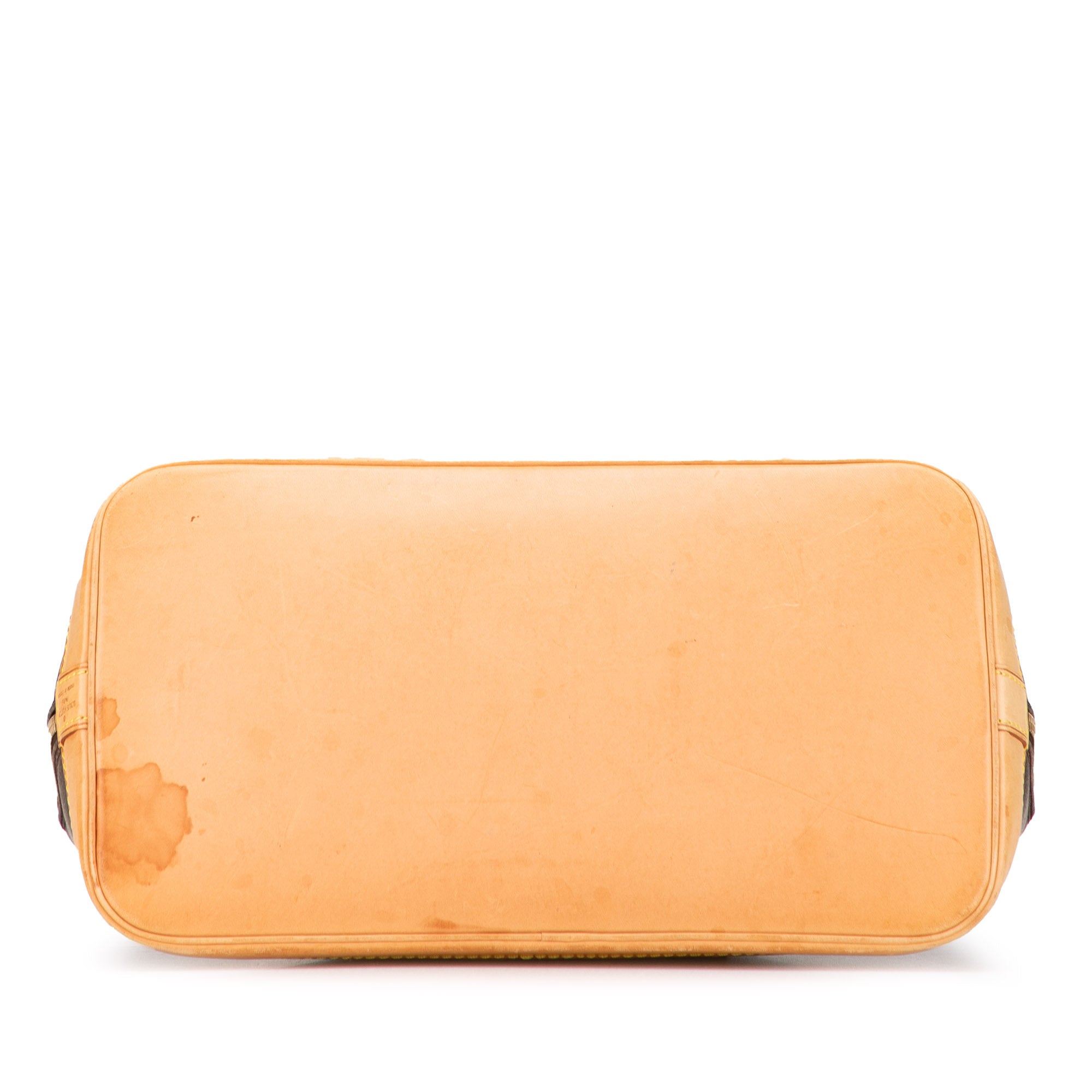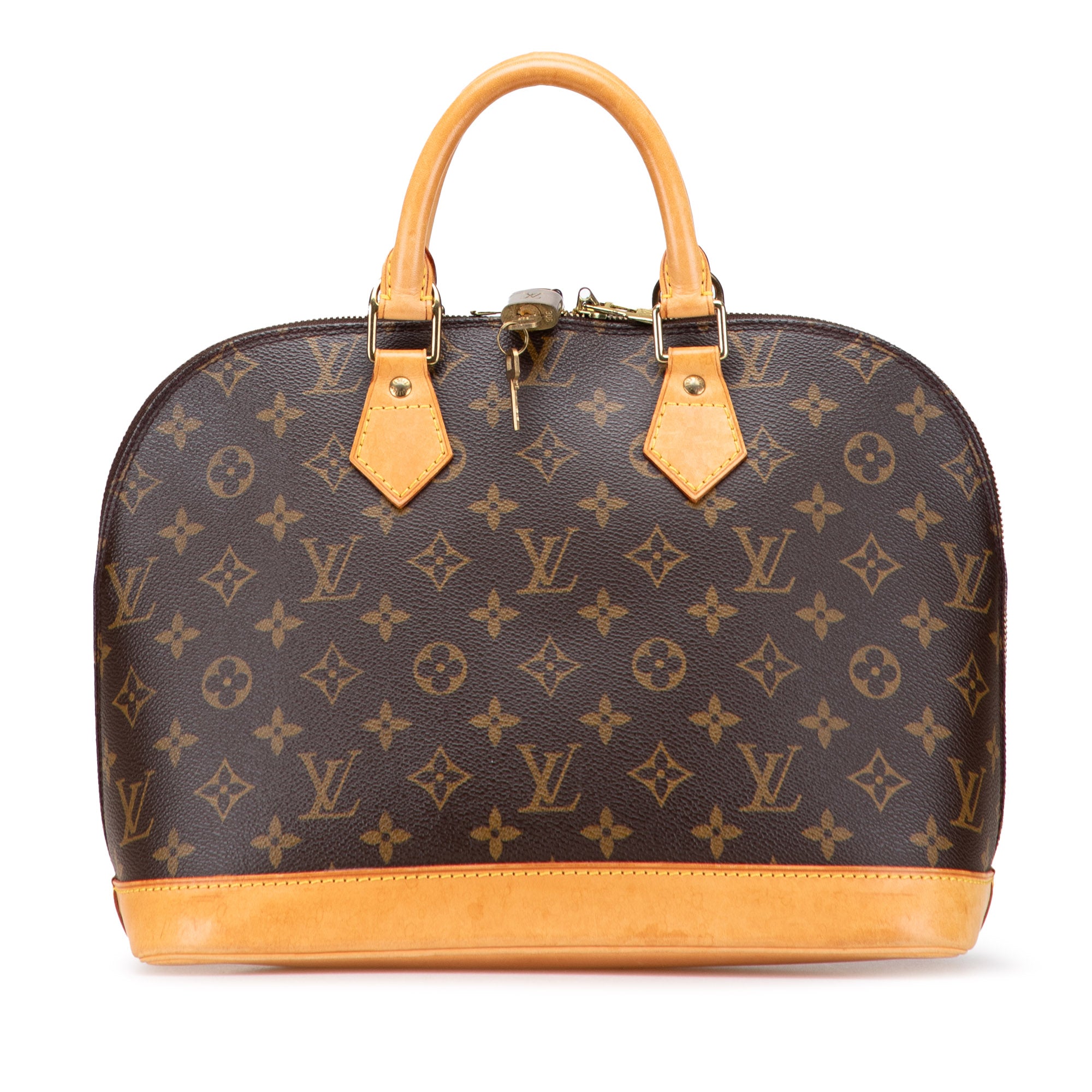 The Alma PM features a monogram canvas body with vachetta leather trim, rolled vachetta leather top handles, a top zip closure, and interior slip pockets. Retail Price: 1579.00