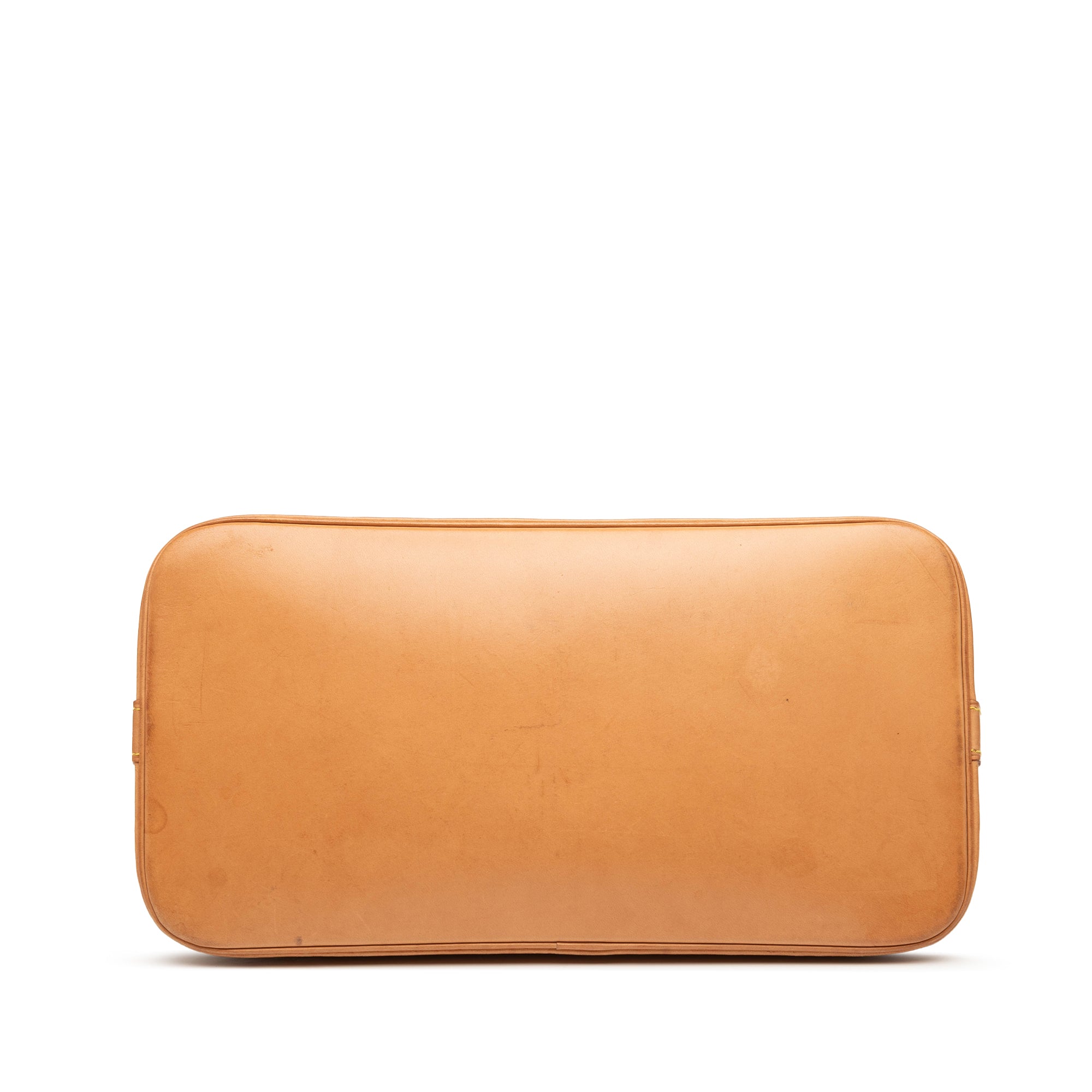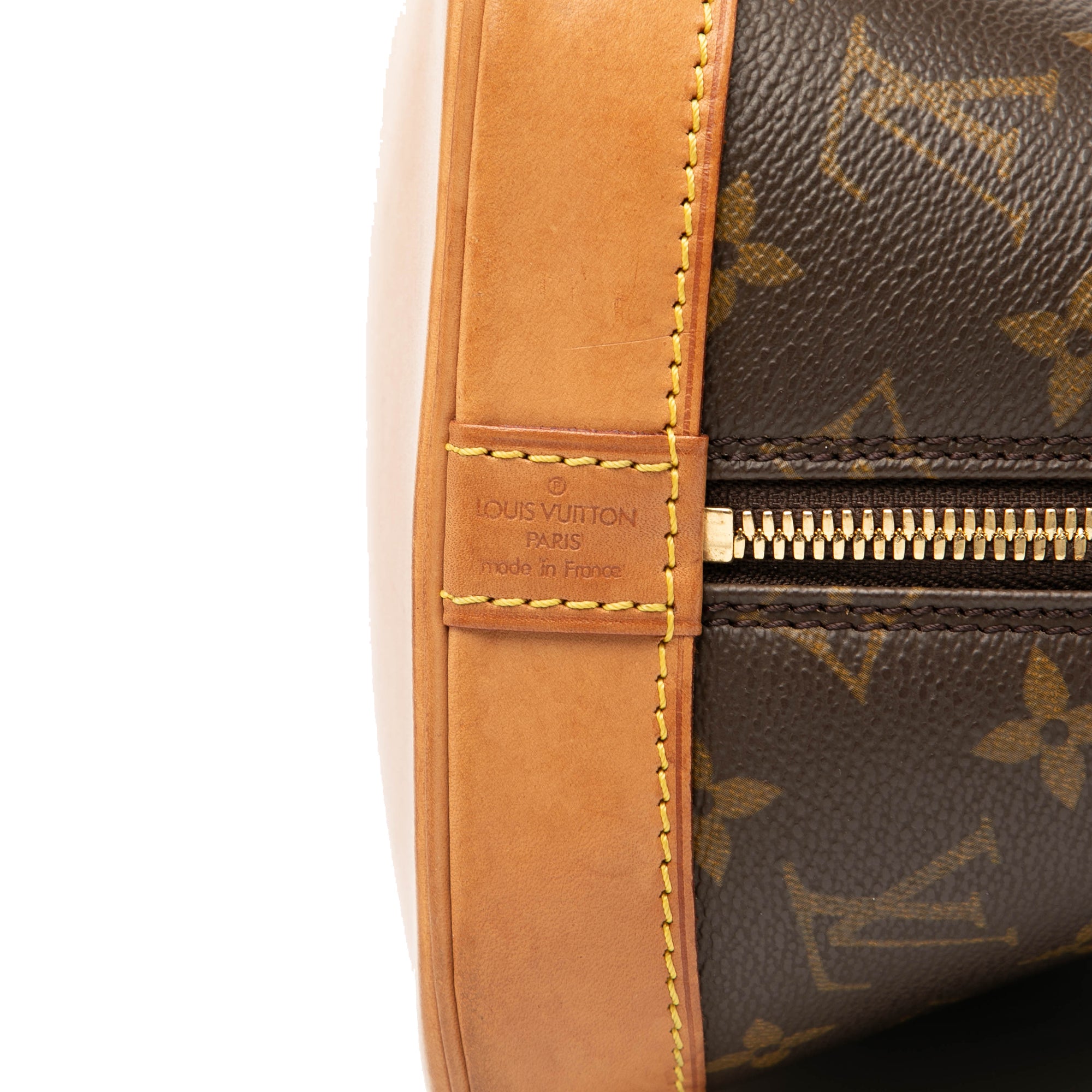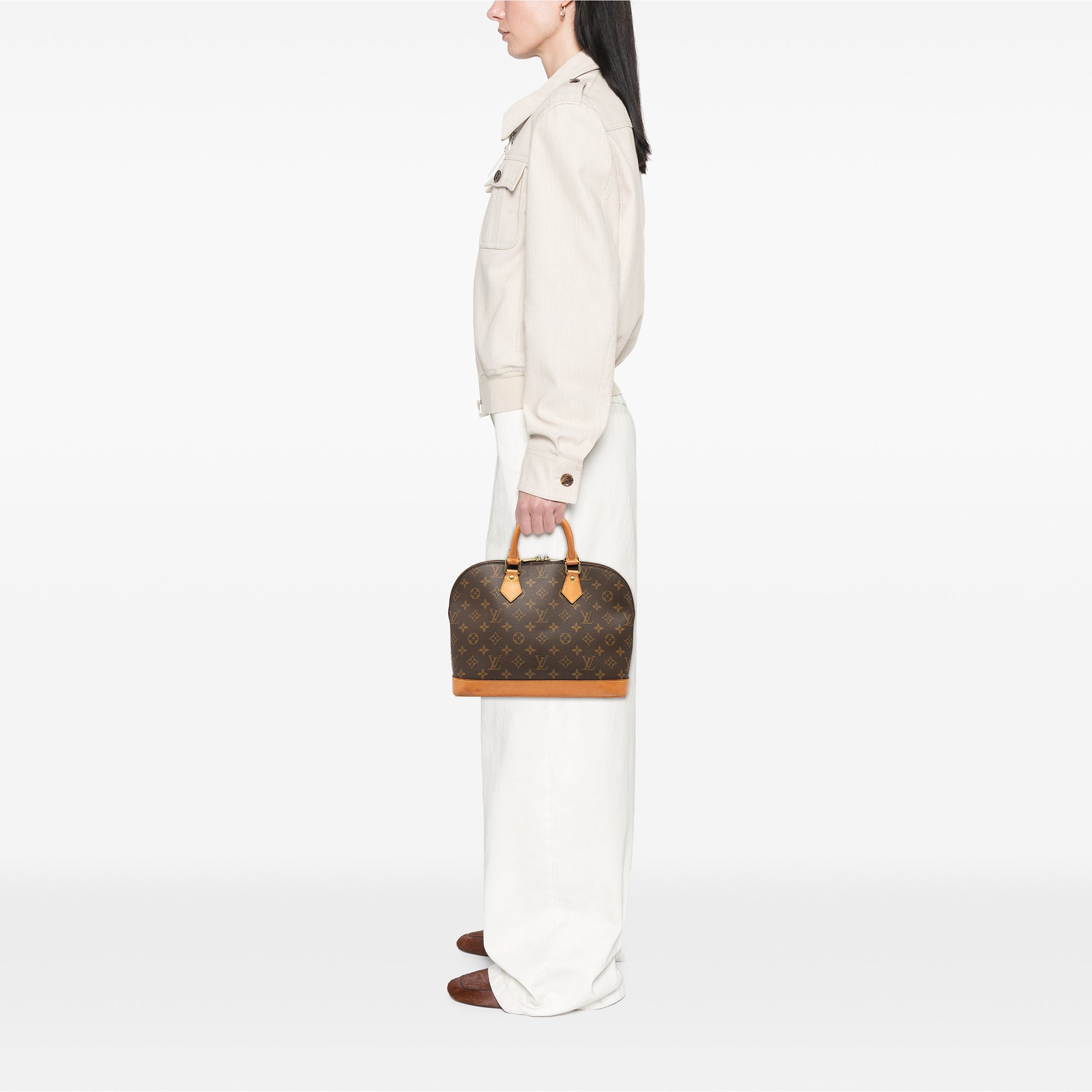 The Alma PM features a monogram canvas body with vachetta leather trim, rolled vachetta leather handles, a top zip closure, and an interior slip pocket. Retail Price: 1579.00
