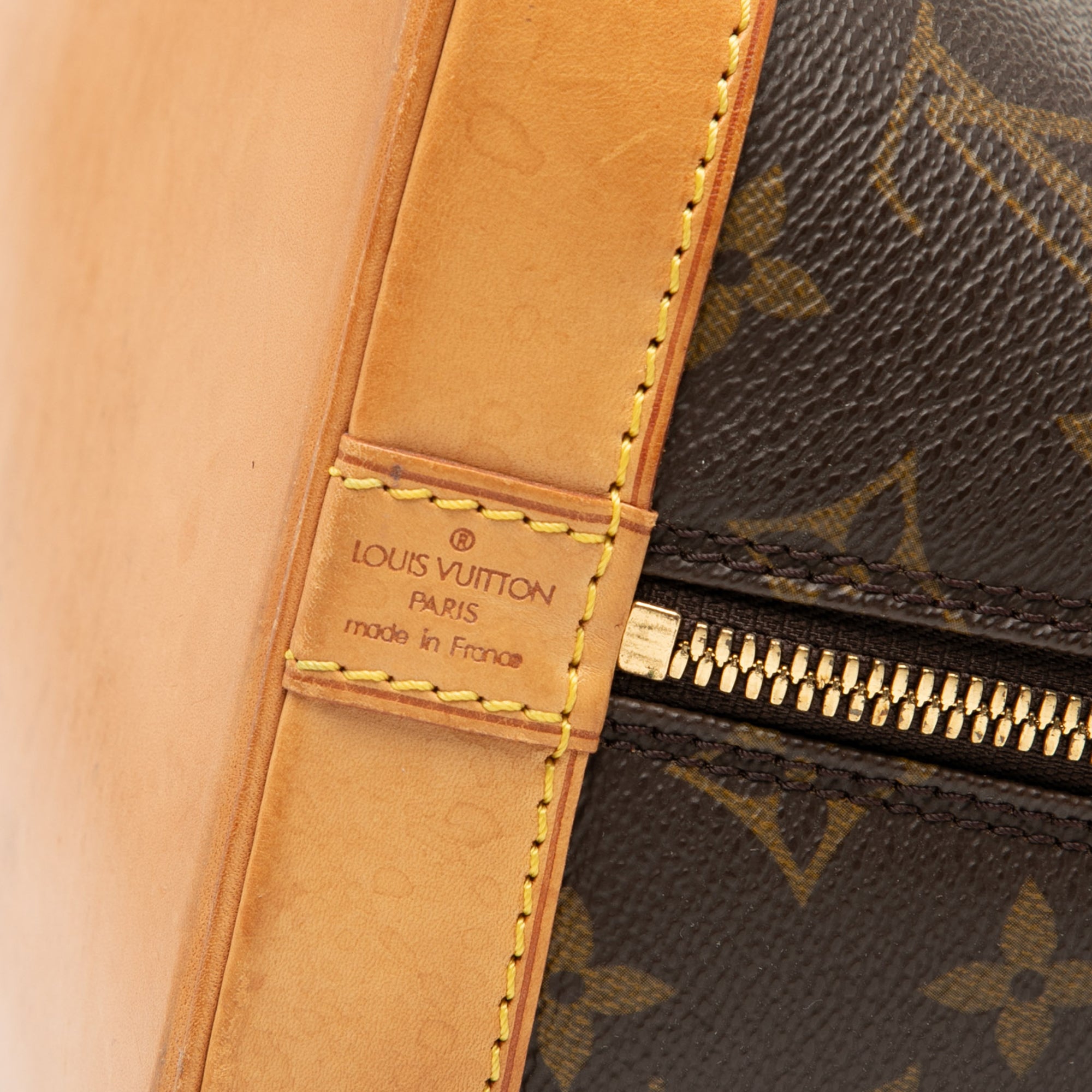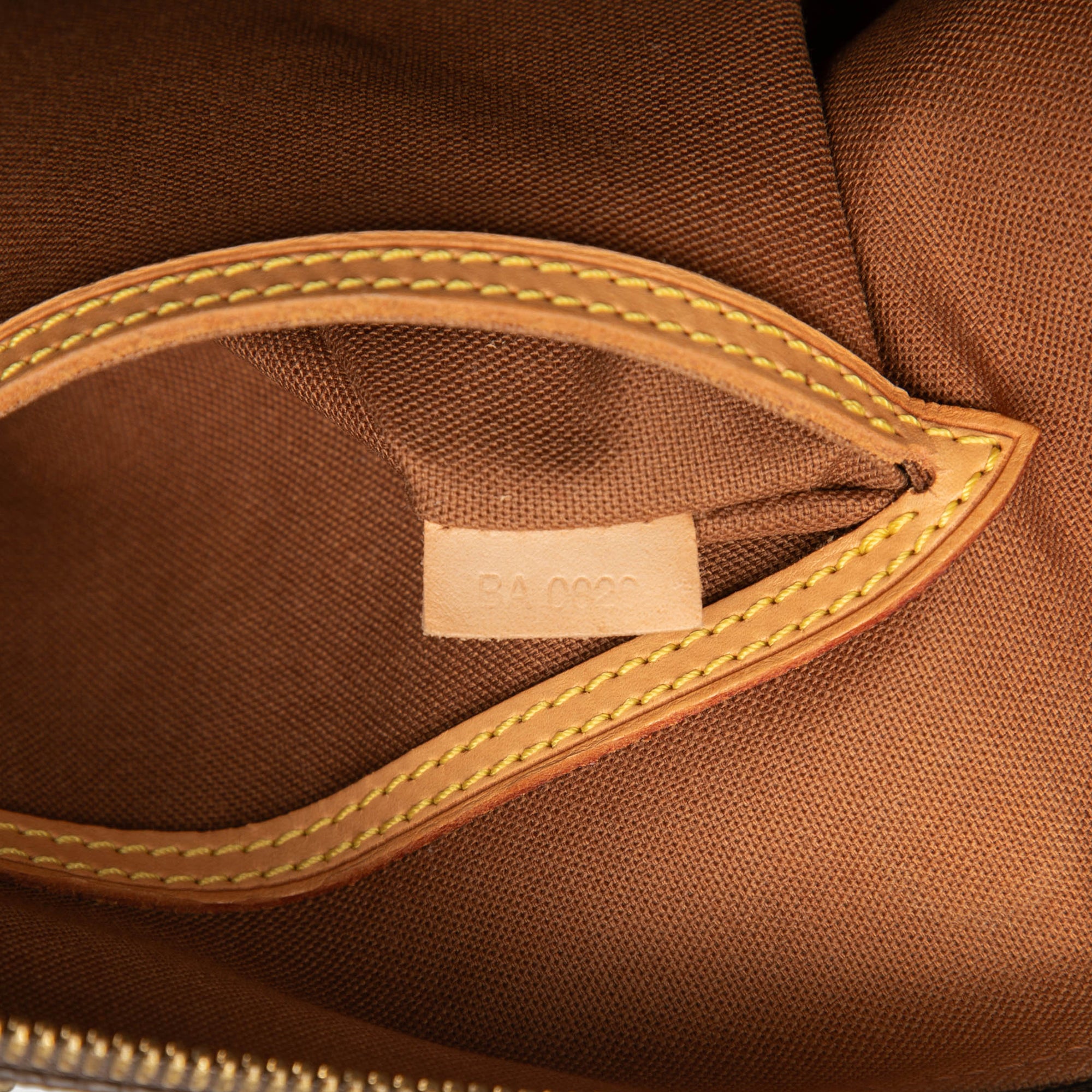 The Alma PM features a monogram canvas body with vachetta leather trim, rolled vachetta leather handles, a top zip closure, and an interior slip pocket. Retail Price: 1579.00