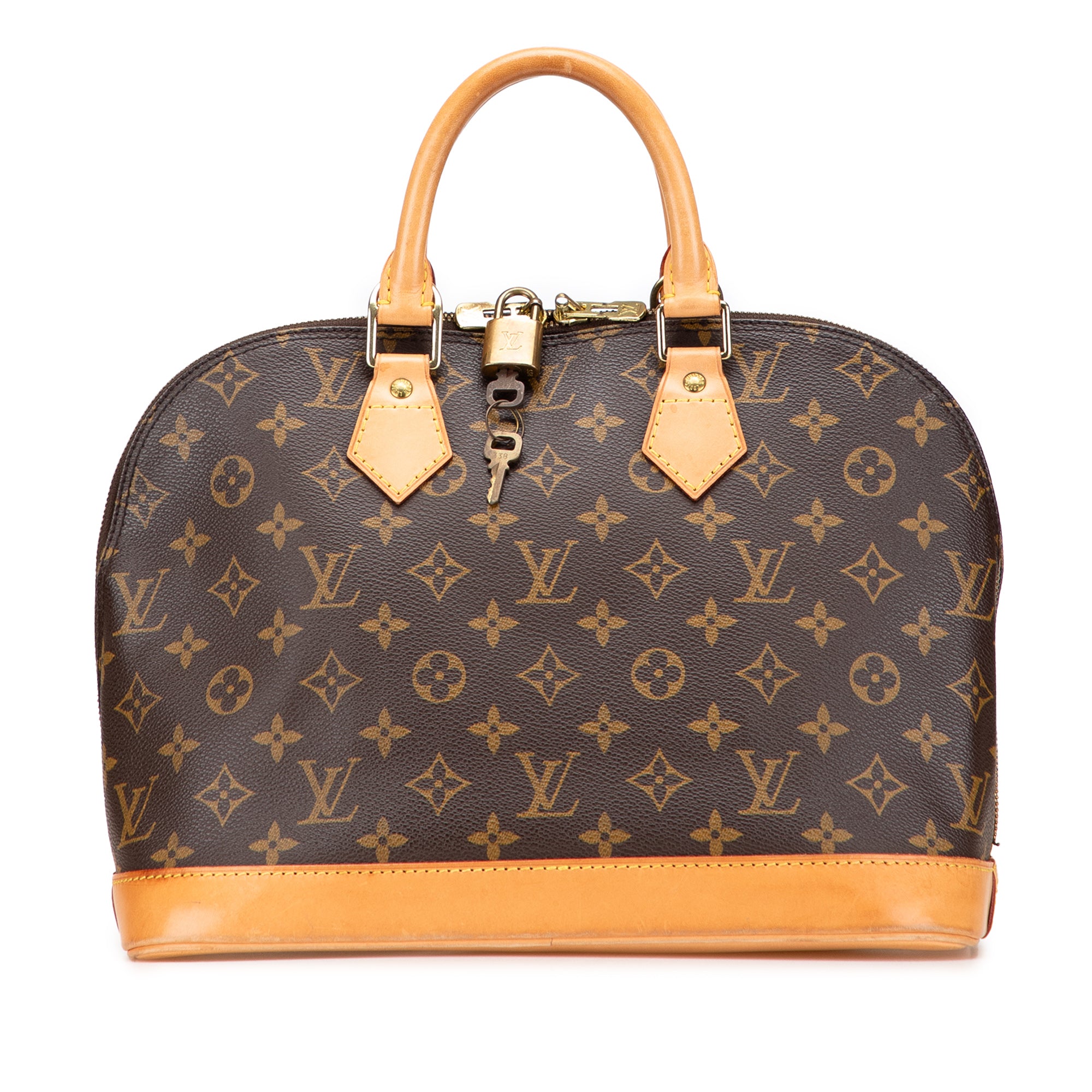 The Alma PM features a monogram canvas body with vachetta leather trim, rolled vachetta leather handles, a top zip closure, and an interior slip pocket. Retail Price: 1579.00