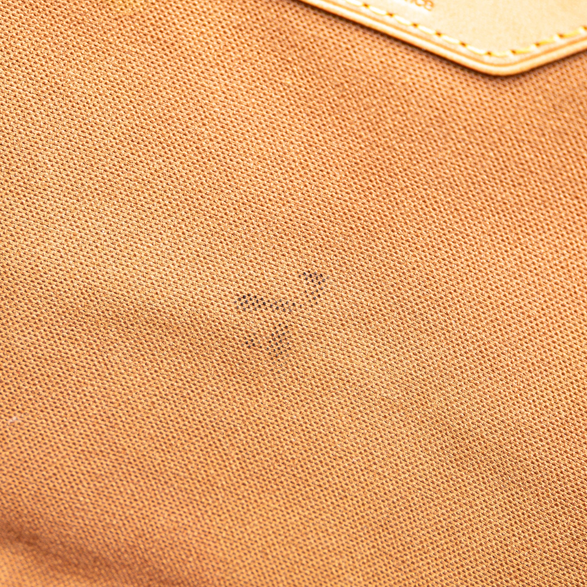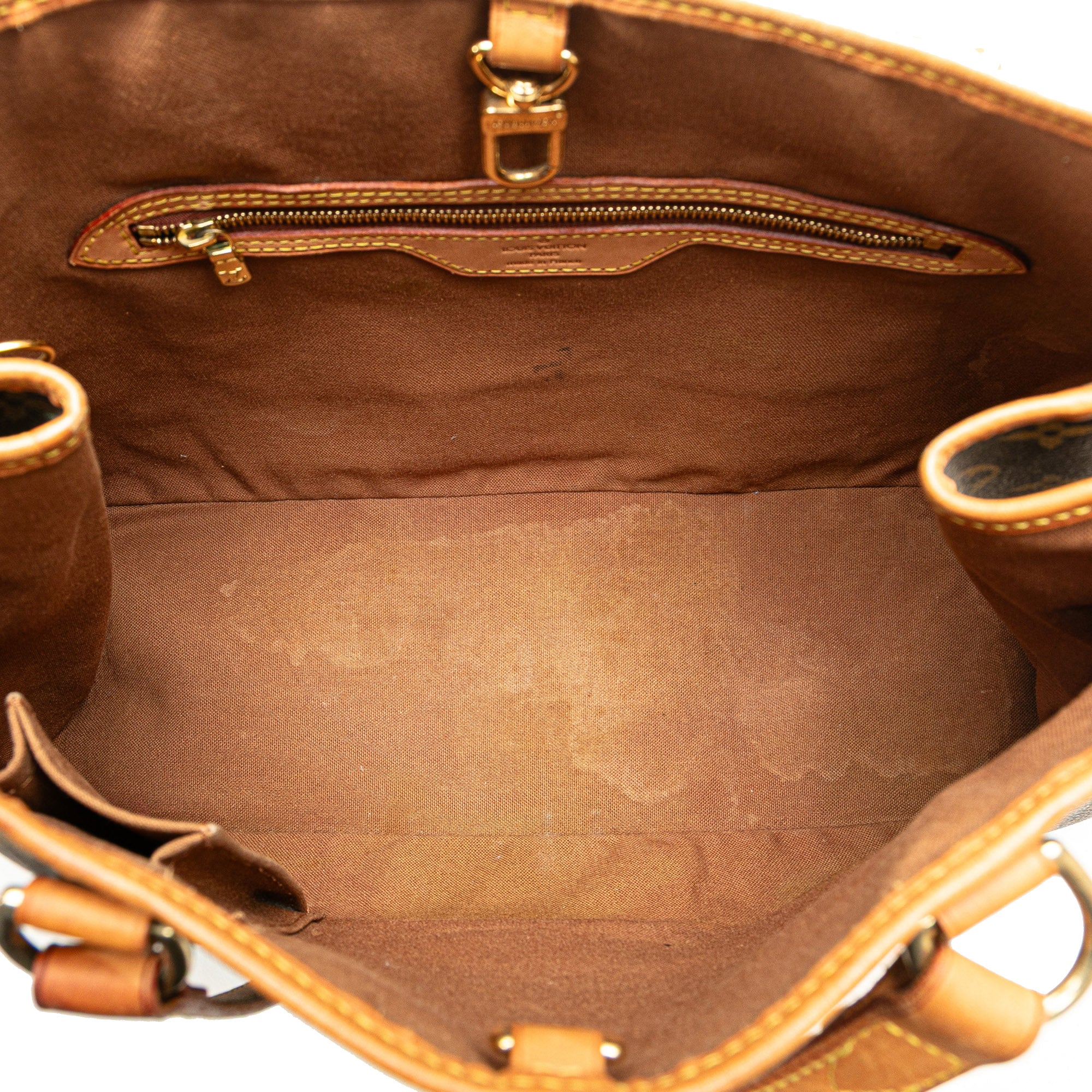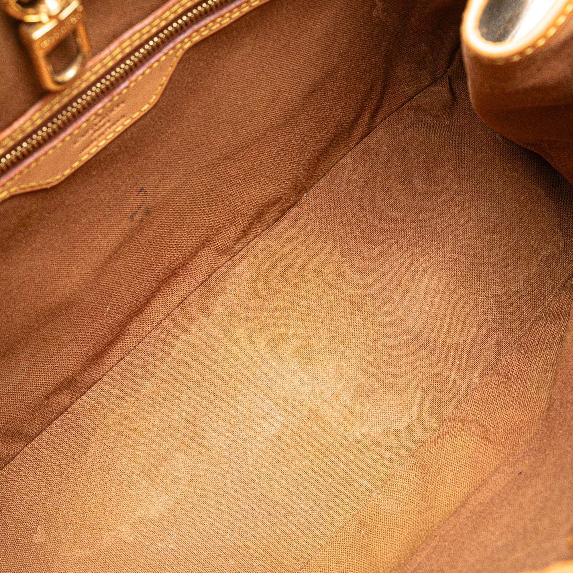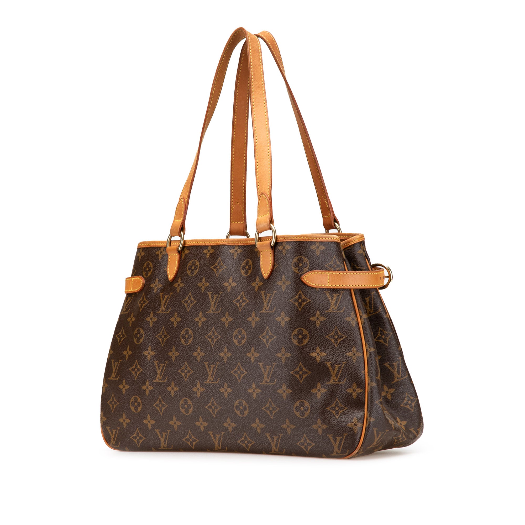 The Batignolles Horizontal features a monogram canvas body with vachetta leather trim, flat vachetta leather shoulder straps, an open top with a lobster claw clasp closure, and interior zip and slip pockets. Retail Price: 1159.00
