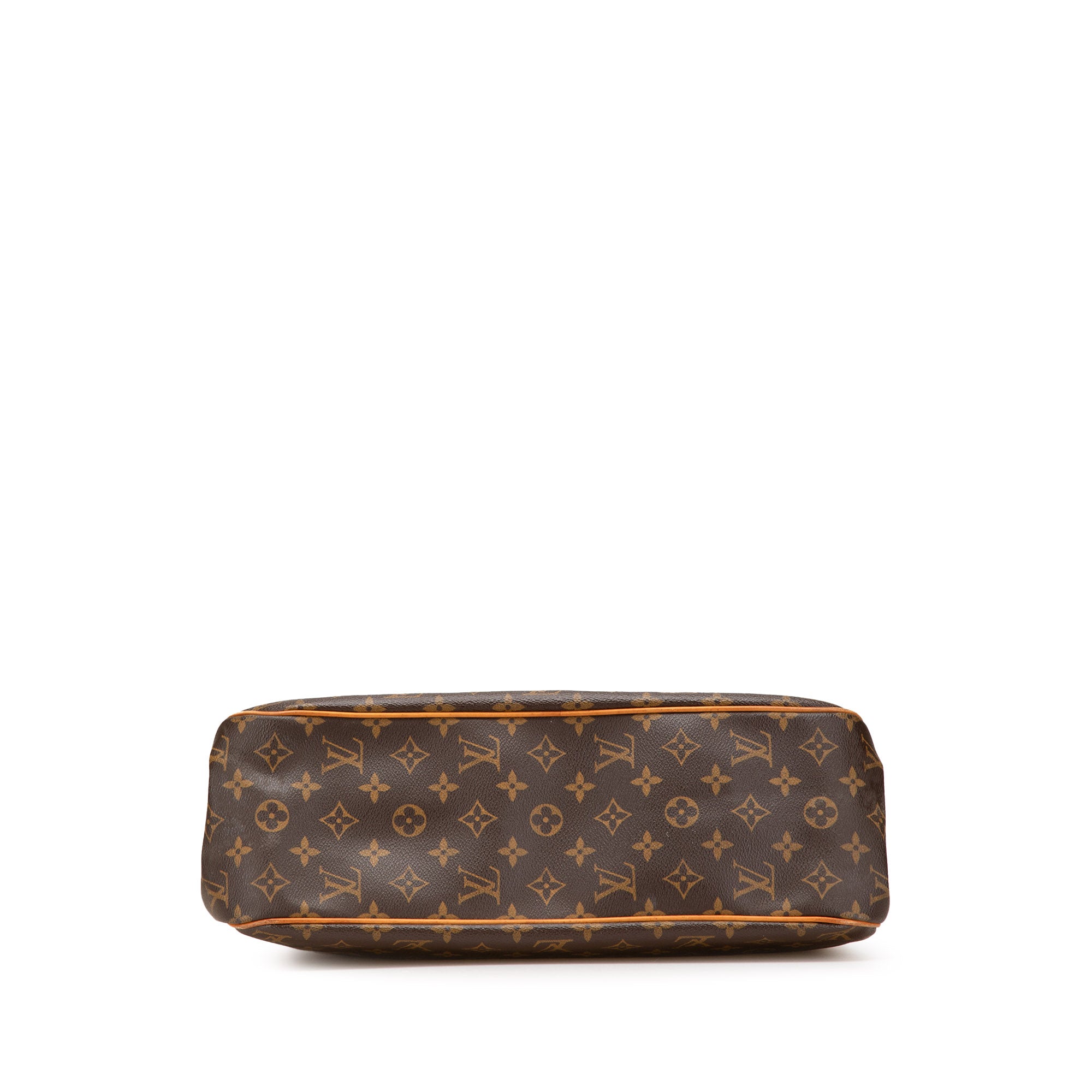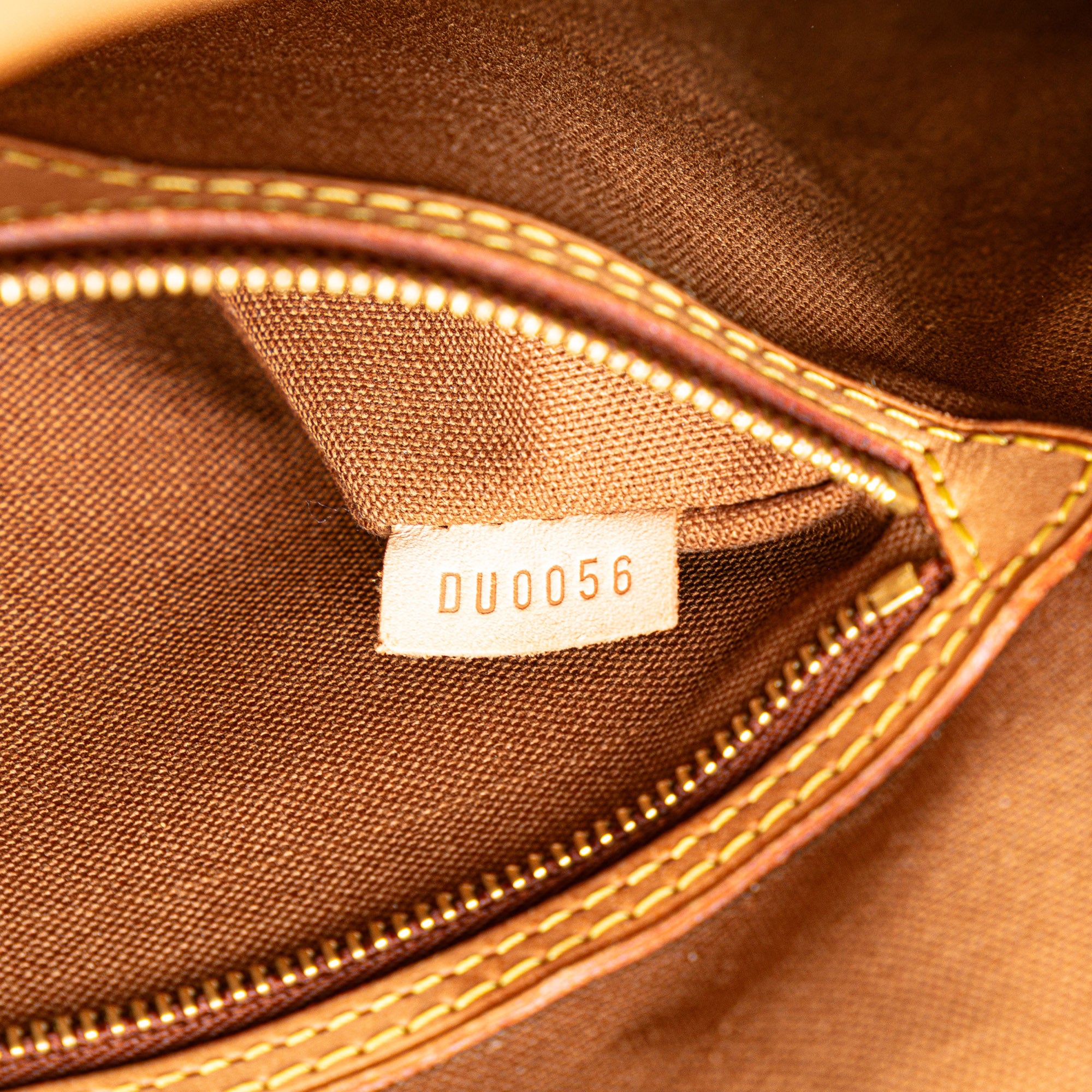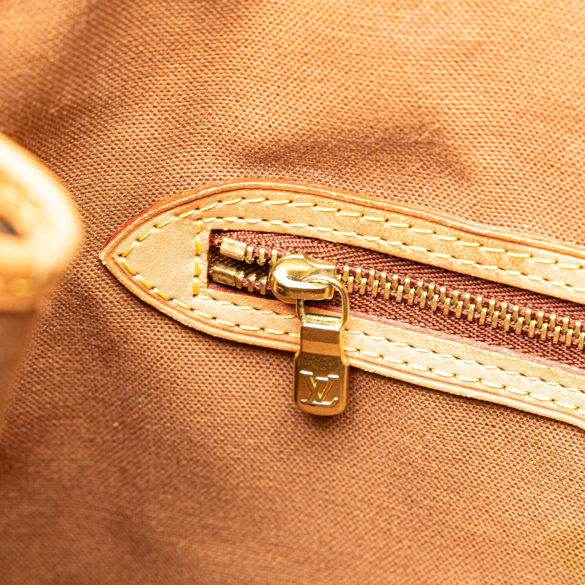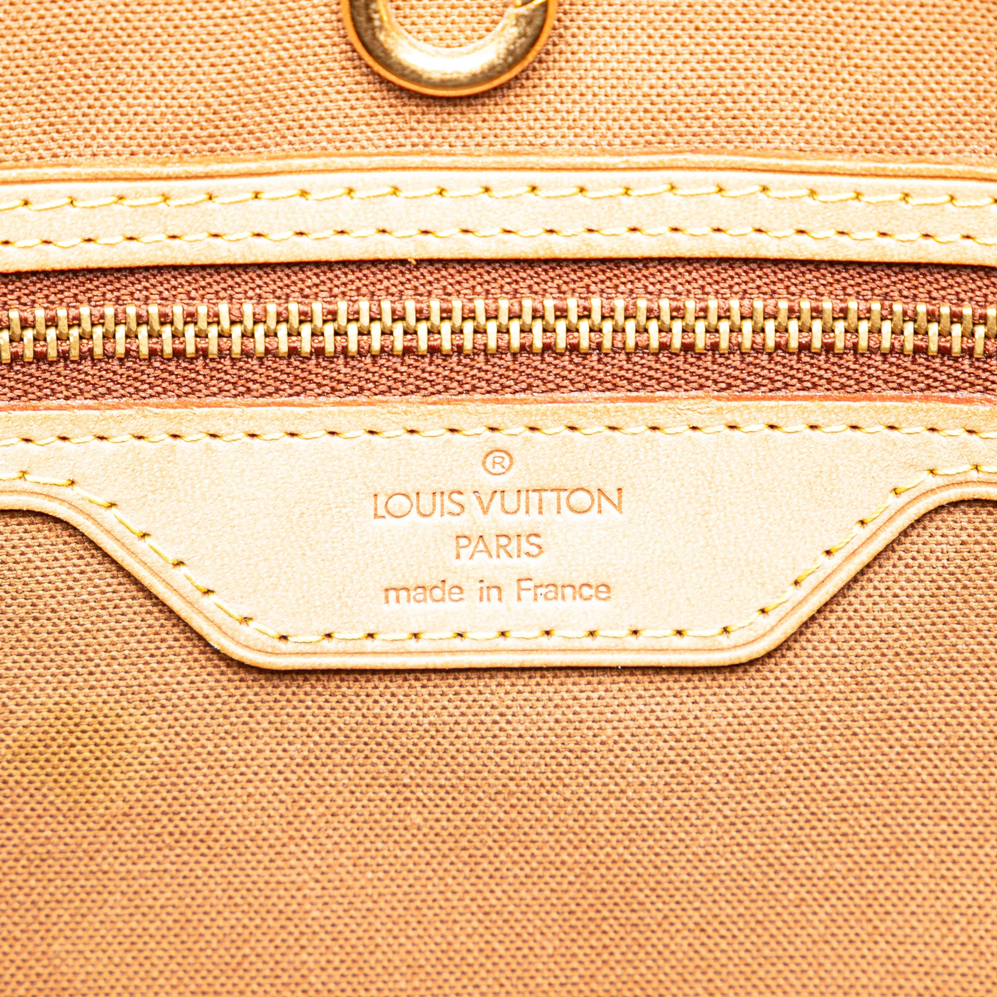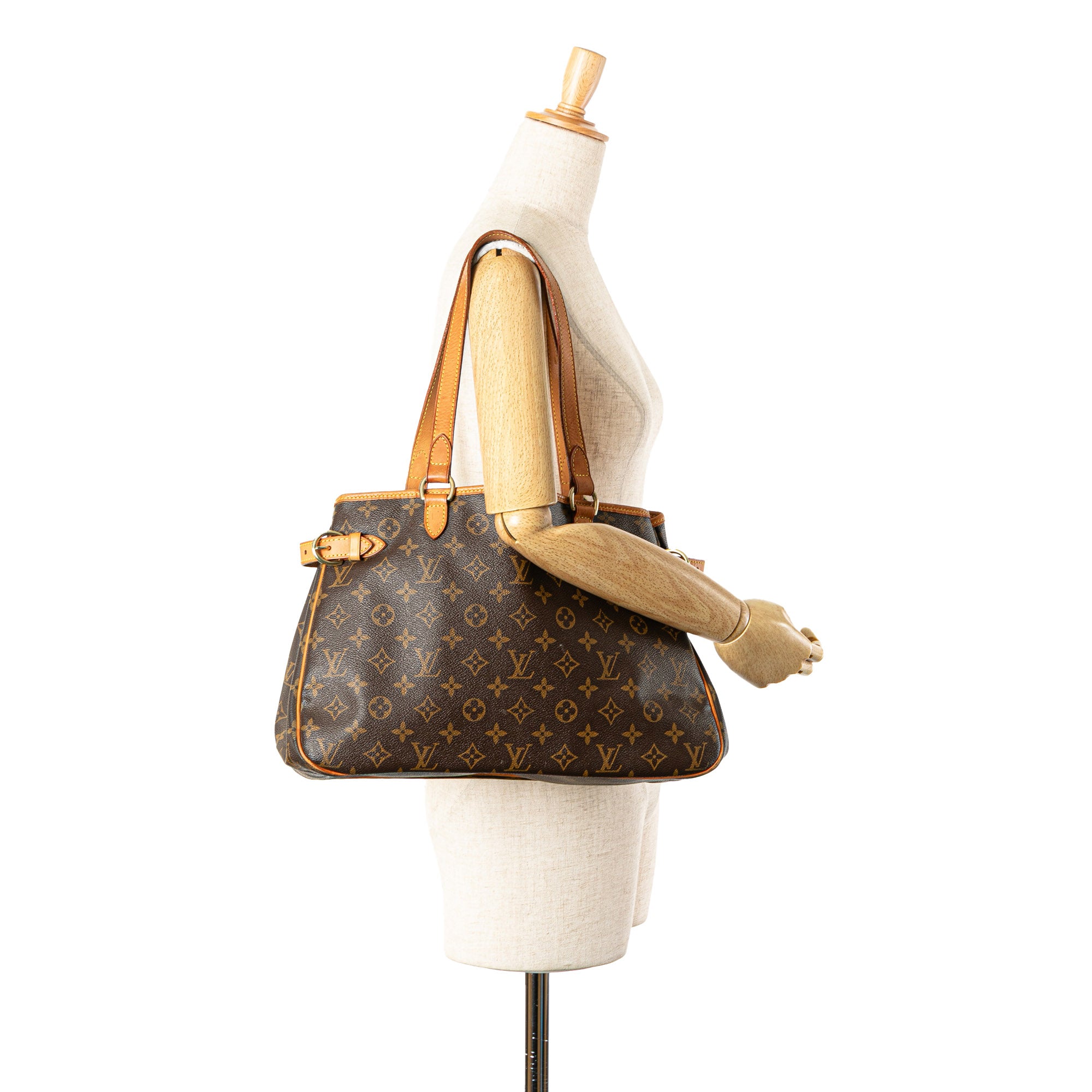 The Batignolles Horizontal features a monogram canvas body with vachetta leather trim, flat vachetta leather shoulder straps, an open top with a lobster claw clasp closure, and interior zip and slip pockets. Retail Price: 1159.00