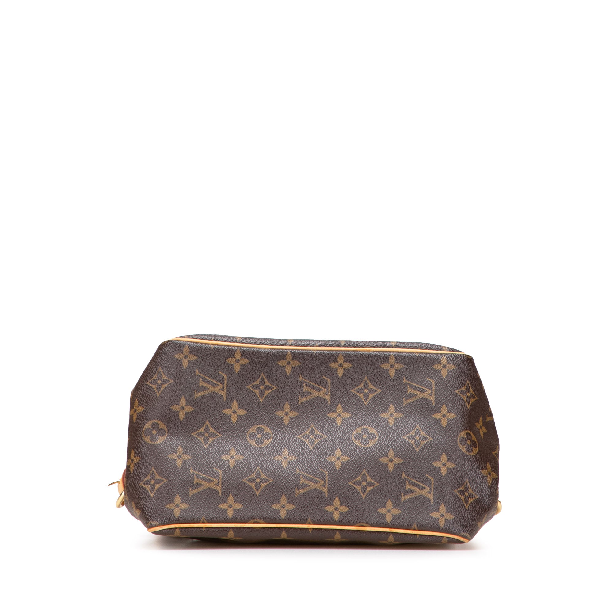 The Batignolles Vertical PM features a monogram canvas body with vachetta leather trim, flat vachetta leather handles, an open top, and interior slip pockets. Retail Price: 1150.00