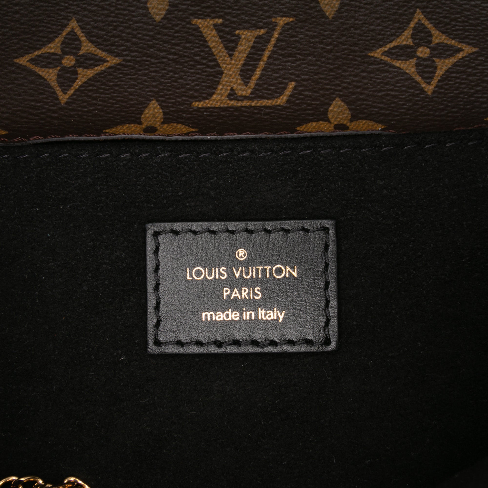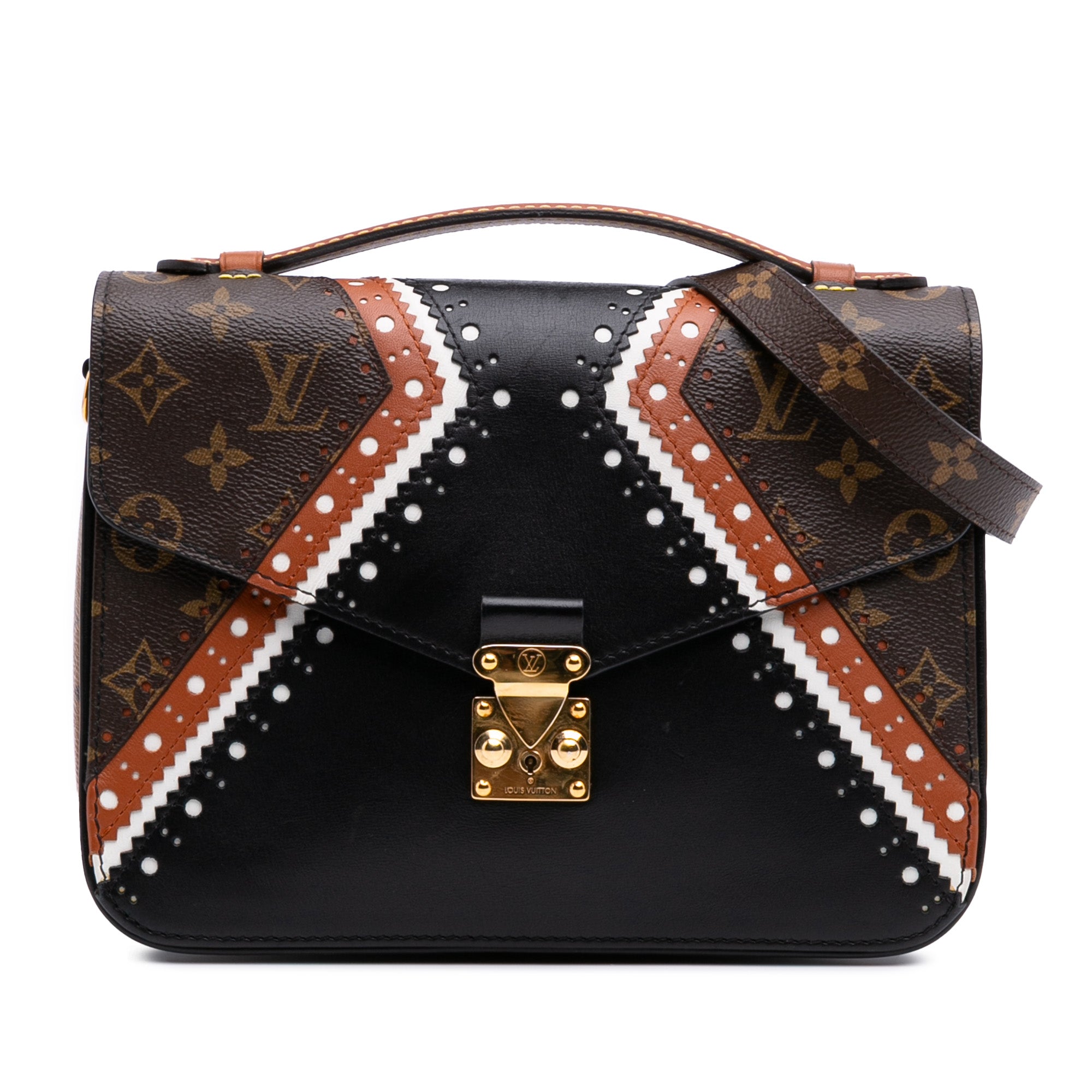 The Pochette Metis features a monogram canvas body with calfskin leather trim, a flat vachetta leather top handle, a detachable flat shoulder strap, a front flap with an S-lock closure, an exterior zip pocket, and interior slip pockets. Retail Price: 2400.00