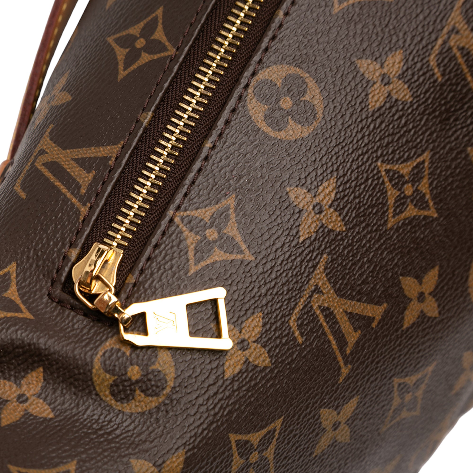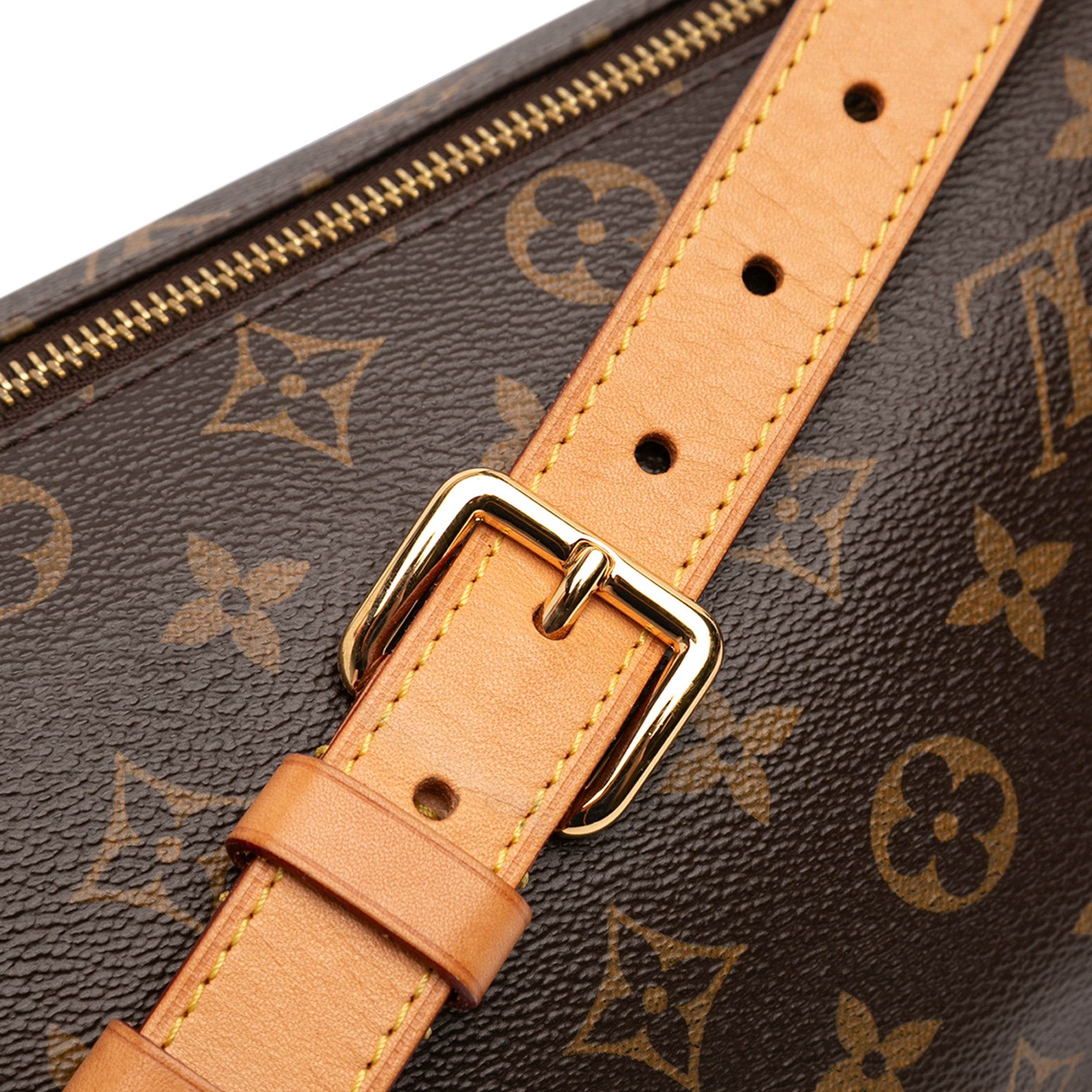 This belt bag features a monogram canvas body, a flat adjustable vachetta leather waist strap, a flat vachetta leather top handle, a front zip closure, and an exterior back zip pocket. Inclusion: Dust bag. Retail Price: 4000.00