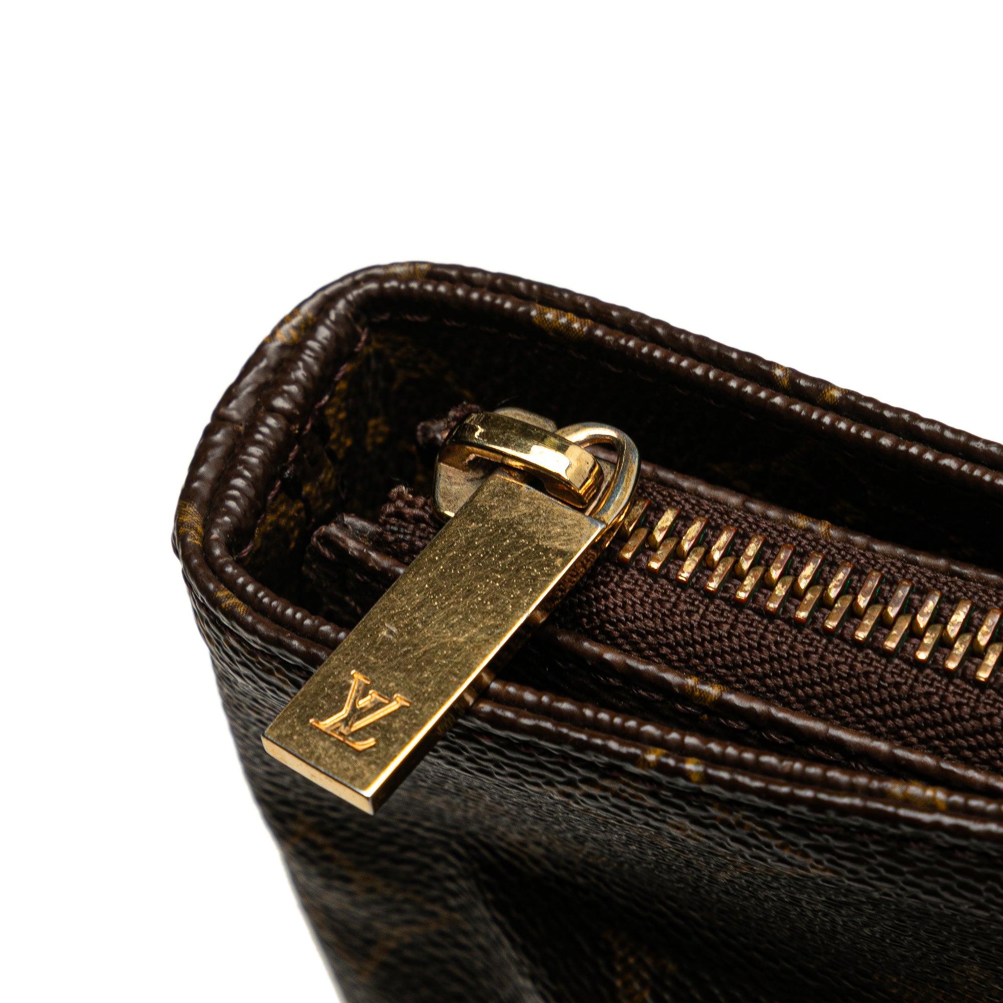 The Cabas Piano features a monogram canvas body with vachetta leather trim, flat vachetta leather handles, a top zip closure, and interior zip and slip pockets. Retail Price: 1035.00