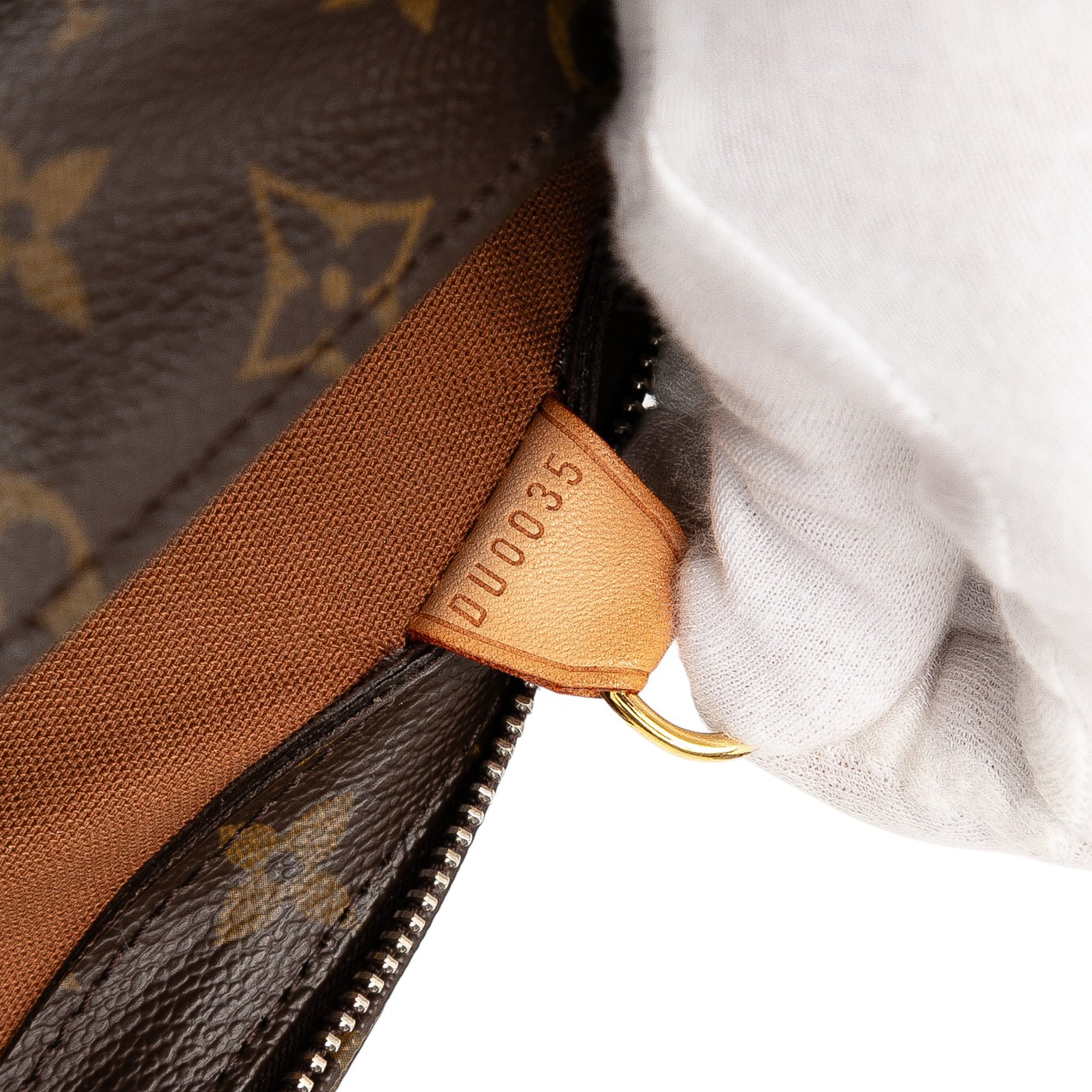 The Cabas Piano features a monogram canvas body, flat vachetta leather handles, a top zip closure, and an interior slip pocket. Retail Price: 1035.00
